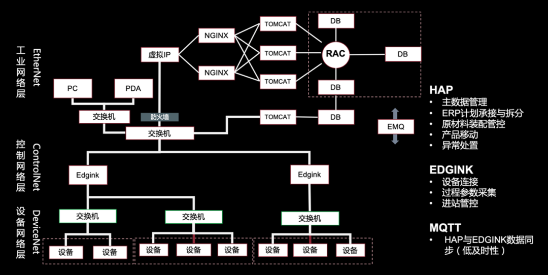 下图展示的是服务器结构和网络架构,主要包括三层,在设备和MES之间增加了一个中间层用于二者之间的交互。现场设备主要包括两种交互模式模式。第一种模式下设备支持网络协议,利用自身上位机软件调用MES开放的WebService接口实现交互。第二种模式下设备不具备接口调用能力,这时需要引入Edgink(汉得自研的设备联网软件)读写设备的PLC地址数据,在此基础上借助Edgink实现本地的逻辑控制以及和MES的交互。