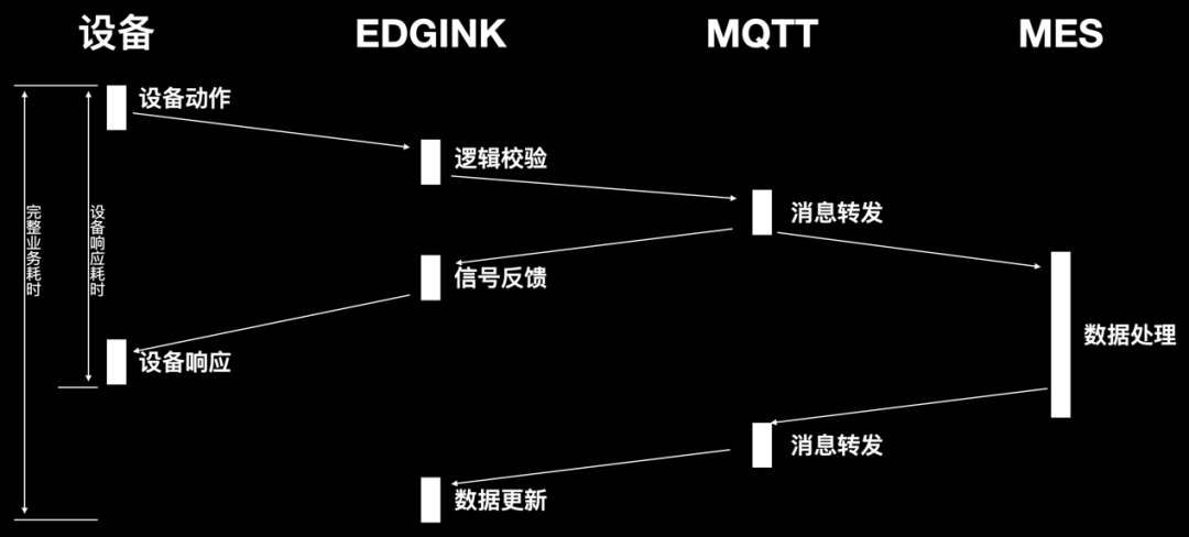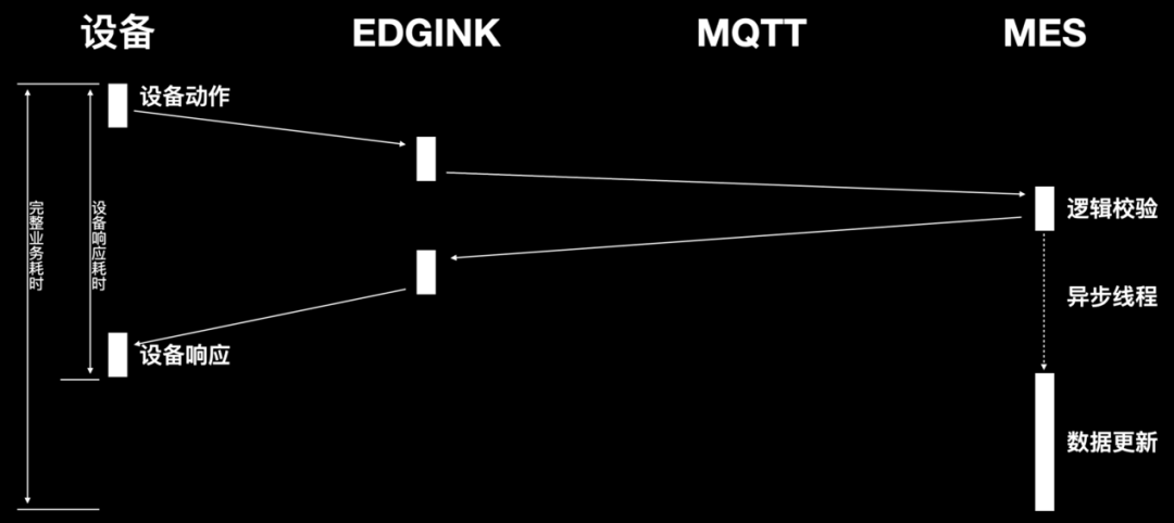 MES处理完成的数据反馈至Edgink超时了,上道工序的完工信息未及时反馈至Edgink导致产品入站下一道工序时无法校验通过。于是我们不得不对方案做调整,尝试将业务逻辑校验完全放在MES。设备端调用Edgink接口,Edgink不做任何处理直接调用MES接口进行逻辑校验,完成后启动异步线程进行数据处理。彻底消除了系统间交互所用的耗时。