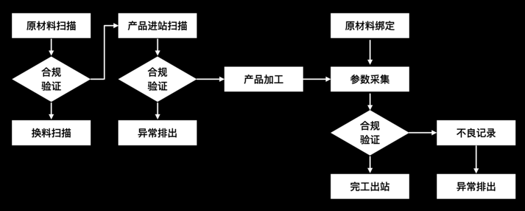 一旦打通了MES和设备的交互,就可以实现产品加工过程中的数据采集和过程控制。产品加工过程常规的控制流程如下图所示。原材料上料时调用MES接口进行原材料合规验证,如保质期、BOM匹配、参数特性等。验证通过后产品方可进站。每道工序进站时需要进行工序合规的判定,验证不通过则通过设备NG槽排出。验证通过设备开始进行加工,此时设备调用MES接口进行原材料装配关系绑定,过程中也会将产品或者设备参数,如产品的电压、内阻或者设备的温度、转速等通过接口发送至MES进行合规性验证,如上下限超标校验。如果出现不良在出站时将被排出进行相应处置。加工完成后设备调用MES接口进行出站记录。