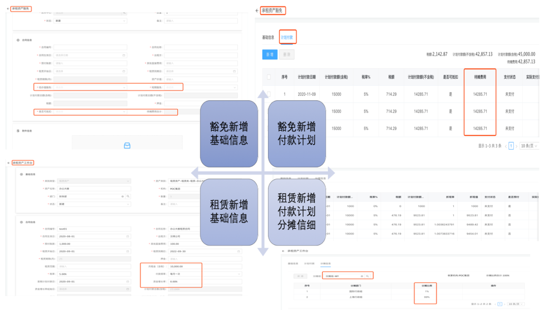 另外,将豁免和非豁免分开处理,设置租赁新增录入和豁免录入界面,输入关键合同信息,新增审批通过后,就可以实现相关资产新增核算处理,数据清晰可视,系统界面如下: