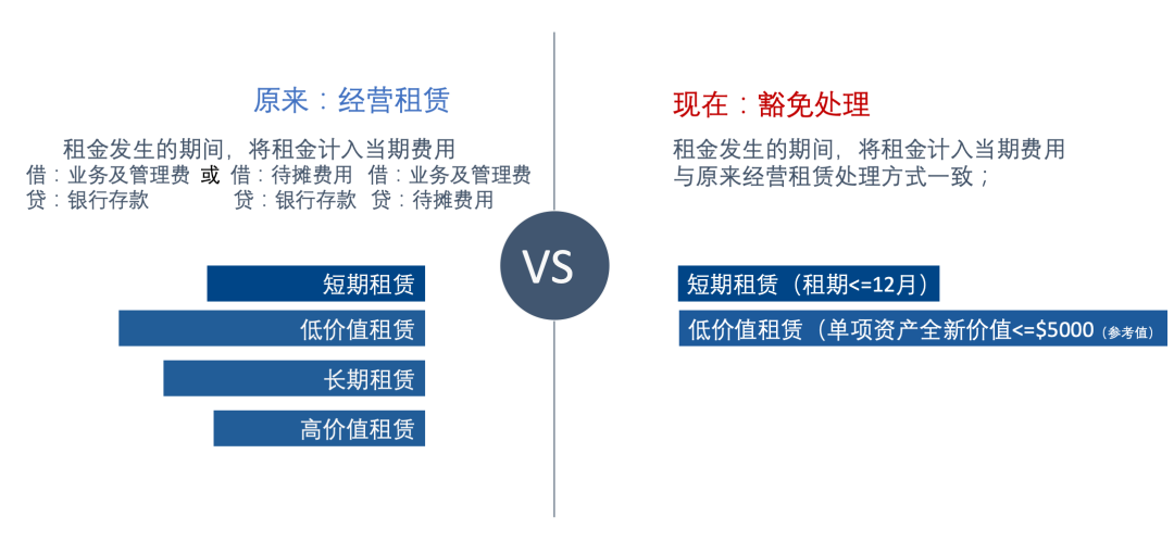 新准则第三十二条规定: 对于短期租赁和低价值资产租赁,承租人可以选择不确认使用权资产和租赁负债。即,继续沿用以前经营租赁的处理办法,各期费用化。