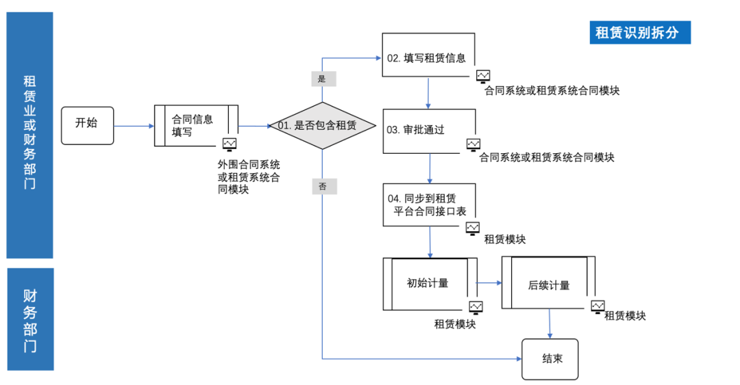 合同通常由业务部门签订,业务人员或财务人员录入系统,租赁识别的主要过程如下: