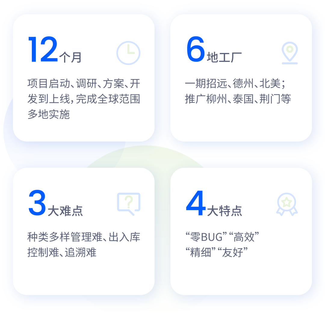 实施范围涵盖国内外6家工厂,共80多个仓库,仓库类型包括普通仓库、全自动化立体仓库;物料种类多达600余种,管理模式多样;业务类型包含生产、采购、销售、组织间调拨等;