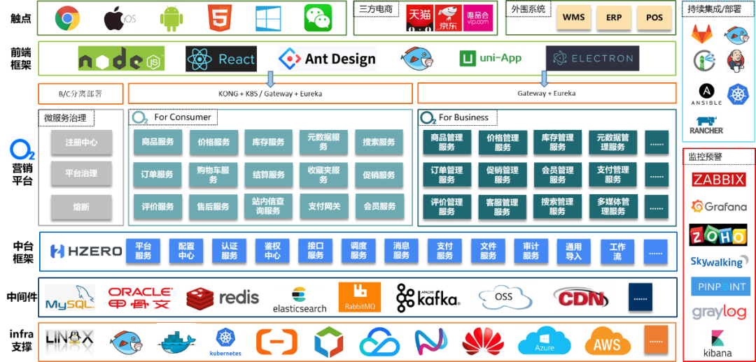 基于HZero框架和O2产品,为客户提供底层技术框架革新,全面实现电商中台重构,全方位提升系统性能指标,达到现有业务峰值的10倍,满足未来3-5年的战略需求