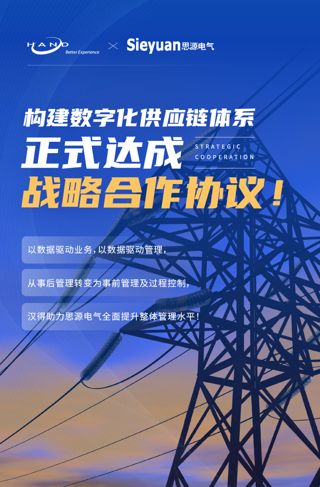 2021年8月27日,思源电气与汉得信息在思源电气上海总部隆重召开思源电气项目启动会暨战略供应商签约仪式,汉得与思源电气经过多年的研讨、商议,正式开启思源电气信息化建设的新篇章!汉得将不遗余力,顺利完成思源电气项目,并将在未来与思源紧密协作,计划在智能制造、供应协同、质量协同逐步帮助思源电气完善IT系统建设,培养优秀人才,为后续的推广及业务优化夯实基础,助力思源未来能够顺利在数字化领域不断突破!汉得作为数字化生态综合服务商,将始终秉承成为连接企业管理与信息技术的桥梁的使命,助力企业实现全面数字化转型,以信息化手段帮助客户提高组织的运营效率、效益与竞争能力,实现客户价值。推荐阅读❖ 欢 迎 分 享 到 朋 友 圈 喔 ❖