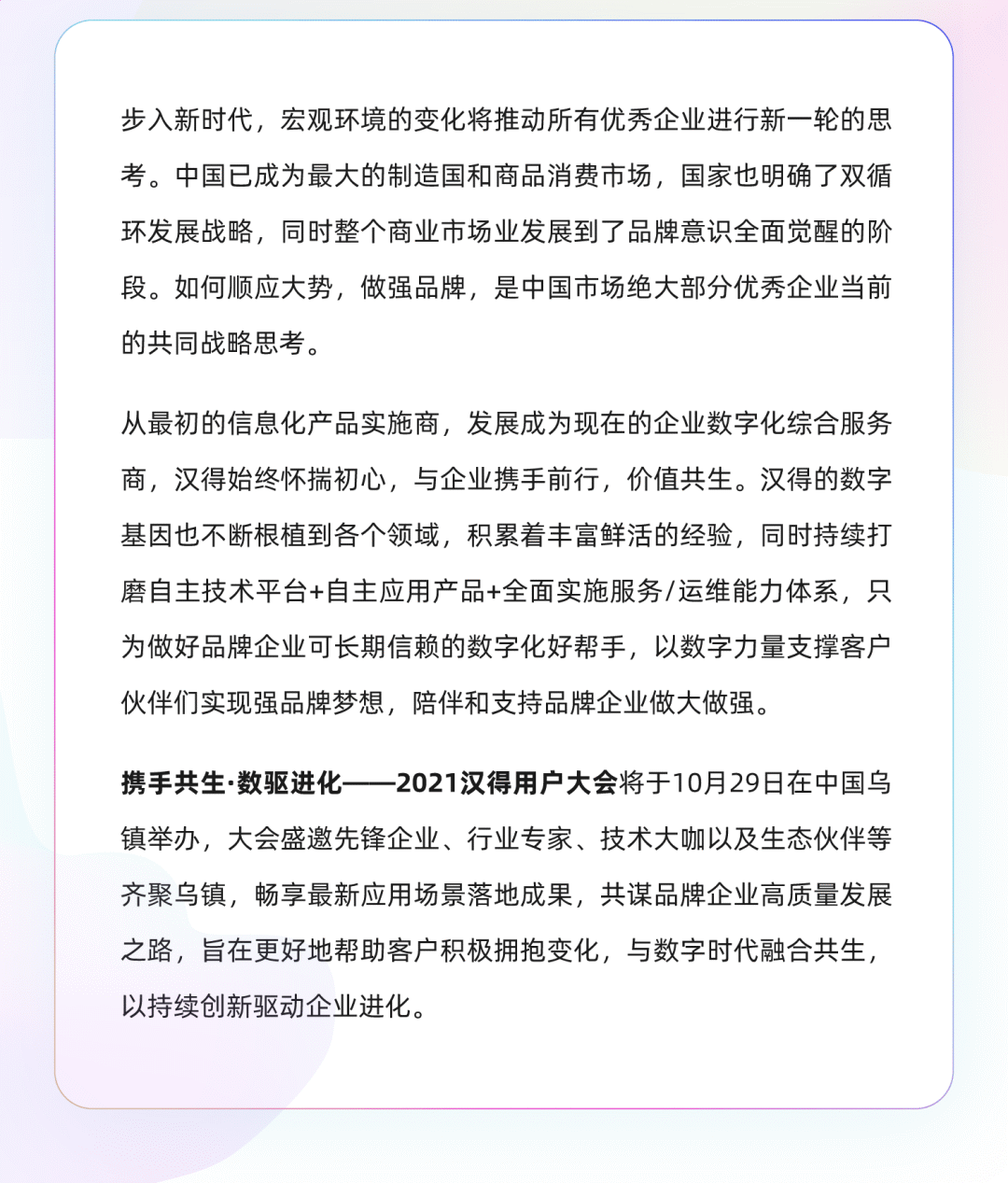 ▲ 横屏观看大会视频新一轮的科技革命正在孕育兴起,企业的品牌意识已全面觉醒。 在暗涌中探索,在突围中变革,不论是被数字化浪潮裹挟,举步维艰,还是积极拥抱变化,与数字时代共生。 这场变局,需要破茧,羽化成蝶,必定斑斓。 这,正是汉得的使命所在——为企业升级,持续注入创新之力。将数字价值,融入高质量发展之中。助中国品牌,加速迈向鼎盛之时。品牌进化,无惧与变同行,顺势而为,携手共生共赢!推荐阅读❖ 欢 迎 分 享 到 朋 友 圈 喔 ❖
