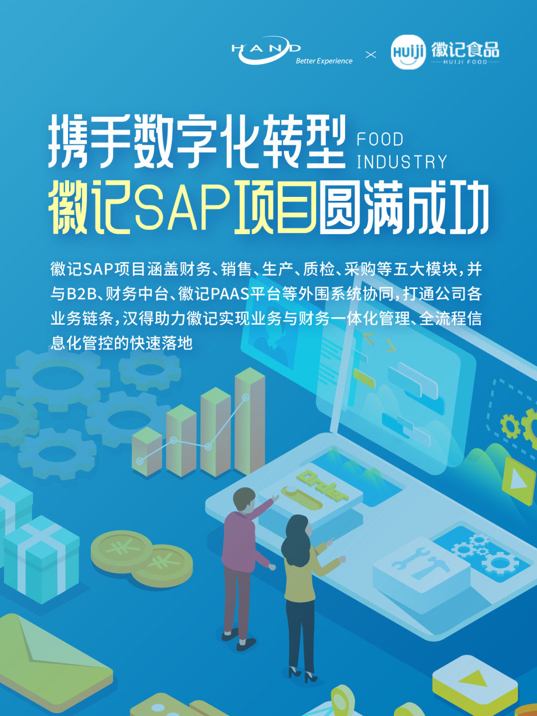 本次徽记食品SAP项目涵盖财务、销售、生产、质检、采购等五大模块,并与B2B、财务中台、徽记PAAS平台等外围系统协同,打通公司各业务链条,实现业务与财务一体化管理、全流程信息化管控的快速落地。