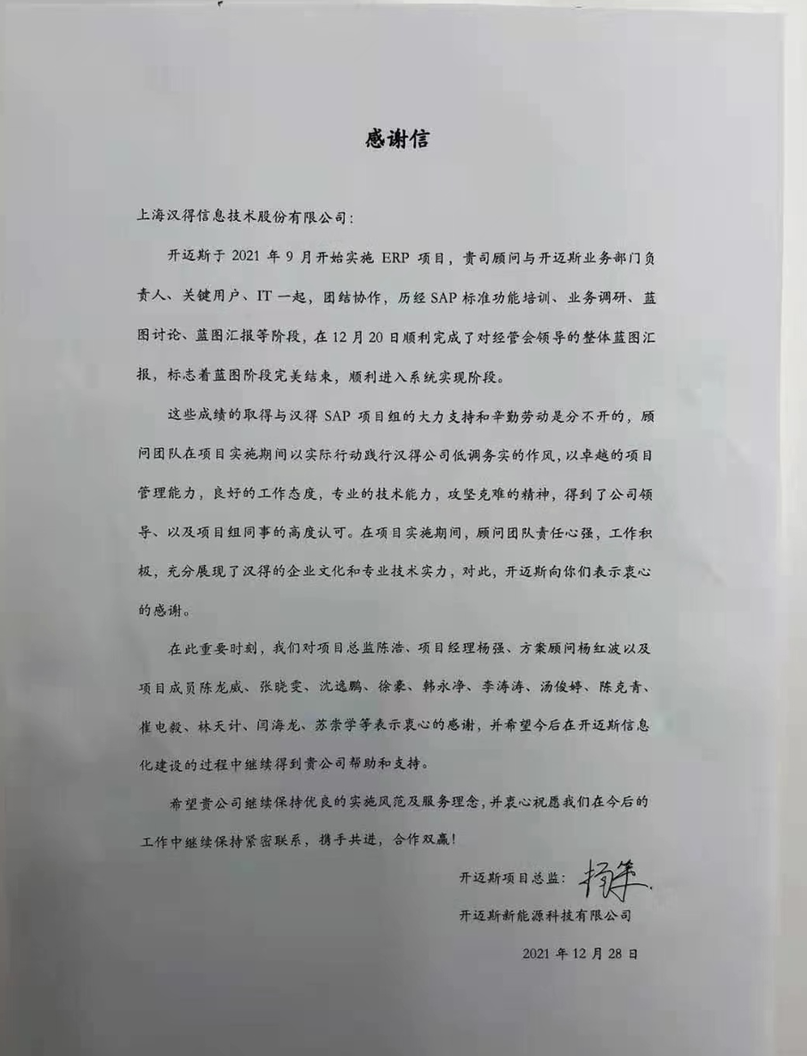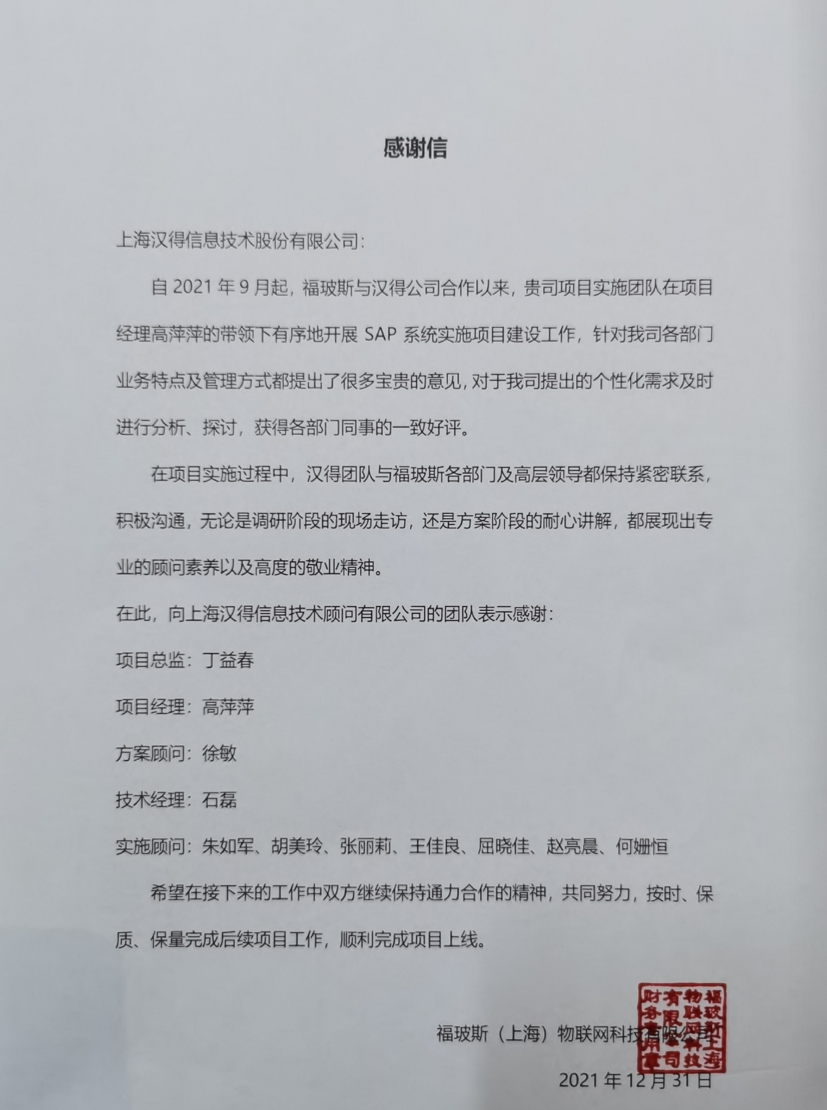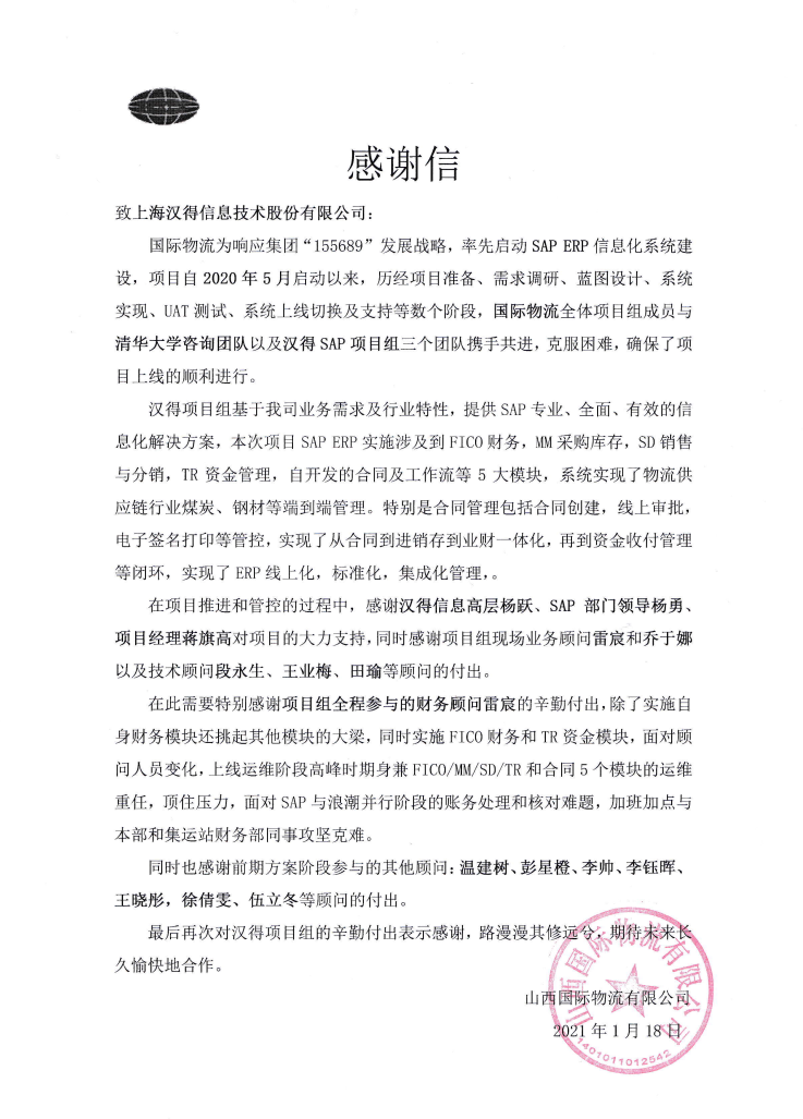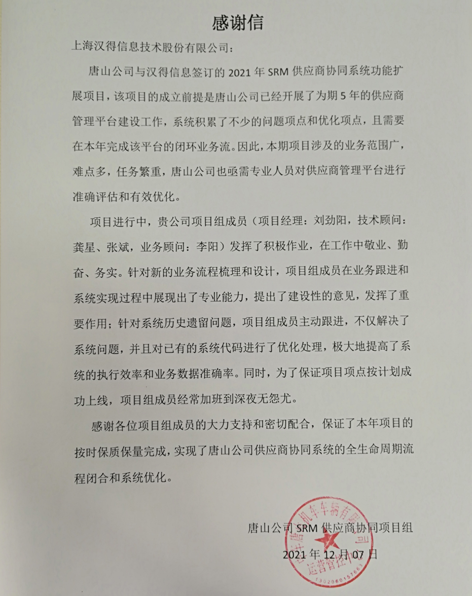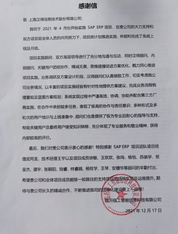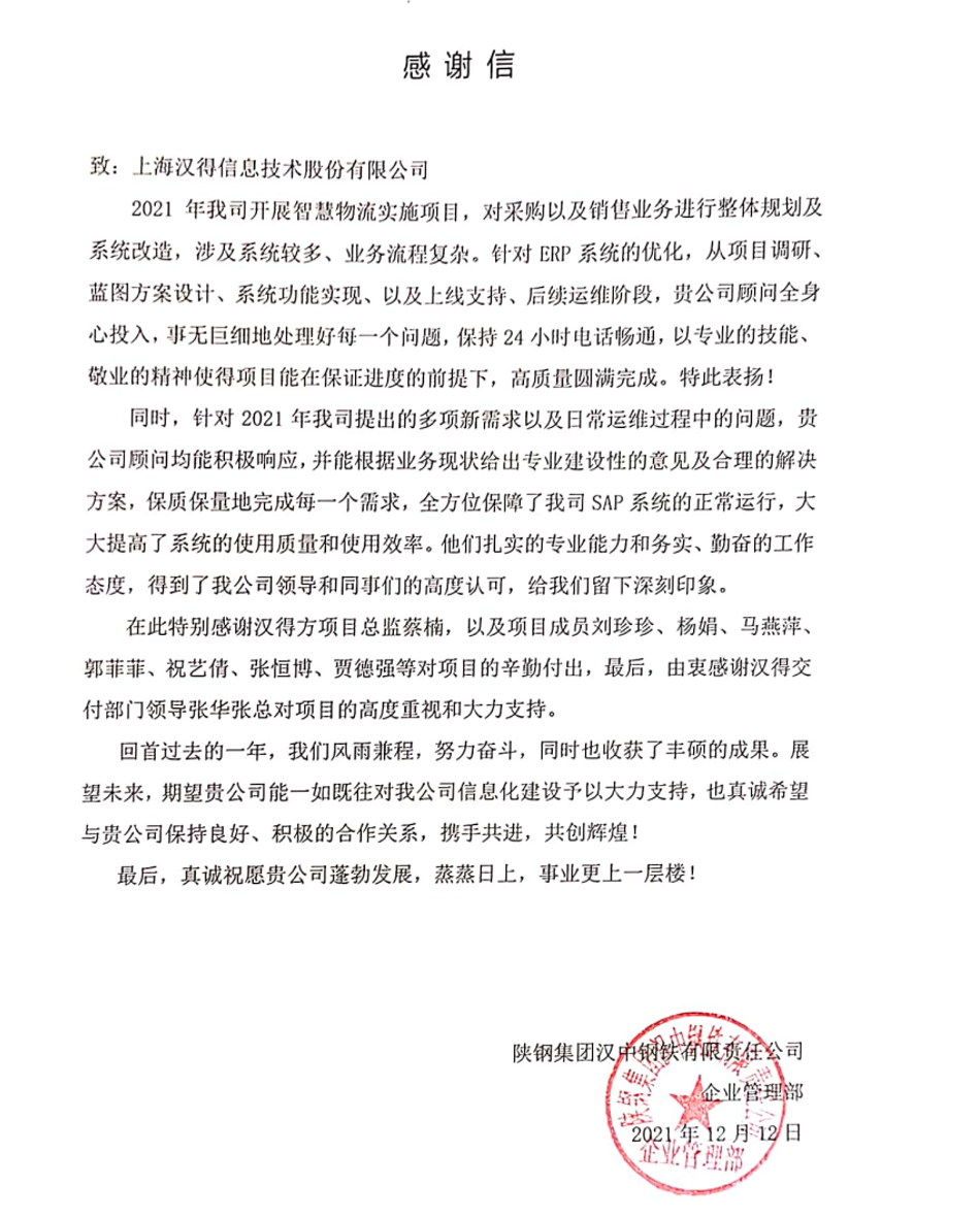 “过去一年,我们在陪伴企业数字化转型的道路上,坚持自主创新,努力自我进化,将服务能力‘进化’成更高形态。 当数字化领域不再有低垂的果实,面对企业在各领域数字化转型的复杂挑战和不确定性环境,能够互相支持,携手同行的唯有坚持长期发展、长远价值的伙伴。 士以弘毅,感怀重托长相伴;任重道远,励将荆棘踏坦途。 汉得感怀客户重托,唯有不断努力超越自我,持续提升服务能力,在每一个客户的数字化转型项目上,坚持创造以‘软件工具扎根企业业务环境’的核心价值,以‘提供行业特征和管理经验的知识沉淀咨询服务’的形式价值,以‘陪伴企业持续进化促进变革发生’的情绪价值,感谢企业客户的信任托付!” —— SAP咨询服务事业部总经理 智协供应链事业部总经理 陆嫕颖 智协供应链 以下收录了部分客户感谢信 << 滑动查看下一封感谢信 >> 烽火通信 经过烽火通信项目组成员和汉得SRM顾问团队共同奋斗,同心协力,通过SRM项目重新梳理整合了采购管理业务流程,提升业务管理水平,提高烽火通信的信息化水平,从初夏到冬至,解决了一个又一个问题,度过了一个又一个难忘的日夜,项目组的辛苦我们看在眼里记在心上,随着烽火通信SRM项目逐步推进,目前处于系统上线准备的阶段。在此对于给予项目大力支持和付出辛勤劳动的顾问们表示由衷的感谢! 中电科电子装备 在中电科SRM项目实施过程中,汉得顾问严谨、敬业的工作态度和高效专业的工作能力让我们印象深刻。展望未来,我们衷心希望能与贵公司一道紧密合作,与贵司建立更加长久而愉快的合作关系,共同向着助推中电科电子装备集团以及旗下子公司成为世界一流的行业领军企业的愿景前进! 一汽大众 我们一起见证了一汽-大众企业电子商城项目的每一个难忘瞬间及每一个里程碑的取得,借助企业电子商城平台我们有信心进一步提升MRO采购管理能力,全面提升信息化水平。经过商城项目的实施,对协议引入、商品管理、费用申请、预算控制、审批、下单等业务进行了全面的定制和开发,覆盖了一汽-大众MRO品类全部领域,显著提升了一般采购管理熊力,很多创新性解决方案的落地也极大地提高我司MRO各品类采购作业的效果。 昆山农商银行 经过这段时间和贵公司的合作,贵公司的SRM系统能够根据业务需求进行灵活调整,将系统功能与实际业务进行有效融合,将各部门的采购需求进行汇总和推进,实现了采购申请预算的跟踪和管控,将招投标流程标准化、规范化,并且通过系统实现与供应商的线上对接,对于行方的供应链管理来说实现效率上的突破和流程上的创新。 华润九新药业 因为信任,所以同行。汉得品质,九新见证。真挚感谢,辛劳付出。展望未来,共铸辉煌!贵司项目组顾问从实际业务需求出发,结合以往的实施经验,克服种种困难,提供优质专业的咨询服务和相应的解决方案,全方位、多视角应对我司的管理及业务变更,积极推进项目的实施与落地。通过SRM平台的优化,提升合规的管理监控水平,加强合规的控制,提升合规整体运作效率。 润联科技 贵公司驻派润联采购团队的项目组成员,在我团队工作已经一年有余,贵公司顾问与我团队成员紧密配合、团结协作,在我司多个项目中均表现出超强的专业能力和敬业精神。 万家乐 项目团队成员本着高效、高质量完成的态度,协助快速解决项目中出现的问题,根据现场的实际情况,与信息部门和业务部门联系、沟通、讨论,及时给出解决方案,为项目的顺利进行提供先决条件,起到了很好的桥梁作用。 云南建投 由贵司负责实施的采购中台项目,在贵司的大力支持和双方项目组全体成员共同努力下,顺利完成一期终验。在2021年内也分别上线了分包一期项目以及各个期优化项目,也获得云上营家部门的一致好评! 盈峰环境 任务是艰巨的,过程是艰辛的,但是成果是显著的,项目组基于我司业务需求及行业特性,提供了专业全面有效的信息化解决方案,历经五个月的项目实施,成功搭建并正常推行SRM 2.0 平台,显著提升我司采购业务管理水平。 SAP咨询服务事业部 以下收录了部分客户感谢信 << 滑动查看下一封感谢信 >> 福玻斯 在项目实施过程中,汉得团队与福玻斯各部门及高层领导都保持紧密联系,积极沟通,无论是调研阶段的现场走访,还是方案阶段的耐心讲解,都展现出专业的顾问素养以及高度的敬业精神。 国际物流 汉得项目组基于我司业务需求及行业特性,提供SAP专业、全面、有效的信息化解决方案,本次项目SAP ERP实施实现了物流物流供应链行业煤炭、钢材等端到端管理。特别是合同管理实现了从合同到进销存到业财一体化,再到资金收付管理等闭环,实现ERP线上化,标准化,集成化管理。 国酿食品 本次SAP ERP实施建设起统一的业财一体化平台,通过产供销计划联动,实现销售订单与需求计划,采购计划,生产计划的高度融合。感谢汉得公司对我司信息化建设的大力支持,期待以后与汉得公司的长期愉快的合作! 海正生物 海正生物SAP项目自正式启动以来,双方项目组全体成员朝夕相处、团结合作、努力拼搏,一起克服各种困难,从春天走到冬天,我们共同见证了一期、二期的每一个难忘瞬间。在项目周期紧张,任务重的情况下,汉得SAP实施团队以专业的表现、敬业的态度、严谨的分析、细心的辅导,使项目成功上线,获得我司一致的认可! 航天长征火箭技术有限
