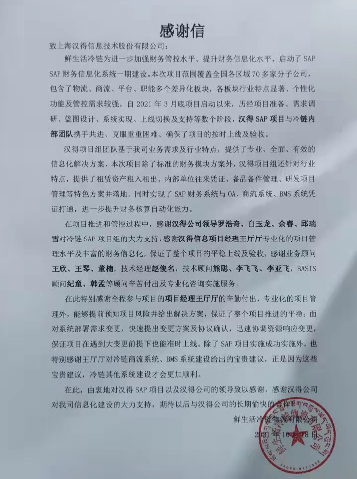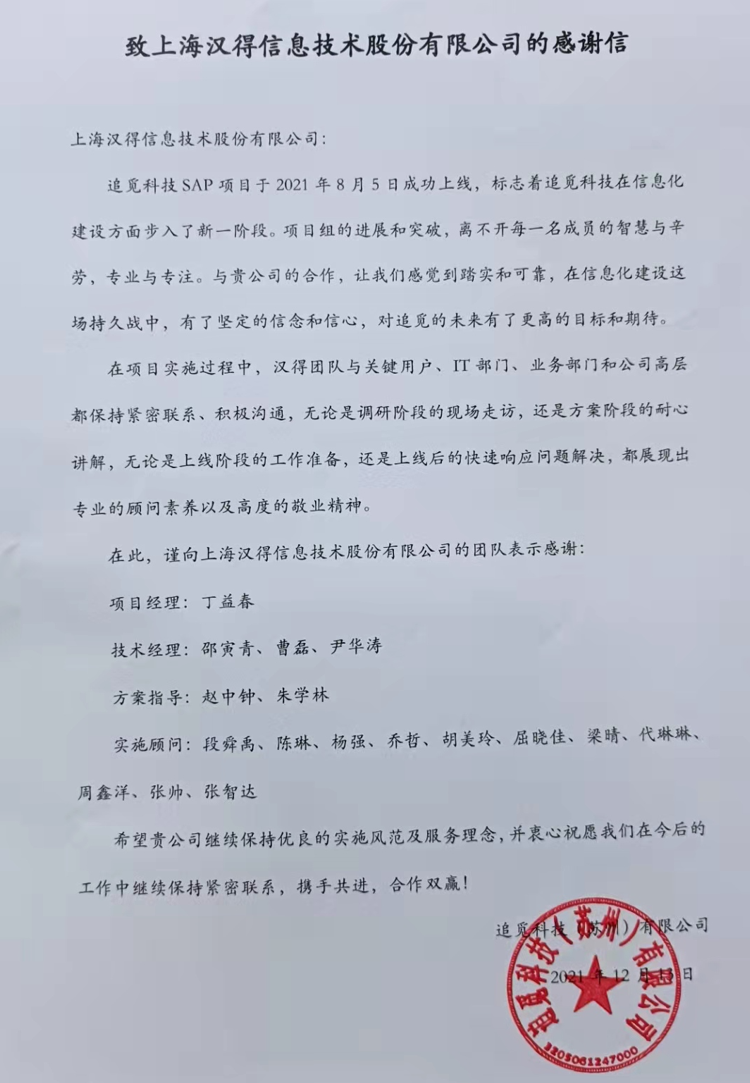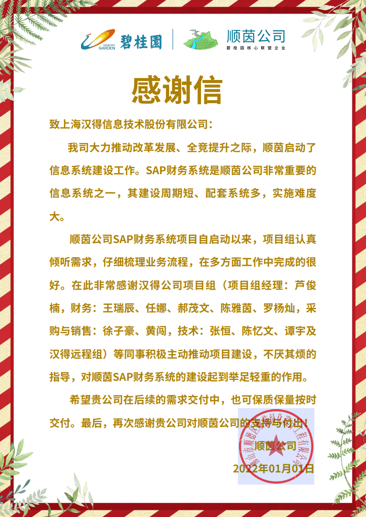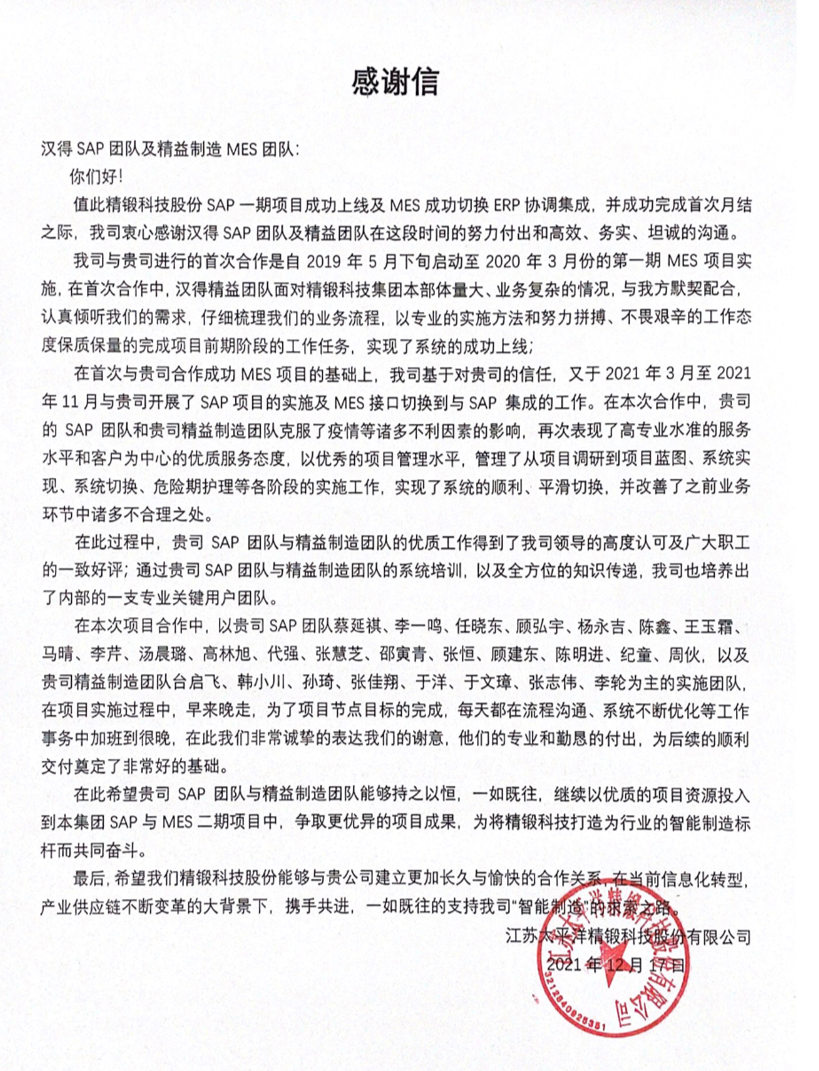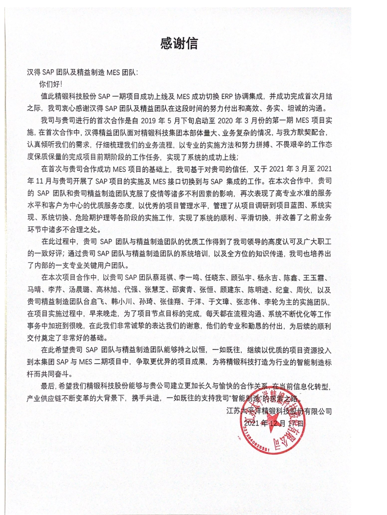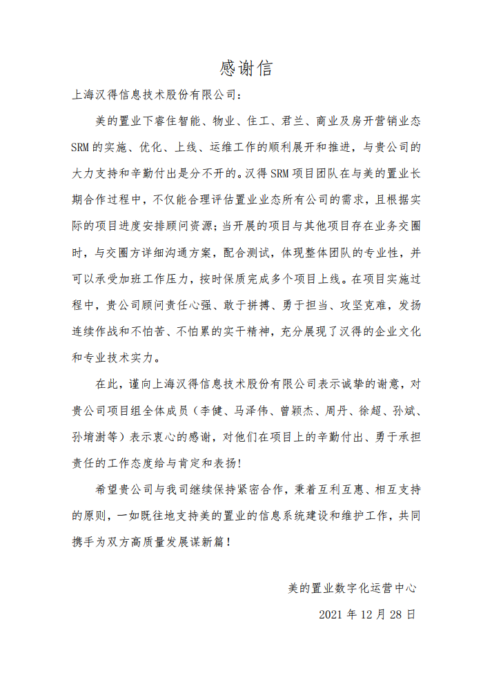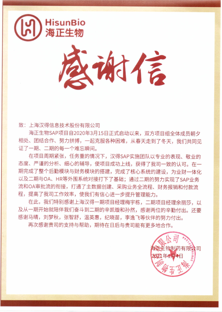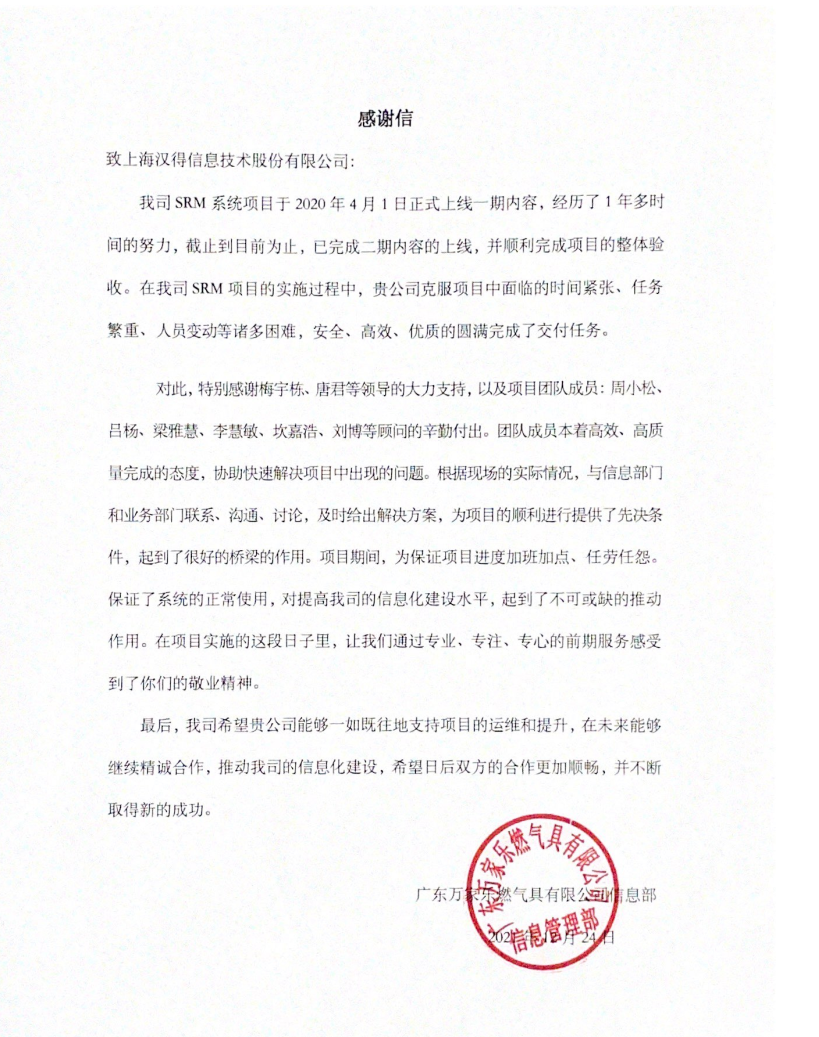 “过去一年,我们在陪伴企业数字化转型的道路上,坚持自主创新,努力自我进化,将服务能力‘进化’成更高形态。 当数字化领域不再有低垂的果实,面对企业在各领域数字化转型的复杂挑战和不确定性环境,能够互相支持,携手同行的唯有坚持长期发展、长远价值的伙伴。 士以弘毅,感怀重托长相伴;任重道远,励将荆棘踏坦途。 汉得感怀客户重托,唯有不断努力超越自我,持续提升服务能力,在每一个客户的数字化转型项目上,坚持创造以‘软件工具扎根企业业务环境’的核心价值,以‘提供行业特征和管理经验的知识沉淀咨询服务’的形式价值,以‘陪伴企业持续进化促进变革发生’的情绪价值,感谢企业客户的信任托付!” —— SAP咨询服务事业部总经理 智协供应链事业部总经理 陆嫕颖 智协供应链 以下收录了部分客户感谢信 << 滑动查看下一封感谢信 >> 烽火通信 经过烽火通信项目组成员和汉得SRM顾问团队共同奋斗,同心协力,通过SRM项目重新梳理整合了采购管理业务流程,提升业务管理水平,提高烽火通信的信息化水平,从初夏到冬至,解决了一个又一个问题,度过了一个又一个难忘的日夜,项目组的辛苦我们看在眼里记在心上,随着烽火通信SRM项目逐步推进,目前处于系统上线准备的阶段。在此对于给予项目大力支持和付出辛勤劳动的顾问们表示由衷的感谢! 中电科电子装备 在中电科SRM项目实施过程中,汉得顾问严谨、敬业的工作态度和高效专业的工作能力让我们印象深刻。展望未来,我们衷心希望能与贵公司一道紧密合作,与贵司建立更加长久而愉快的合作关系,共同向着助推中电科电子装备集团以及旗下子公司成为世界一流的行业领军企业的愿景前进! 一汽大众 我们一起见证了一汽-大众企业电子商城项目的每一个难忘瞬间及每一个里程碑的取得,借助企业电子商城平台我们有信心进一步提升MRO采购管理能力,全面提升信息化水平。经过商城项目的实施,对协议引入、商品管理、费用申请、预算控制、审批、下单等业务进行了全面的定制和开发,覆盖了一汽-大众MRO品类全部领域,显著提升了一般采购管理熊力,很多创新性解决方案的落地也极大地提高我司MRO各品类采购作业的效果。 昆山农商银行 经过这段时间和贵公司的合作,贵公司的SRM系统能够根据业务需求进行灵活调整,将系统功能与实际业务进行有效融合,将各部门的采购需求进行汇总和推进,实现了采购申请预算的跟踪和管控,将招投标流程标准化、规范化,并且通过系统实现与供应商的线上对接,对于行方的供应链管理来说实现效率上的突破和流程上的创新。 华润九新药业 因为信任,所以同行。汉得品质,九新见证。真挚感谢,辛劳付出。展望未来,共铸辉煌!贵司项目组顾问从实际业务需求出发,结合以往的实施经验,克服种种困难,提供优质专业的咨询服务和相应的解决方案,全方位、多视角应对我司的管理及业务变更,积极推进项目的实施与落地。通过SRM平台的优化,提升合规的管理监控水平,加强合规的控制,提升合规整体运作效率。 润联科技 贵公司驻派润联采购团队的项目组成员,在我团队工作已经一年有余,贵公司顾问与我团队成员紧密配合、团结协作,在我司多个项目中均表现出超强的专业能力和敬业精神。 万家乐 项目团队成员本着高效、高质量完成的态度,协助快速解决项目中出现的问题,根据现场的实际情况,与信息部门和业务部门联系、沟通、讨论,及时给出解决方案,为项目的顺利进行提供先决条件,起到了很好的桥梁作用。 云南建投 由贵司负责实施的采购中台项目,在贵司的大力支持和双方项目组全体成员共同努力下,顺利完成一期终验。在2021年内也分别上线了分包一期项目以及各个期优化项目,也获得云上营家部门的一致好评! 盈峰环境 任务是艰巨的,过程是艰辛的,但是成果是显著的,项目组基于我司业务需求及行业特性,提供了专业全面有效的信息化解决方案,历经五个月的项目实施,成功搭建并正常推行SRM 2.0 平台,显著提升我司采购业务管理水平。 SAP咨询服务事业部 以下收录了部分客户感谢信 << 滑动查看下一封感谢信 >> 福玻斯 在项目实施过程中,汉得团队与福玻斯各部门及高层领导都保持紧密联系,积极沟通,无论是调研阶段的现场走访,还是方案阶段的耐心讲解,都展现出专业的顾问素养以及高度的敬业精神。 国际物流 汉得项目组基于我司业务需求及行业特性,提供SAP专业、全面、有效的信息化解决方案,本次项目SAP ERP实施实现了物流物流供应链行业煤炭、钢材等端到端管理。特别是合同管理实现了从合同到进销存到业财一体化,再到资金收付管理等闭环,实现ERP线上化,标准化,集成化管理。 国酿食品 本次SAP ERP实施建设起统一的业财一体化平台,通过产供销计划联动,实现销售订单与需求计划,采购计划,生产计划的高度融合。感谢汉得公司对我司信息化建设的大力支持,期待以后与汉得公司的长期愉快的合作! 海正生物 海正生物SAP项目自正式启动以来,双方项目组全体成员朝夕相处、团结合作、努力拼搏,一起克服各种困难,从春天走到冬天,我们共同见证了一期、二期的每一个难忘瞬间。在项目周期紧张,任务重的情况下,汉得SAP实施团队以专业的表现、敬业的态度、严谨的分析、细心的辅导,使项目成功上线,获得我司一致的认可! 航天长征火箭技术有限