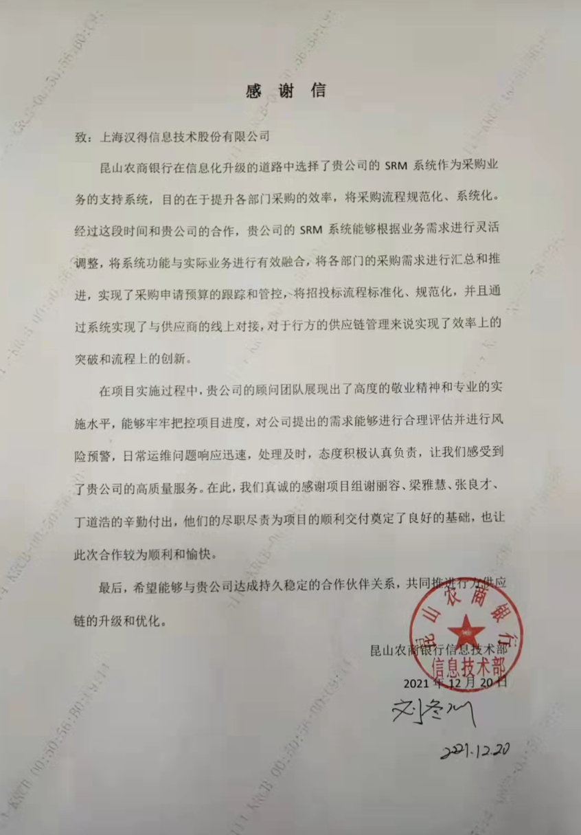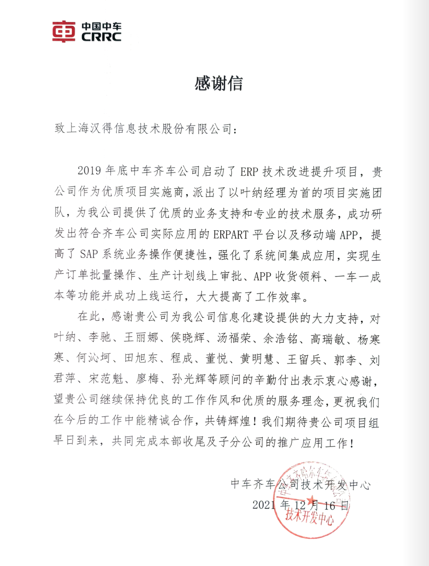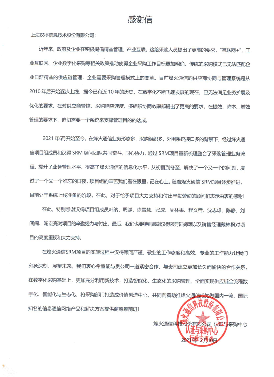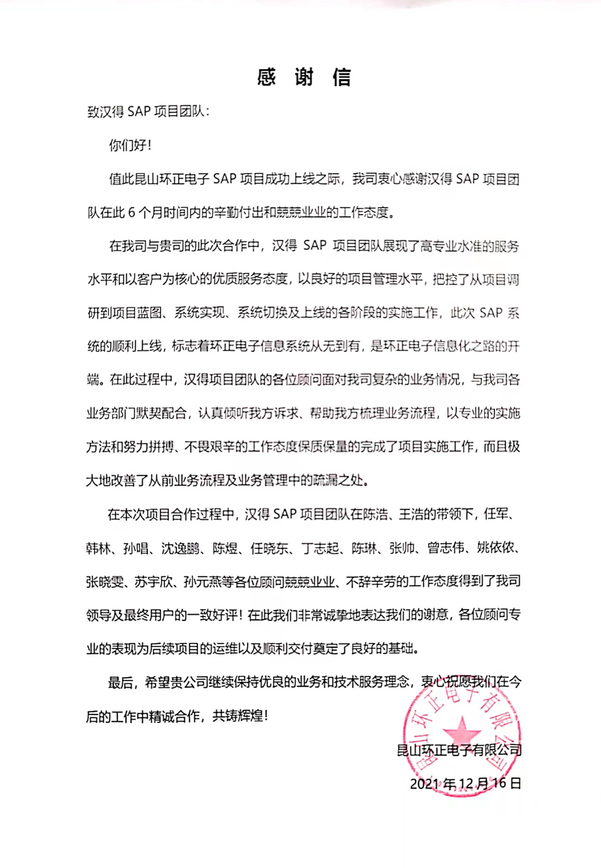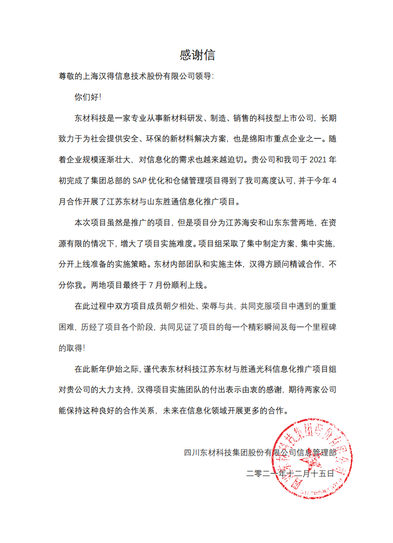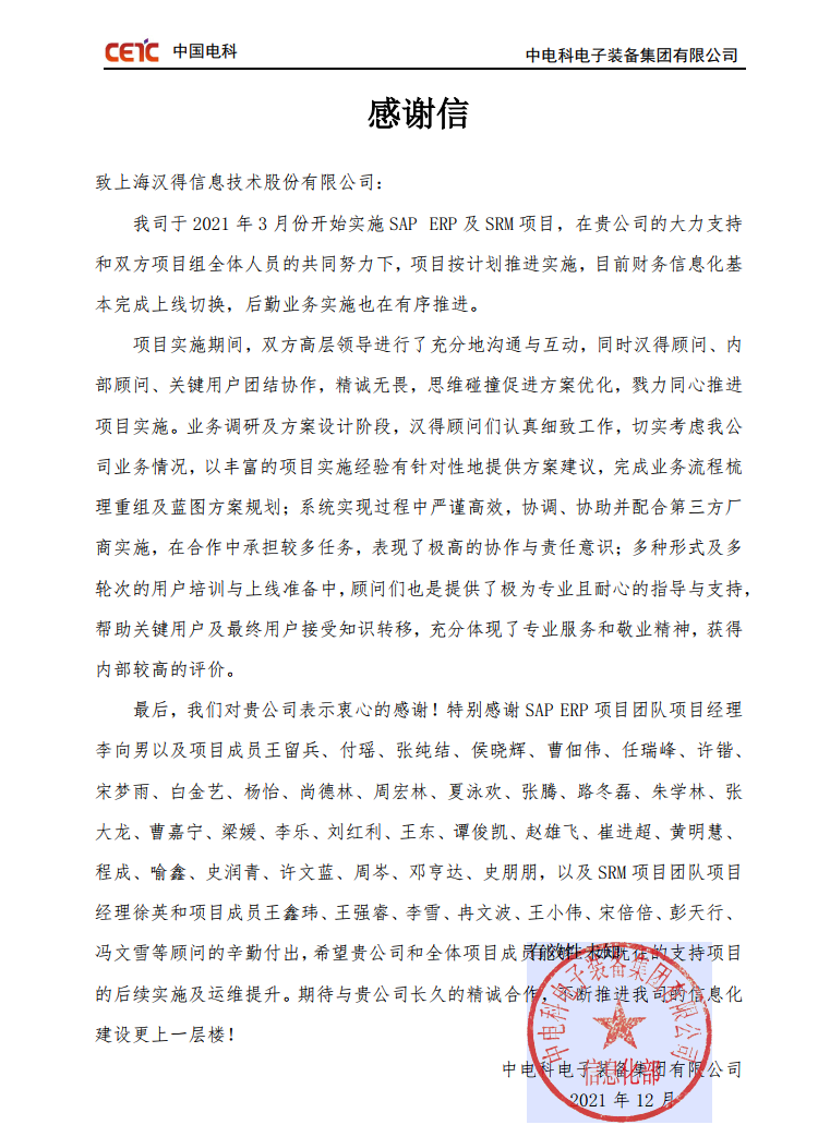 “过去一年,我们在陪伴企业数字化转型的道路上,坚持自主创新,努力自我进化,将服务能力‘进化’成更高形态。 当数字化领域不再有低垂的果实,面对企业在各领域数字化转型的复杂挑战和不确定性环境,能够互相支持,携手同行的唯有坚持长期发展、长远价值的伙伴。 士以弘毅,感怀重托长相伴;任重道远,励将荆棘踏坦途。 汉得感怀客户重托,唯有不断努力超越自我,持续提升服务能力,在每一个客户的数字化转型项目上,坚持创造以‘软件工具扎根企业业务环境’的核心价值,以‘提供行业特征和管理经验的知识沉淀咨询服务’的形式价值,以‘陪伴企业持续进化促进变革发生’的情绪价值,感谢企业客户的信任托付!” —— SAP咨询服务事业部总经理 智协供应链事业部总经理 陆嫕颖 智协供应链 以下收录了部分客户感谢信 << 滑动查看下一封感谢信 >> 烽火通信 经过烽火通信项目组成员和汉得SRM顾问团队共同奋斗,同心协力,通过SRM项目重新梳理整合了采购管理业务流程,提升业务管理水平,提高烽火通信的信息化水平,从初夏到冬至,解决了一个又一个问题,度过了一个又一个难忘的日夜,项目组的辛苦我们看在眼里记在心上,随着烽火通信SRM项目逐步推进,目前处于系统上线准备的阶段。在此对于给予项目大力支持和付出辛勤劳动的顾问们表示由衷的感谢! 中电科电子装备 在中电科SRM项目实施过程中,汉得顾问严谨、敬业的工作态度和高效专业的工作能力让我们印象深刻。展望未来,我们衷心希望能与贵公司一道紧密合作,与贵司建立更加长久而愉快的合作关系,共同向着助推中电科电子装备集团以及旗下子公司成为世界一流的行业领军企业的愿景前进! 一汽大众 我们一起见证了一汽-大众企业电子商城项目的每一个难忘瞬间及每一个里程碑的取得,借助企业电子商城平台我们有信心进一步提升MRO采购管理能力,全面提升信息化水平。经过商城项目的实施,对协议引入、商品管理、费用申请、预算控制、审批、下单等业务进行了全面的定制和开发,覆盖了一汽-大众MRO品类全部领域,显著提升了一般采购管理熊力,很多创新性解决方案的落地也极大地提高我司MRO各品类采购作业的效果。 昆山农商银行 经过这段时间和贵公司的合作,贵公司的SRM系统能够根据业务需求进行灵活调整,将系统功能与实际业务进行有效融合,将各部门的采购需求进行汇总和推进,实现了采购申请预算的跟踪和管控,将招投标流程标准化、规范化,并且通过系统实现与供应商的线上对接,对于行方的供应链管理来说实现效率上的突破和流程上的创新。 华润九新药业 因为信任,所以同行。汉得品质,九新见证。真挚感谢,辛劳付出。展望未来,共铸辉煌!贵司项目组顾问从实际业务需求出发,结合以往的实施经验,克服种种困难,提供优质专业的咨询服务和相应的解决方案,全方位、多视角应对我司的管理及业务变更,积极推进项目的实施与落地。通过SRM平台的优化,提升合规的管理监控水平,加强合规的控制,提升合规整体运作效率。 润联科技 贵公司驻派润联采购团队的项目组成员,在我团队工作已经一年有余,贵公司顾问与我团队成员紧密配合、团结协作,在我司多个项目中均表现出超强的专业能力和敬业精神。 万家乐 项目团队成员本着高效、高质量完成的态度,协助快速解决项目中出现的问题,根据现场的实际情况,与信息部门和业务部门联系、沟通、讨论,及时给出解决方案,为项目的顺利进行提供先决条件,起到了很好的桥梁作用。 云南建投 由贵司负责实施的采购中台项目,在贵司的大力支持和双方项目组全体成员共同努力下,顺利完成一期终验。在2021年内也分别上线了分包一期项目以及各个期优化项目,也获得云上营家部门的一致好评! 盈峰环境 任务是艰巨的,过程是艰辛的,但是成果是显著的,项目组基于我司业务需求及行业特性,提供了专业全面有效的信息化解决方案,历经五个月的项目实施,成功搭建并正常推行SRM 2.0 平台,显著提升我司采购业务管理水平。 SAP咨询服务事业部 以下收录了部分客户感谢信 << 滑动查看下一封感谢信 >> 福玻斯 在项目实施过程中,汉得团队与福玻斯各部门及高层领导都保持紧密联系,积极沟通,无论是调研阶段的现场走访,还是方案阶段的耐心讲解,都展现出专业的顾问素养以及高度的敬业精神。 国际物流 汉得项目组基于我司业务需求及行业特性,提供SAP专业、全面、有效的信息化解决方案,本次项目SAP ERP实施实现了物流物流供应链行业煤炭、钢材等端到端管理。特别是合同管理实现了从合同到进销存到业财一体化,再到资金收付管理等闭环,实现ERP线上化,标准化,集成化管理。 国酿食品 本次SAP ERP实施建设起统一的业财一体化平台,通过产供销计划联动,实现销售订单与需求计划,采购计划,生产计划的高度融合。感谢汉得公司对我司信息化建设的大力支持,期待以后与汉得公司的长期愉快的合作! 海正生物 海正生物SAP项目自正式启动以来,双方项目组全体成员朝夕相处、团结合作、努力拼搏,一起克服各种困难,从春天走到冬天,我们共同见证了一期、二期的每一个难忘瞬间。在项目周期紧张,任务重的情况下,汉得SAP实施团队以专业的表现、敬业的态度、严谨的分析、细心的辅导,使项目成功上线,获得我司一致的认可! 航天长征火箭技术有限