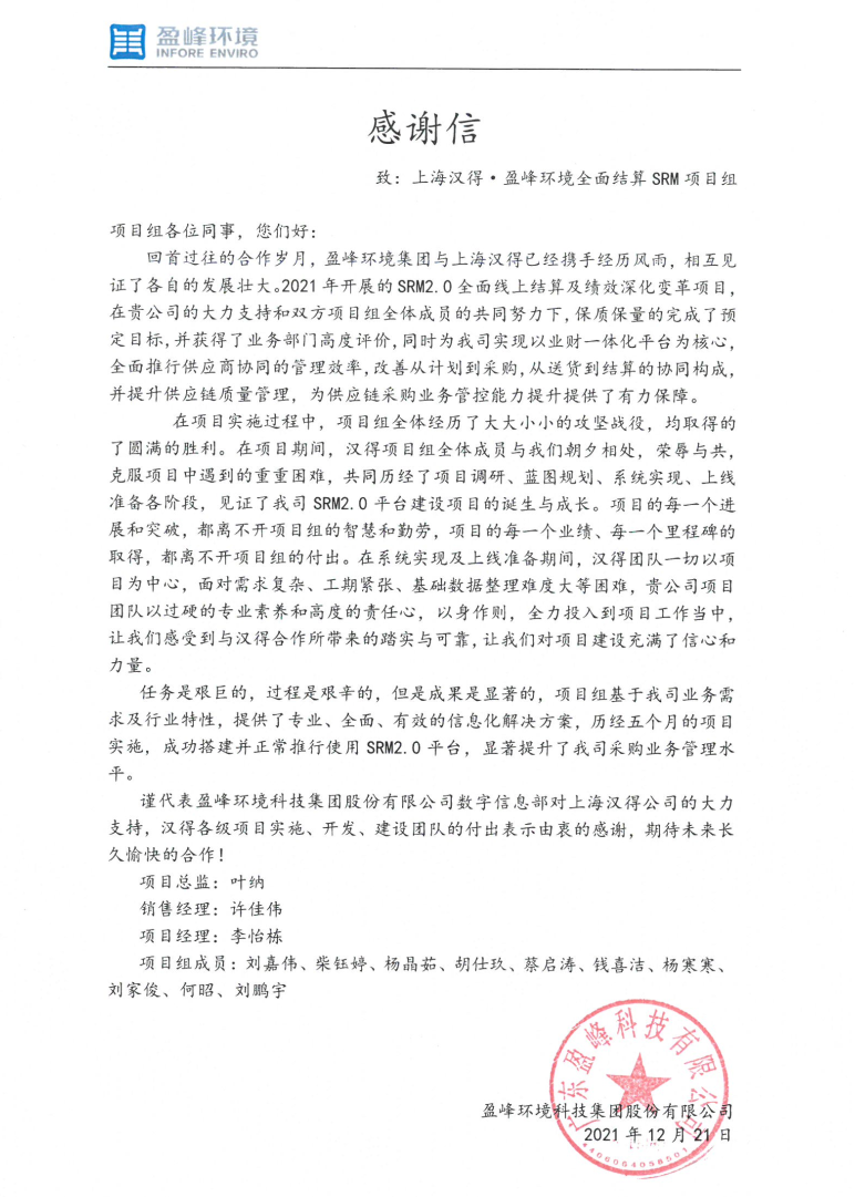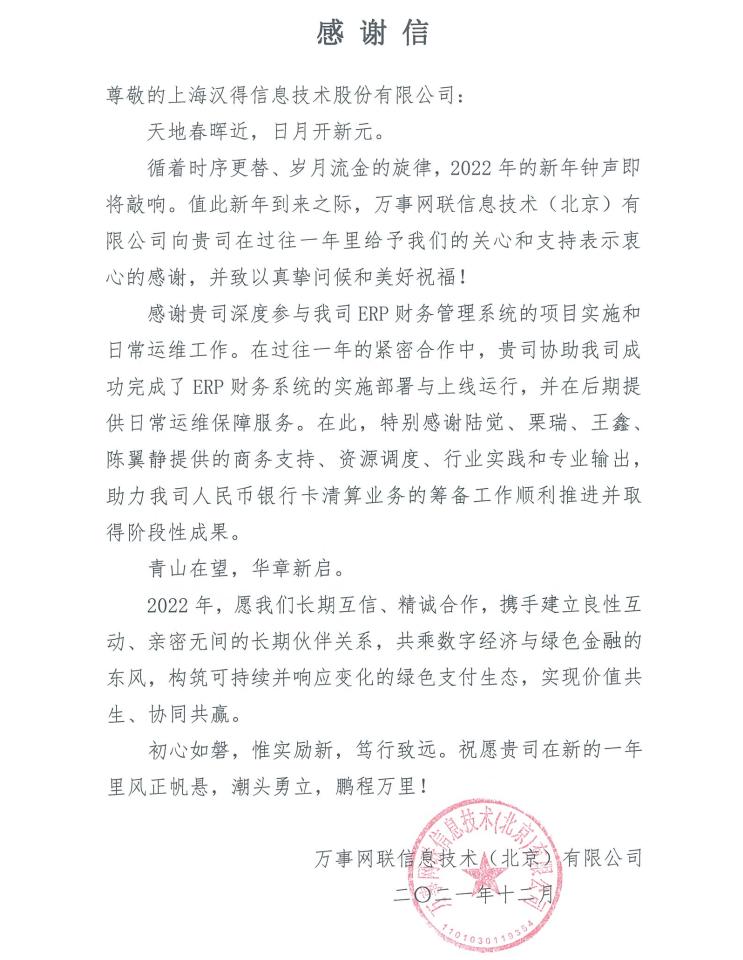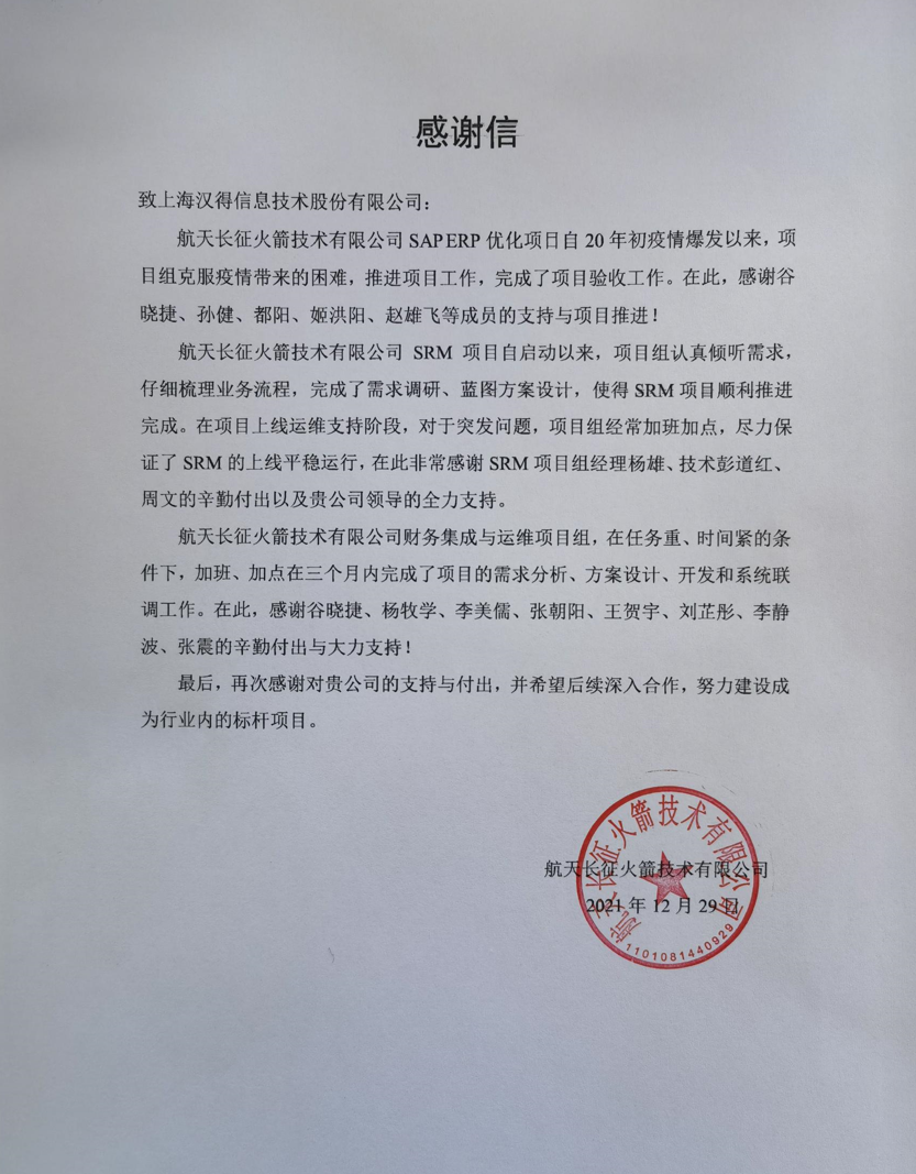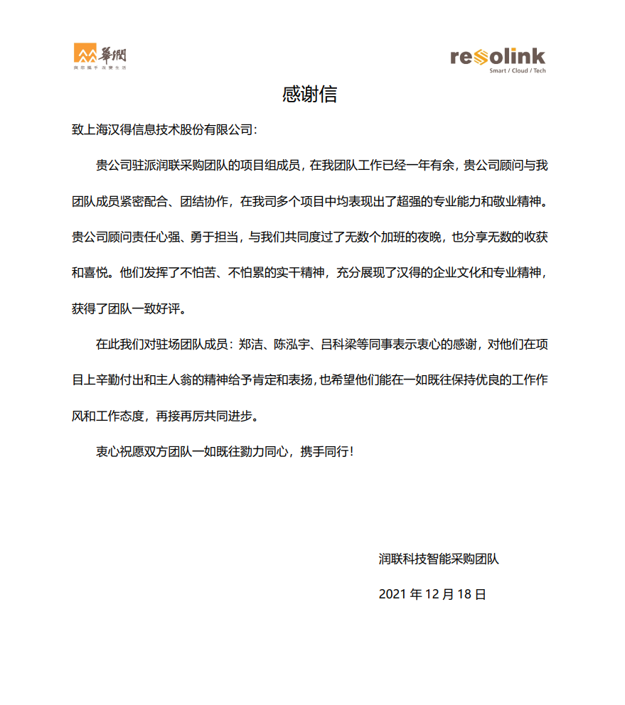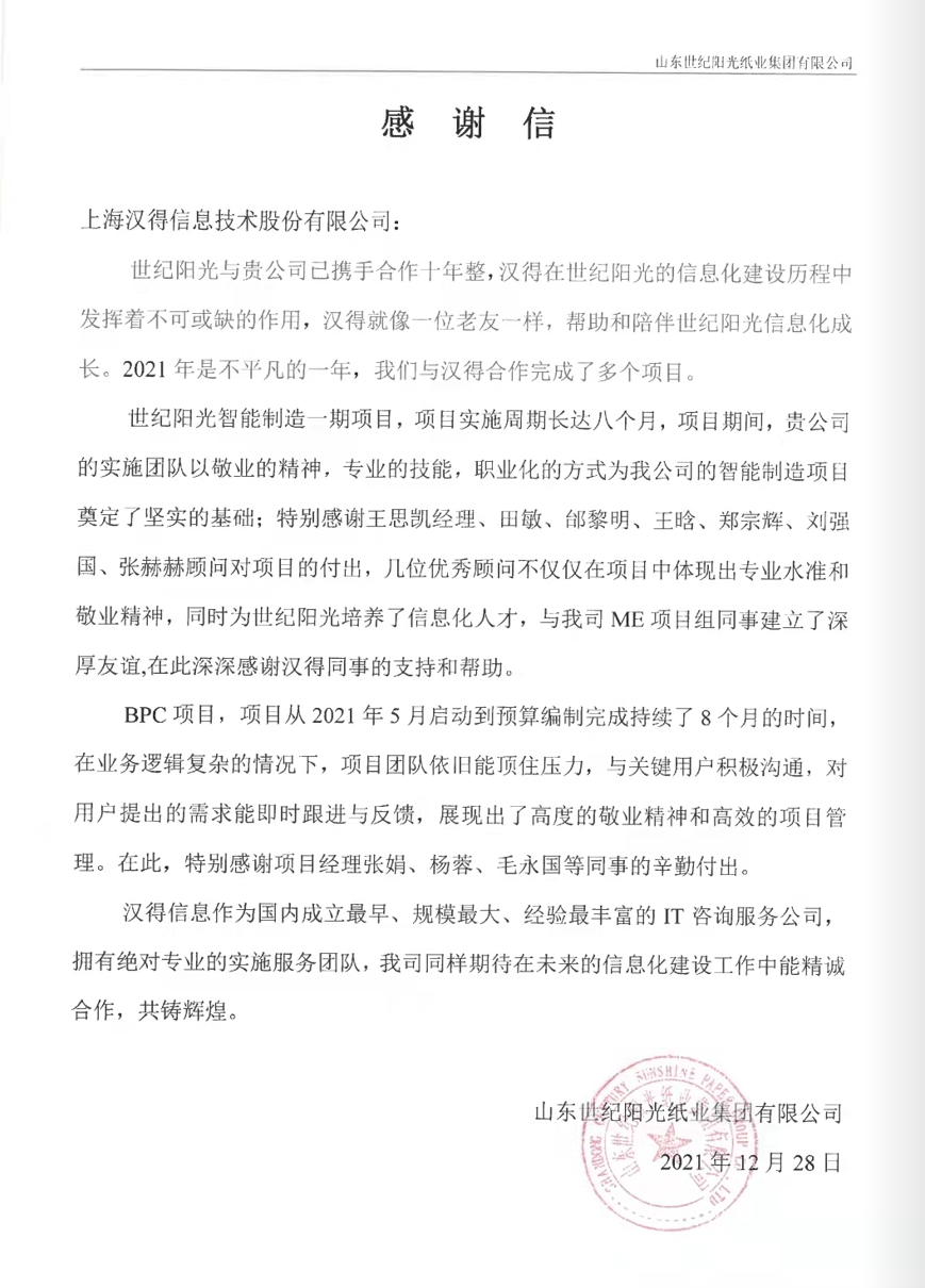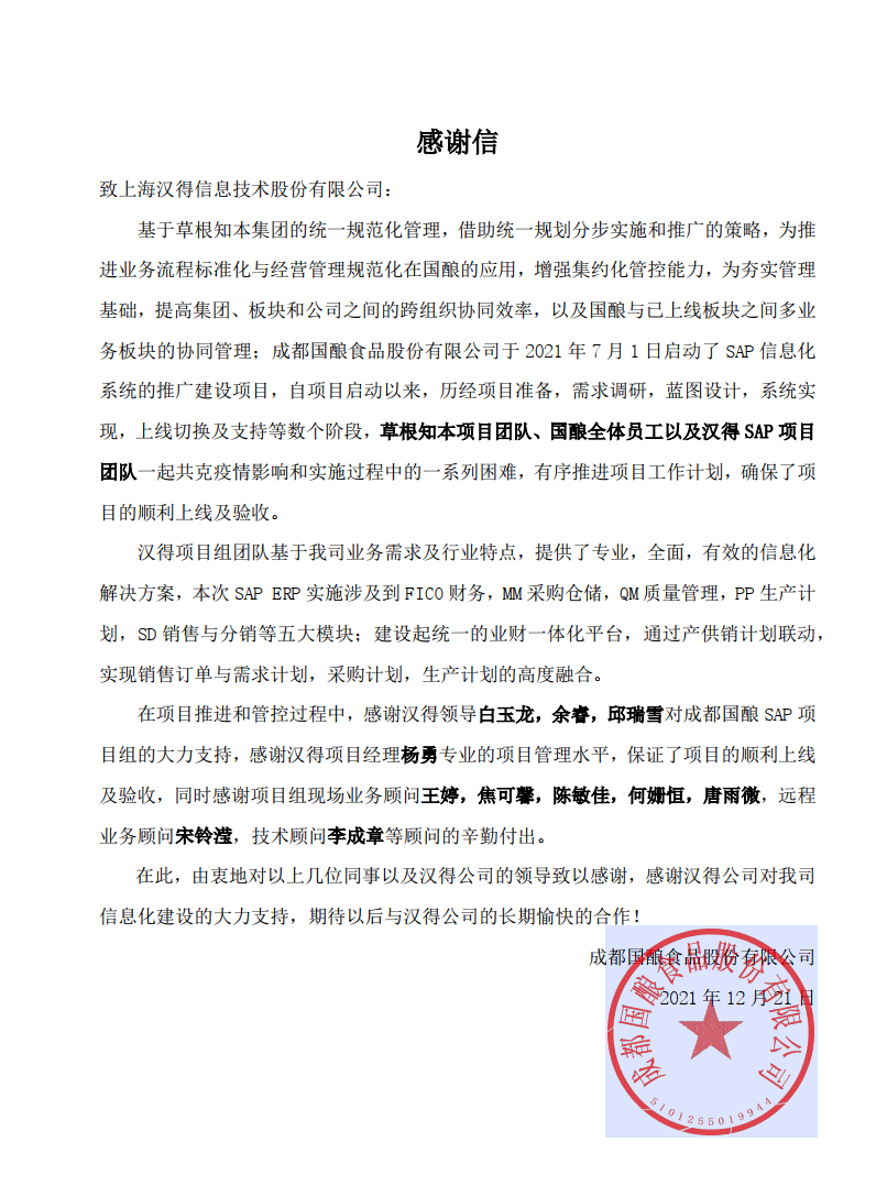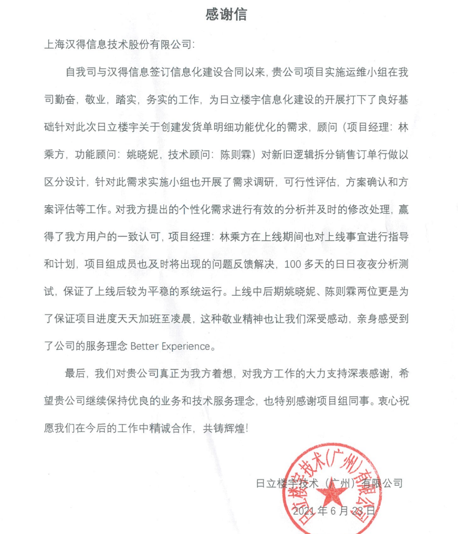 “过去一年,我们在陪伴企业数字化转型的道路上,坚持自主创新,努力自我进化,将服务能力‘进化’成更高形态。 当数字化领域不再有低垂的果实,面对企业在各领域数字化转型的复杂挑战和不确定性环境,能够互相支持,携手同行的唯有坚持长期发展、长远价值的伙伴。 士以弘毅,感怀重托长相伴;任重道远,励将荆棘踏坦途。 汉得感怀客户重托,唯有不断努力超越自我,持续提升服务能力,在每一个客户的数字化转型项目上,坚持创造以‘软件工具扎根企业业务环境’的核心价值,以‘提供行业特征和管理经验的知识沉淀咨询服务’的形式价值,以‘陪伴企业持续进化促进变革发生’的情绪价值,感谢企业客户的信任托付!” —— SAP咨询服务事业部总经理 智协供应链事业部总经理 陆嫕颖 智协供应链 以下收录了部分客户感谢信 << 滑动查看下一封感谢信 >> 烽火通信 经过烽火通信项目组成员和汉得SRM顾问团队共同奋斗,同心协力,通过SRM项目重新梳理整合了采购管理业务流程,提升业务管理水平,提高烽火通信的信息化水平,从初夏到冬至,解决了一个又一个问题,度过了一个又一个难忘的日夜,项目组的辛苦我们看在眼里记在心上,随着烽火通信SRM项目逐步推进,目前处于系统上线准备的阶段。在此对于给予项目大力支持和付出辛勤劳动的顾问们表示由衷的感谢! 中电科电子装备 在中电科SRM项目实施过程中,汉得顾问严谨、敬业的工作态度和高效专业的工作能力让我们印象深刻。展望未来,我们衷心希望能与贵公司一道紧密合作,与贵司建立更加长久而愉快的合作关系,共同向着助推中电科电子装备集团以及旗下子公司成为世界一流的行业领军企业的愿景前进! 一汽大众 我们一起见证了一汽-大众企业电子商城项目的每一个难忘瞬间及每一个里程碑的取得,借助企业电子商城平台我们有信心进一步提升MRO采购管理能力,全面提升信息化水平。经过商城项目的实施,对协议引入、商品管理、费用申请、预算控制、审批、下单等业务进行了全面的定制和开发,覆盖了一汽-大众MRO品类全部领域,显著提升了一般采购管理熊力,很多创新性解决方案的落地也极大地提高我司MRO各品类采购作业的效果。 昆山农商银行 经过这段时间和贵公司的合作,贵公司的SRM系统能够根据业务需求进行灵活调整,将系统功能与实际业务进行有效融合,将各部门的采购需求进行汇总和推进,实现了采购申请预算的跟踪和管控,将招投标流程标准化、规范化,并且通过系统实现与供应商的线上对接,对于行方的供应链管理来说实现效率上的突破和流程上的创新。 华润九新药业 因为信任,所以同行。汉得品质,九新见证。真挚感谢,辛劳付出。展望未来,共铸辉煌!贵司项目组顾问从实际业务需求出发,结合以往的实施经验,克服种种困难,提供优质专业的咨询服务和相应的解决方案,全方位、多视角应对我司的管理及业务变更,积极推进项目的实施与落地。通过SRM平台的优化,提升合规的管理监控水平,加强合规的控制,提升合规整体运作效率。 润联科技 贵公司驻派润联采购团队的项目组成员,在我团队工作已经一年有余,贵公司顾问与我团队成员紧密配合、团结协作,在我司多个项目中均表现出超强的专业能力和敬业精神。 万家乐 项目团队成员本着高效、高质量完成的态度,协助快速解决项目中出现的问题,根据现场的实际情况,与信息部门和业务部门联系、沟通、讨论,及时给出解决方案,为项目的顺利进行提供先决条件,起到了很好的桥梁作用。 云南建投 由贵司负责实施的采购中台项目,在贵司的大力支持和双方项目组全体成员共同努力下,顺利完成一期终验。在2021年内也分别上线了分包一期项目以及各个期优化项目,也获得云上营家部门的一致好评! 盈峰环境 任务是艰巨的,过程是艰辛的,但是成果是显著的,项目组基于我司业务需求及行业特性,提供了专业全面有效的信息化解决方案,历经五个月的项目实施,成功搭建并正常推行SRM 2.0 平台,显著提升我司采购业务管理水平。 SAP咨询服务事业部 以下收录了部分客户感谢信 << 滑动查看下一封感谢信 >> 福玻斯 在项目实施过程中,汉得团队与福玻斯各部门及高层领导都保持紧密联系,积极沟通,无论是调研阶段的现场走访,还是方案阶段的耐心讲解,都展现出专业的顾问素养以及高度的敬业精神。 国际物流 汉得项目组基于我司业务需求及行业特性,提供SAP专业、全面、有效的信息化解决方案,本次项目SAP ERP实施实现了物流物流供应链行业煤炭、钢材等端到端管理。特别是合同管理实现了从合同到进销存到业财一体化,再到资金收付管理等闭环,实现ERP线上化,标准化,集成化管理。 国酿食品 本次SAP ERP实施建设起统一的业财一体化平台,通过产供销计划联动,实现销售订单与需求计划,采购计划,生产计划的高度融合。感谢汉得公司对我司信息化建设的大力支持,期待以后与汉得公司的长期愉快的合作! 海正生物 海正生物SAP项目自正式启动以来,双方项目组全体成员朝夕相处、团结合作、努力拼搏,一起克服各种困难,从春天走到冬天,我们共同见证了一期、二期的每一个难忘瞬间。在项目周期紧张,任务重的情况下,汉得SAP实施团队以专业的表现、敬业的态度、严谨的分析、细心的辅导,使项目成功上线,获得我司一致的认可! 航天长征火箭技术有限