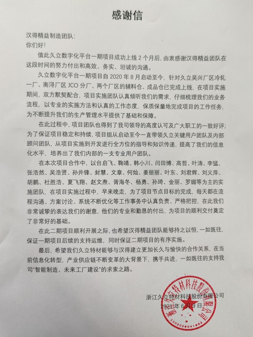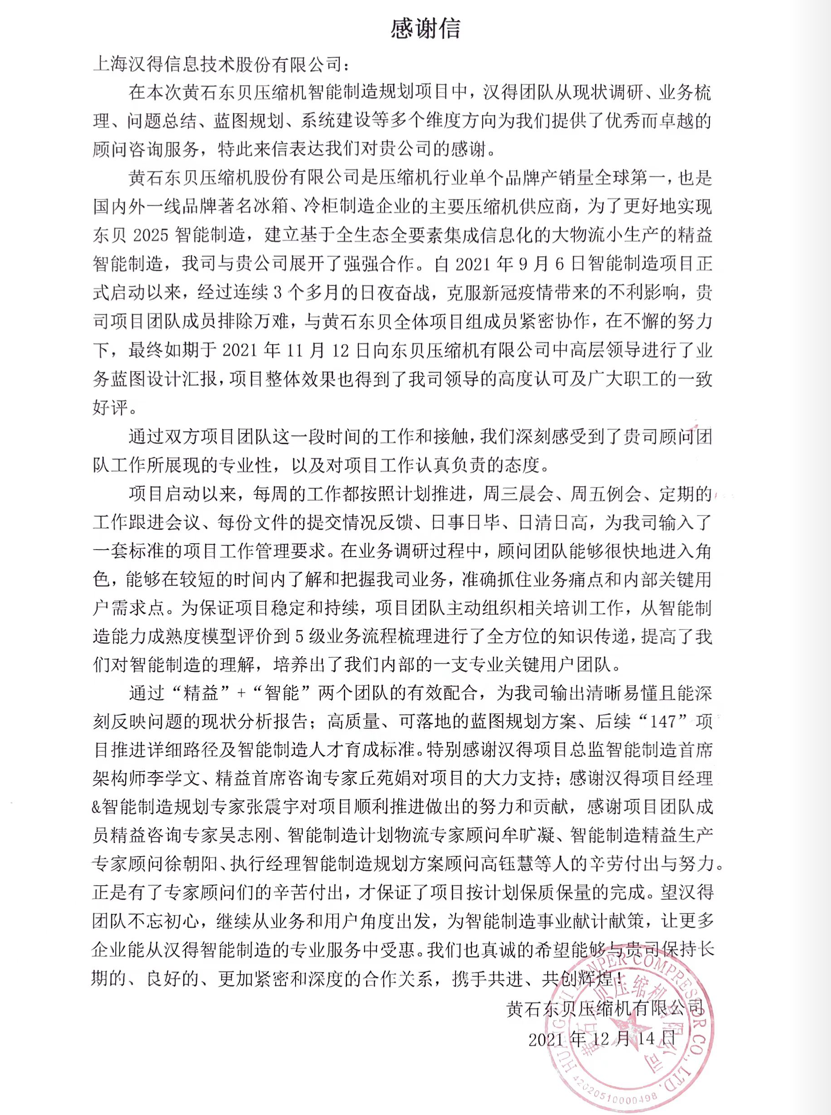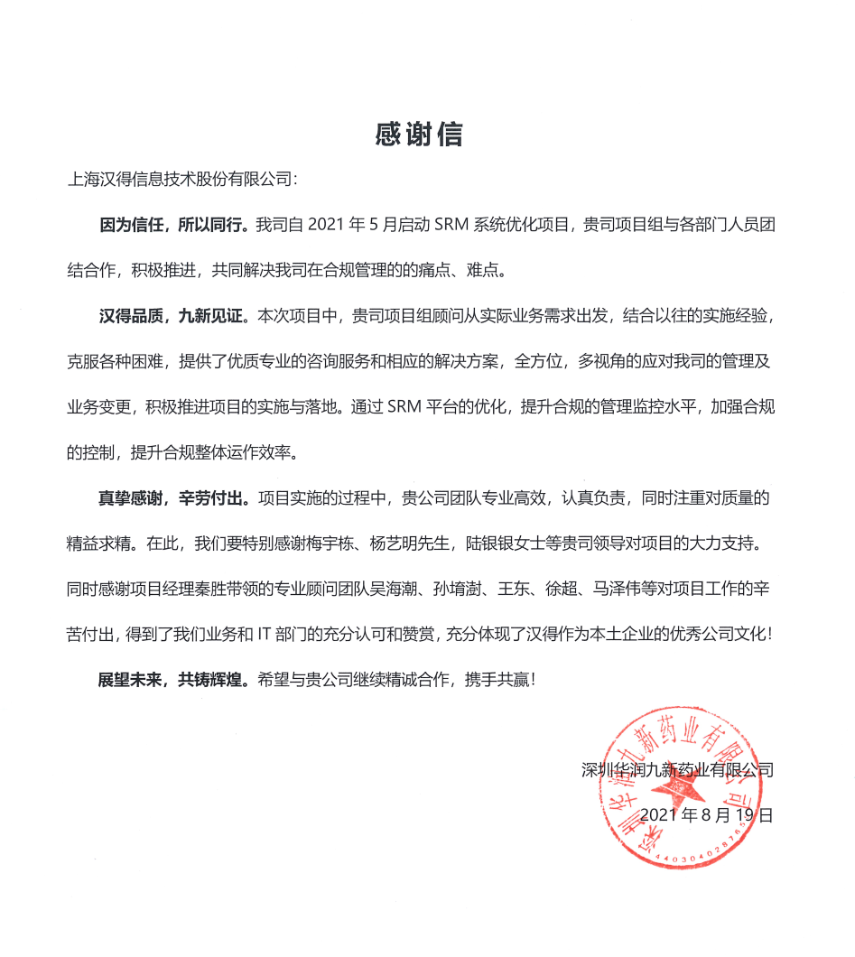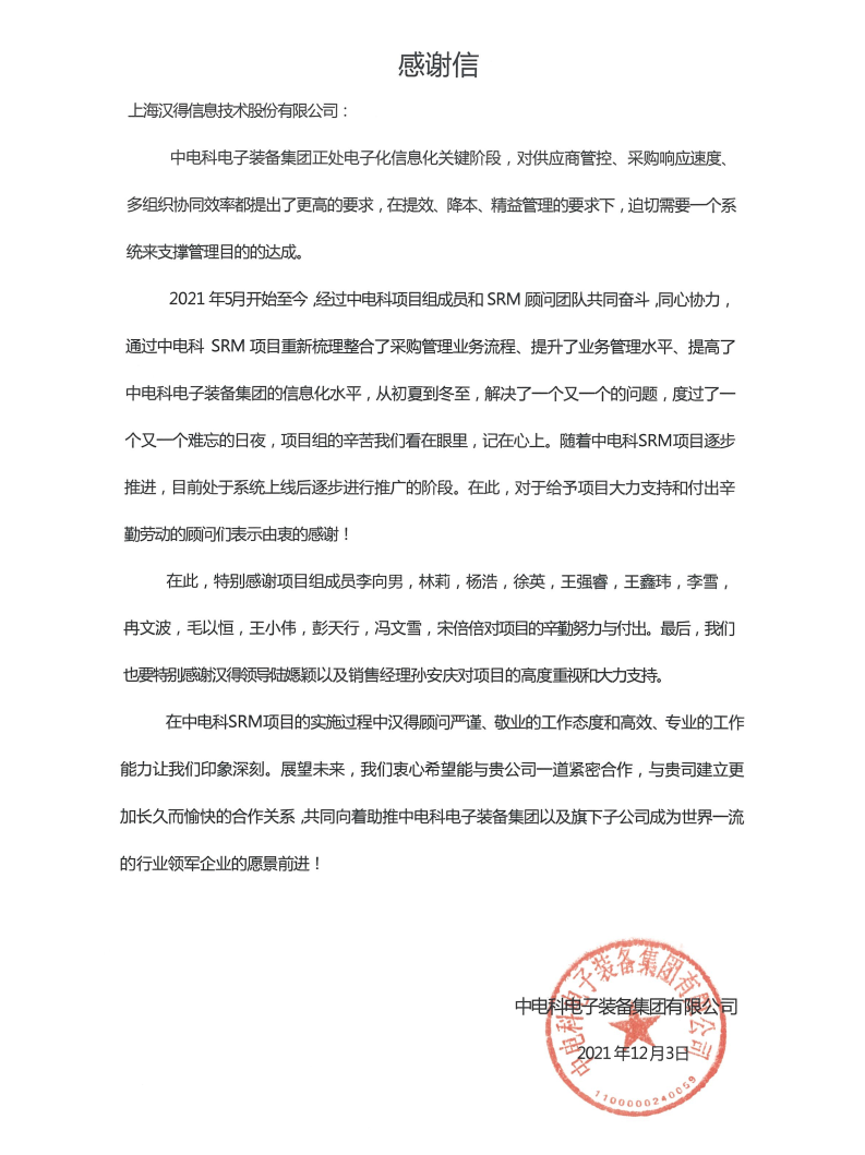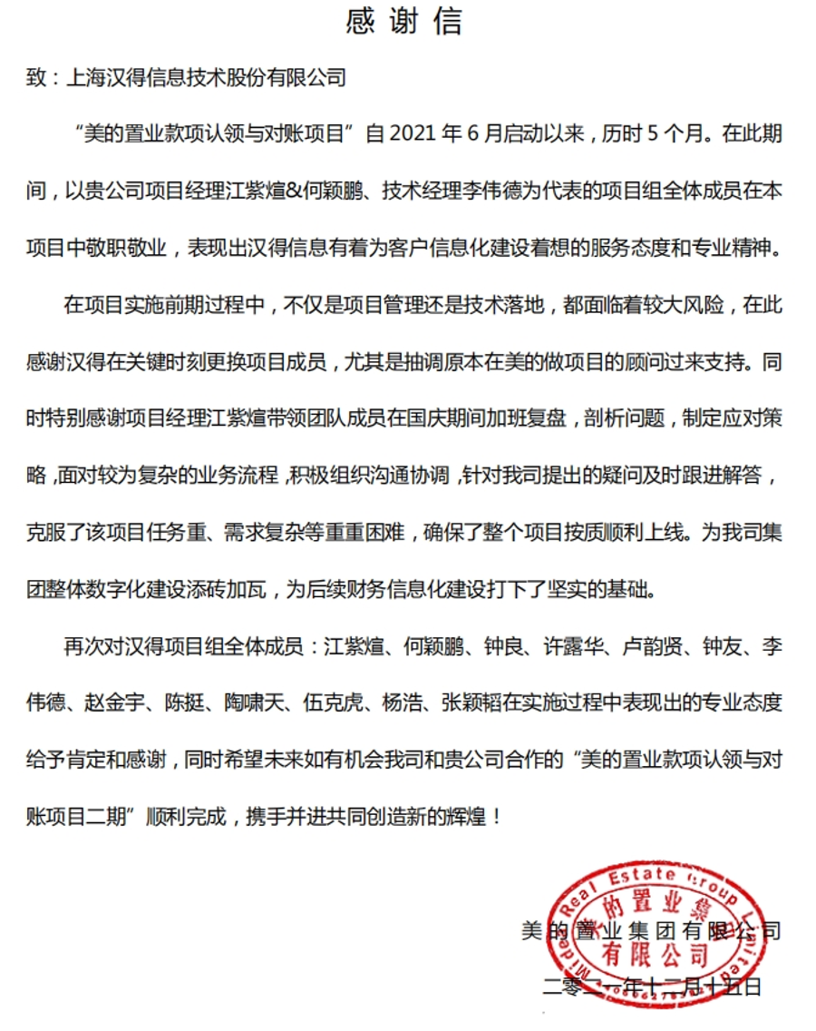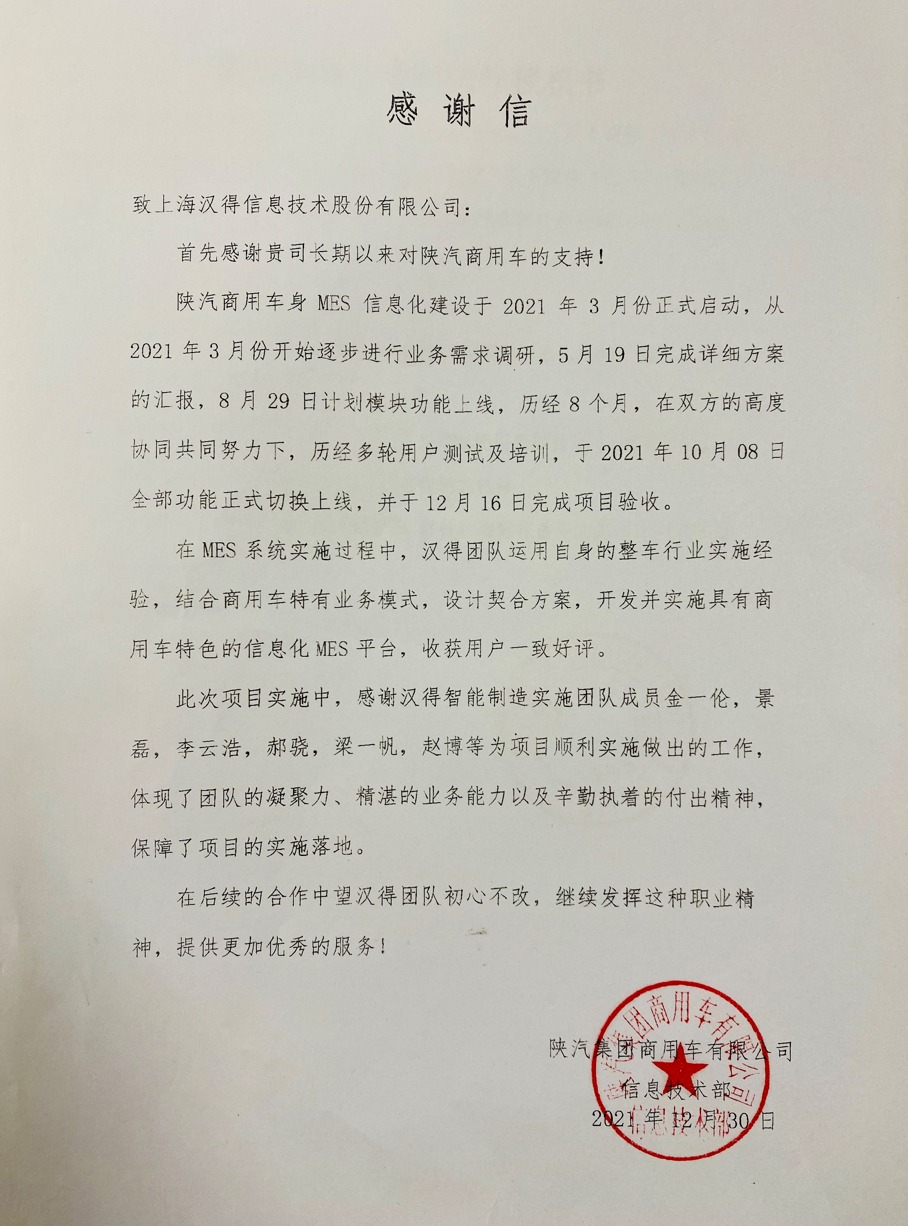 “过去一年,我们在陪伴企业数字化转型的道路上,坚持自主创新,努力自我进化,将服务能力‘进化’成更高形态。 当数字化领域不再有低垂的果实,面对企业在各领域数字化转型的复杂挑战和不确定性环境,能够互相支持,携手同行的唯有坚持长期发展、长远价值的伙伴。 士以弘毅,感怀重托长相伴;任重道远,励将荆棘踏坦途。 汉得感怀客户重托,唯有不断努力超越自我,持续提升服务能力,在每一个客户的数字化转型项目上,坚持创造以‘软件工具扎根企业业务环境’的核心价值,以‘提供行业特征和管理经验的知识沉淀咨询服务’的形式价值,以‘陪伴企业持续进化促进变革发生’的情绪价值,感谢企业客户的信任托付!” —— SAP咨询服务事业部总经理 智协供应链事业部总经理 陆嫕颖 智协供应链 以下收录了部分客户感谢信 << 滑动查看下一封感谢信 >> 烽火通信 经过烽火通信项目组成员和汉得SRM顾问团队共同奋斗,同心协力,通过SRM项目重新梳理整合了采购管理业务流程,提升业务管理水平,提高烽火通信的信息化水平,从初夏到冬至,解决了一个又一个问题,度过了一个又一个难忘的日夜,项目组的辛苦我们看在眼里记在心上,随着烽火通信SRM项目逐步推进,目前处于系统上线准备的阶段。在此对于给予项目大力支持和付出辛勤劳动的顾问们表示由衷的感谢! 中电科电子装备 在中电科SRM项目实施过程中,汉得顾问严谨、敬业的工作态度和高效专业的工作能力让我们印象深刻。展望未来,我们衷心希望能与贵公司一道紧密合作,与贵司建立更加长久而愉快的合作关系,共同向着助推中电科电子装备集团以及旗下子公司成为世界一流的行业领军企业的愿景前进! 一汽大众 我们一起见证了一汽-大众企业电子商城项目的每一个难忘瞬间及每一个里程碑的取得,借助企业电子商城平台我们有信心进一步提升MRO采购管理能力,全面提升信息化水平。经过商城项目的实施,对协议引入、商品管理、费用申请、预算控制、审批、下单等业务进行了全面的定制和开发,覆盖了一汽-大众MRO品类全部领域,显著提升了一般采购管理熊力,很多创新性解决方案的落地也极大地提高我司MRO各品类采购作业的效果。 昆山农商银行 经过这段时间和贵公司的合作,贵公司的SRM系统能够根据业务需求进行灵活调整,将系统功能与实际业务进行有效融合,将各部门的采购需求进行汇总和推进,实现了采购申请预算的跟踪和管控,将招投标流程标准化、规范化,并且通过系统实现与供应商的线上对接,对于行方的供应链管理来说实现效率上的突破和流程上的创新。 华润九新药业 因为信任,所以同行。汉得品质,九新见证。真挚感谢,辛劳付出。展望未来,共铸辉煌!贵司项目组顾问从实际业务需求出发,结合以往的实施经验,克服种种困难,提供优质专业的咨询服务和相应的解决方案,全方位、多视角应对我司的管理及业务变更,积极推进项目的实施与落地。通过SRM平台的优化,提升合规的管理监控水平,加强合规的控制,提升合规整体运作效率。 润联科技 贵公司驻派润联采购团队的项目组成员,在我团队工作已经一年有余,贵公司顾问与我团队成员紧密配合、团结协作,在我司多个项目中均表现出超强的专业能力和敬业精神。 万家乐 项目团队成员本着高效、高质量完成的态度,协助快速解决项目中出现的问题,根据现场的实际情况,与信息部门和业务部门联系、沟通、讨论,及时给出解决方案,为项目的顺利进行提供先决条件,起到了很好的桥梁作用。 云南建投 由贵司负责实施的采购中台项目,在贵司的大力支持和双方项目组全体成员共同努力下,顺利完成一期终验。在2021年内也分别上线了分包一期项目以及各个期优化项目,也获得云上营家部门的一致好评! 盈峰环境 任务是艰巨的,过程是艰辛的,但是成果是显著的,项目组基于我司业务需求及行业特性,提供了专业全面有效的信息化解决方案,历经五个月的项目实施,成功搭建并正常推行SRM 2.0 平台,显著提升我司采购业务管理水平。 SAP咨询服务事业部 以下收录了部分客户感谢信 << 滑动查看下一封感谢信 >> 福玻斯 在项目实施过程中,汉得团队与福玻斯各部门及高层领导都保持紧密联系,积极沟通,无论是调研阶段的现场走访,还是方案阶段的耐心讲解,都展现出专业的顾问素养以及高度的敬业精神。 国际物流 汉得项目组基于我司业务需求及行业特性,提供SAP专业、全面、有效的信息化解决方案,本次项目SAP ERP实施实现了物流物流供应链行业煤炭、钢材等端到端管理。特别是合同管理实现了从合同到进销存到业财一体化,再到资金收付管理等闭环,实现ERP线上化,标准化,集成化管理。 国酿食品 本次SAP ERP实施建设起统一的业财一体化平台,通过产供销计划联动,实现销售订单与需求计划,采购计划,生产计划的高度融合。感谢汉得公司对我司信息化建设的大力支持,期待以后与汉得公司的长期愉快的合作! 海正生物 海正生物SAP项目自正式启动以来,双方项目组全体成员朝夕相处、团结合作、努力拼搏,一起克服各种困难,从春天走到冬天,我们共同见证了一期、二期的每一个难忘瞬间。在项目周期紧张,任务重的情况下,汉得SAP实施团队以专业的表现、敬业的态度、严谨的分析、细心的辅导,使项目成功上线,获得我司一致的认可! 航天长征火箭技术有限