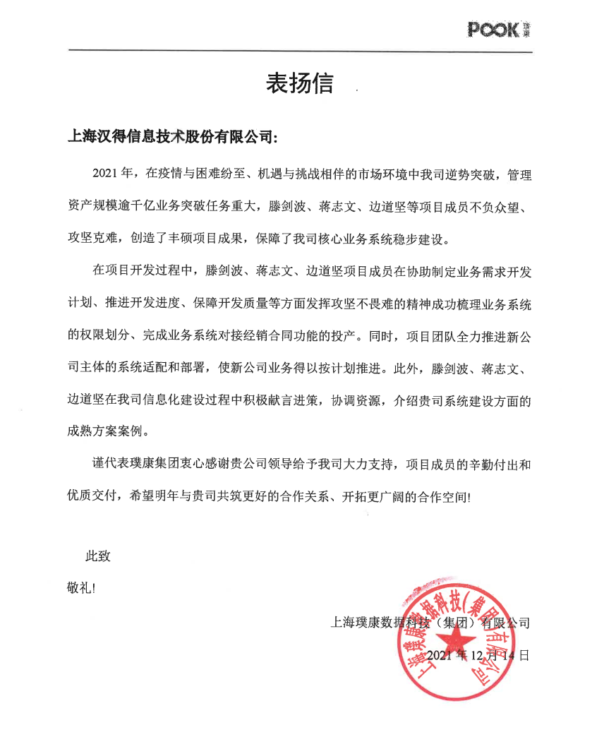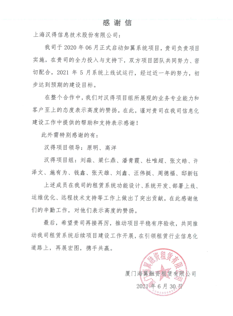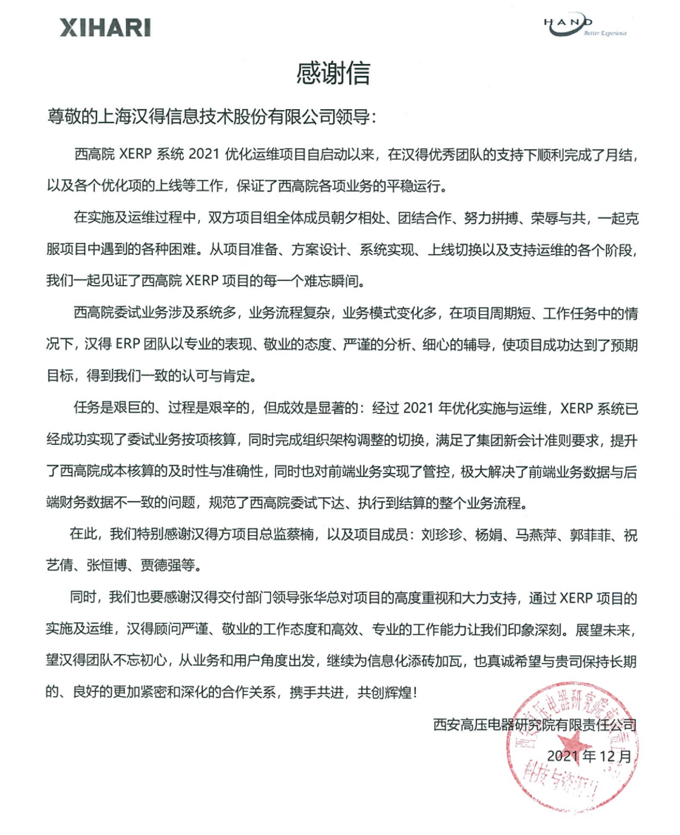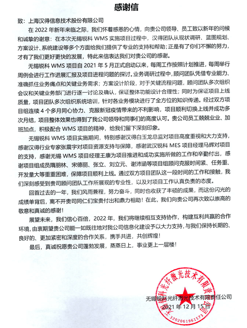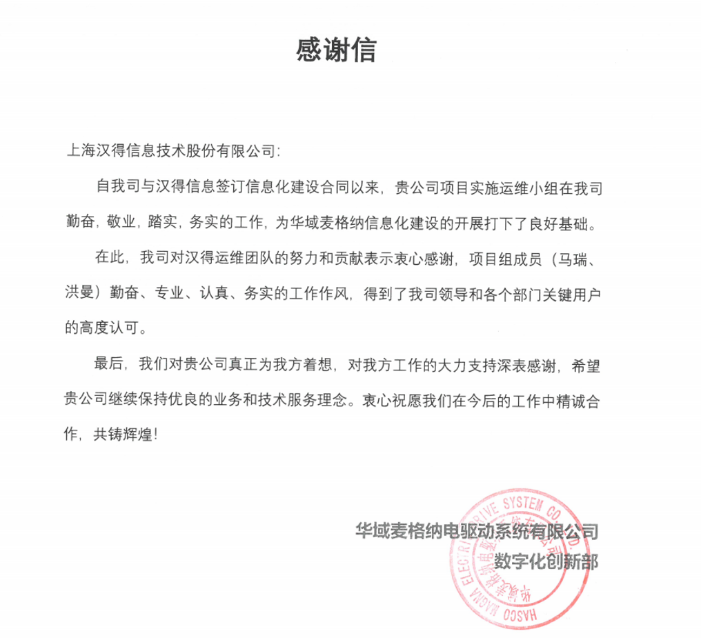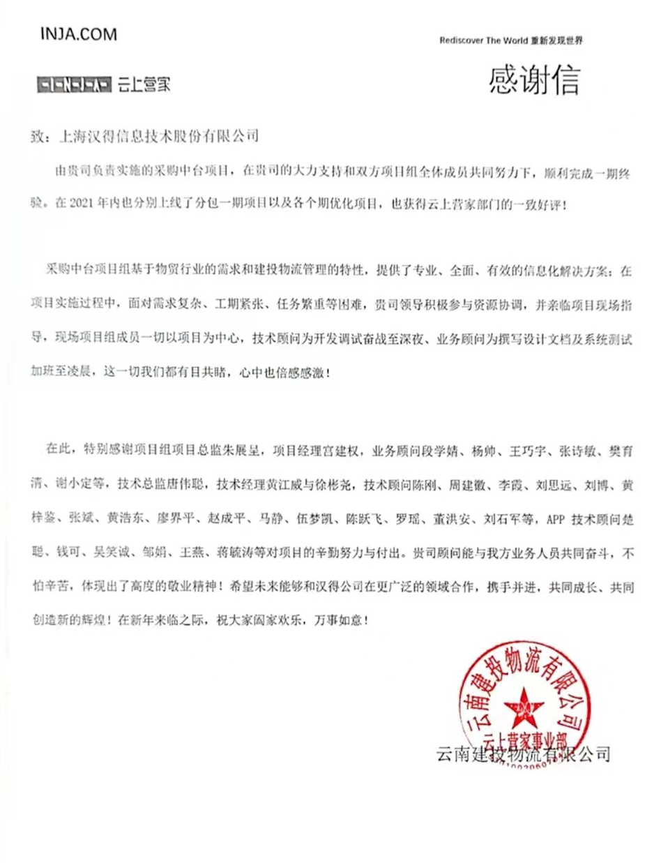 “过去一年,我们在陪伴企业数字化转型的道路上,坚持自主创新,努力自我进化,将服务能力‘进化’成更高形态。 当数字化领域不再有低垂的果实,面对企业在各领域数字化转型的复杂挑战和不确定性环境,能够互相支持,携手同行的唯有坚持长期发展、长远价值的伙伴。 士以弘毅,感怀重托长相伴;任重道远,励将荆棘踏坦途。 汉得感怀客户重托,唯有不断努力超越自我,持续提升服务能力,在每一个客户的数字化转型项目上,坚持创造以‘软件工具扎根企业业务环境’的核心价值,以‘提供行业特征和管理经验的知识沉淀咨询服务’的形式价值,以‘陪伴企业持续进化促进变革发生’的情绪价值,感谢企业客户的信任托付!” —— SAP咨询服务事业部总经理 智协供应链事业部总经理 陆嫕颖 智协供应链 以下收录了部分客户感谢信 << 滑动查看下一封感谢信 >> 烽火通信 经过烽火通信项目组成员和汉得SRM顾问团队共同奋斗,同心协力,通过SRM项目重新梳理整合了采购管理业务流程,提升业务管理水平,提高烽火通信的信息化水平,从初夏到冬至,解决了一个又一个问题,度过了一个又一个难忘的日夜,项目组的辛苦我们看在眼里记在心上,随着烽火通信SRM项目逐步推进,目前处于系统上线准备的阶段。在此对于给予项目大力支持和付出辛勤劳动的顾问们表示由衷的感谢! 中电科电子装备 在中电科SRM项目实施过程中,汉得顾问严谨、敬业的工作态度和高效专业的工作能力让我们印象深刻。展望未来,我们衷心希望能与贵公司一道紧密合作,与贵司建立更加长久而愉快的合作关系,共同向着助推中电科电子装备集团以及旗下子公司成为世界一流的行业领军企业的愿景前进! 一汽大众 我们一起见证了一汽-大众企业电子商城项目的每一个难忘瞬间及每一个里程碑的取得,借助企业电子商城平台我们有信心进一步提升MRO采购管理能力,全面提升信息化水平。经过商城项目的实施,对协议引入、商品管理、费用申请、预算控制、审批、下单等业务进行了全面的定制和开发,覆盖了一汽-大众MRO品类全部领域,显著提升了一般采购管理熊力,很多创新性解决方案的落地也极大地提高我司MRO各品类采购作业的效果。 昆山农商银行 经过这段时间和贵公司的合作,贵公司的SRM系统能够根据业务需求进行灵活调整,将系统功能与实际业务进行有效融合,将各部门的采购需求进行汇总和推进,实现了采购申请预算的跟踪和管控,将招投标流程标准化、规范化,并且通过系统实现与供应商的线上对接,对于行方的供应链管理来说实现效率上的突破和流程上的创新。 华润九新药业 因为信任,所以同行。汉得品质,九新见证。真挚感谢,辛劳付出。展望未来,共铸辉煌!贵司项目组顾问从实际业务需求出发,结合以往的实施经验,克服种种困难,提供优质专业的咨询服务和相应的解决方案,全方位、多视角应对我司的管理及业务变更,积极推进项目的实施与落地。通过SRM平台的优化,提升合规的管理监控水平,加强合规的控制,提升合规整体运作效率。 润联科技 贵公司驻派润联采购团队的项目组成员,在我团队工作已经一年有余,贵公司顾问与我团队成员紧密配合、团结协作,在我司多个项目中均表现出超强的专业能力和敬业精神。 万家乐 项目团队成员本着高效、高质量完成的态度,协助快速解决项目中出现的问题,根据现场的实际情况,与信息部门和业务部门联系、沟通、讨论,及时给出解决方案,为项目的顺利进行提供先决条件,起到了很好的桥梁作用。 云南建投 由贵司负责实施的采购中台项目,在贵司的大力支持和双方项目组全体成员共同努力下,顺利完成一期终验。在2021年内也分别上线了分包一期项目以及各个期优化项目,也获得云上营家部门的一致好评! 盈峰环境 任务是艰巨的,过程是艰辛的,但是成果是显著的,项目组基于我司业务需求及行业特性,提供了专业全面有效的信息化解决方案,历经五个月的项目实施,成功搭建并正常推行SRM 2.0 平台,显著提升我司采购业务管理水平。 SAP咨询服务事业部 以下收录了部分客户感谢信 << 滑动查看下一封感谢信 >> 福玻斯 在项目实施过程中,汉得团队与福玻斯各部门及高层领导都保持紧密联系,积极沟通,无论是调研阶段的现场走访,还是方案阶段的耐心讲解,都展现出专业的顾问素养以及高度的敬业精神。 国际物流 汉得项目组基于我司业务需求及行业特性,提供SAP专业、全面、有效的信息化解决方案,本次项目SAP ERP实施实现了物流物流供应链行业煤炭、钢材等端到端管理。特别是合同管理实现了从合同到进销存到业财一体化,再到资金收付管理等闭环,实现ERP线上化,标准化,集成化管理。 国酿食品 本次SAP ERP实施建设起统一的业财一体化平台,通过产供销计划联动,实现销售订单与需求计划,采购计划,生产计划的高度融合。感谢汉得公司对我司信息化建设的大力支持,期待以后与汉得公司的长期愉快的合作! 海正生物 海正生物SAP项目自正式启动以来,双方项目组全体成员朝夕相处、团结合作、努力拼搏,一起克服各种困难,从春天走到冬天,我们共同见证了一期、二期的每一个难忘瞬间。在项目周期紧张,任务重的情况下,汉得SAP实施团队以专业的表现、敬业的态度、严谨的分析、细心的辅导,使项目成功上线,获得我司一致的认可! 航天长征火箭技术有限