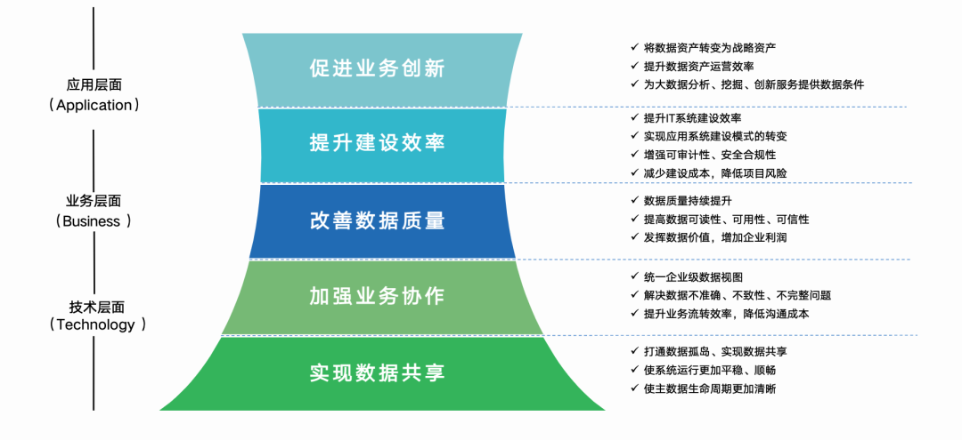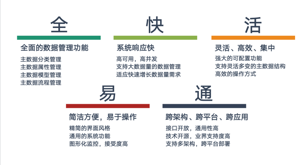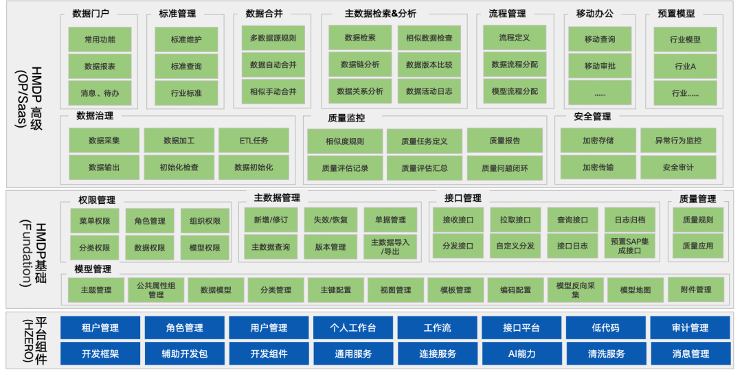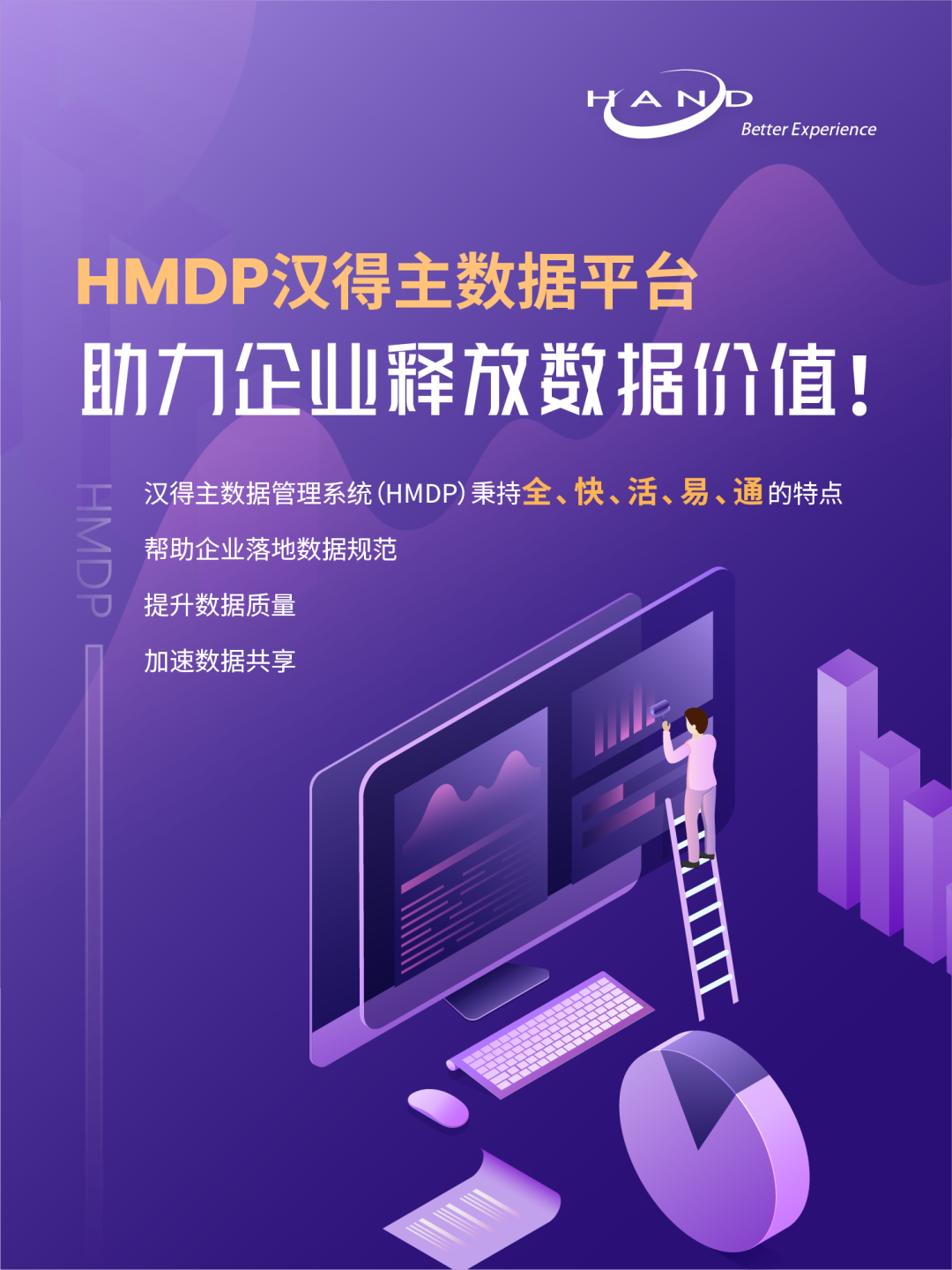 当前数字化转型时代,企业对于数据信息化的需求已从简单的记录与查看,升级为数据拉通共享与链路分析。 主数据作为企业中最具高价值、高共享特征的黄金基础数据,其管理规范与共享在企业中显得极为重要。 企业该如何规范黄金数据, 实现数据拉通共享呢? 企业面临的现状与痛点 数据维护 无统一维护源头,无统一维护规范,信息系统支撑缺乏,影响业务开展效率。 业务运营 数据分散在价值链的多个阶段,不能满足业务需求,不能跨组织传播。 数据标准 没有统一的经营主数据标准和管理规范,没有明确的数据范围、含义、要求。 数据质量 数据质量不高,存在不及时、不准确、不完整的问题。 决策支持 未形成数据闭环,无法提供及时、准确的分析见解,决策可信度较低。 技术框架 技术架构落后,难以满足业务需求和扩展需要。 HMDP汉得主数据平台 助力企业实现数据价值 汉得主数据管理系统(HMDP)是基于HZERO微服务架构平台,由多个应用组件通力构成,是一款面向企业灵活的、全面的、智能的综合主数据管理平台。 为企业各类主数据标准、数据建模、数据全生命周期管理、数据质量校验、数据合并、数据关系、流程审核、数据集成等提供一体化平台化支撑,确保企业主数据的及时性、完整性、有效性、准确性、一致性,持续提升数据质量和主数据应用能力。 产品预置多套行业标准数据模型与主流SAP系统集成接口,既可以与企业已建系统高度融合,同时具备极强的通用性,可广泛适用于各行企业。 主数据管理价值 蛰伏深耕 迭代演进 2016年汉得主数据产品 HMDM 第一版 (HAP) 正式发布,历经5年的主数据交付项目不断打磨、迭代、优化,如今“脱胎换骨”升级为微服务版本的 HMDP(HZERO) 汉得主数据平台。 HMDP-产品演进历程 五大优势解决企业难题 01 功能优势 预置行业标准模型优势 融入了多个行业常见主数据标准模型,为企业主数据标准提供参考依据,可直接使用。 灵活而全面的主数据建模支持 全面支持产品、客户、供应商、人员、组织等企业各类型主数据管理,可根据企业实际业务灵活配置主数据模型,主数据类型不设限。 贯穿始终的主数据生命周期管理 提供可视化主数据的生命周期管理,直观展示数据来龙去脉。记录各阶段主数据版本变化,方便历史追溯,保证主数据系统的权威性和可靠性。 细粒度化的主数据安全访问 内置基于角色的组织访问权限、功能权限、数据管理权限设定,针对数据访问权限颗粒度细化至增、改、查、组织扩充,保证主数据安全。 开放的API与预置接口 内置开放的API,支持灵活的接口服务注册、接口映射、数据转换,支持多种接口类型(接收、分发、查询、拉取)无需额外开发按需配置即可使用。同时预置SAP集成接口,可快速实现与SAP系统间主数据集成。 02 架构升级 微服务架构 每项服务都是独立而灵活的,可以提高服务的重用性。 开箱即用的通用服务组件 如权限认证服务,数据一致性服务、数据清洗服务等。 满足高并发、大数据处理业务场景 对于高并发应用的功能,可基于领域拆分微服务,并针对微服务独立、灵活扩展服务器资源 支持SaaS多租户应用搭建 平台按照多租户应用模式设计开发,支持企业搭建自己的主数据SaaS平台 产品功能概览 HMDP-产品功能 平台组件 使用 HZERO 公共组件,满足多元化主数据应用需求 基础功能 支持自定义主数据模型、编码规则以及主数据全生命周期管理,如: 模型搭建:可视化搭建多层级结构,维护模型的分类、编码、页面样式 权限管理:基于角色分配多维度权限,实现数据及维护权限屏蔽 质量规则:基于字段级的校验规则,实现数据维护前后的质量把控 主数据维护:新增、变更、失效、恢复、版本记录、工作流驱动审核 四种类型接口:采用0开发自定义接口,实现数据双向传输 高级功能 围绕主数据、数据治理提供多维度数据质量管控能力,如: 数据门户:预置多种报表卡片,自定义设置门户内容与排版 数据标准:管理数据标准、管理标准、质量标准 数据合并:对多数据源数据项进行自动合并,对相似数据进行手动合并 数据分析:支持数据链路分析、版本对比分析、数据活动日志 流程管理:采用自研工作流,灵活定义流程图 预置模型:基于行业标准,预置各行表数据项标准模型,实现快速交付 数据治理:数据加工采集,提升初始化数据质量 质量监控:定期执行存量数据检查,输出数据质量报告 安全管理:自定义前后端加密方式,保障数据安全
