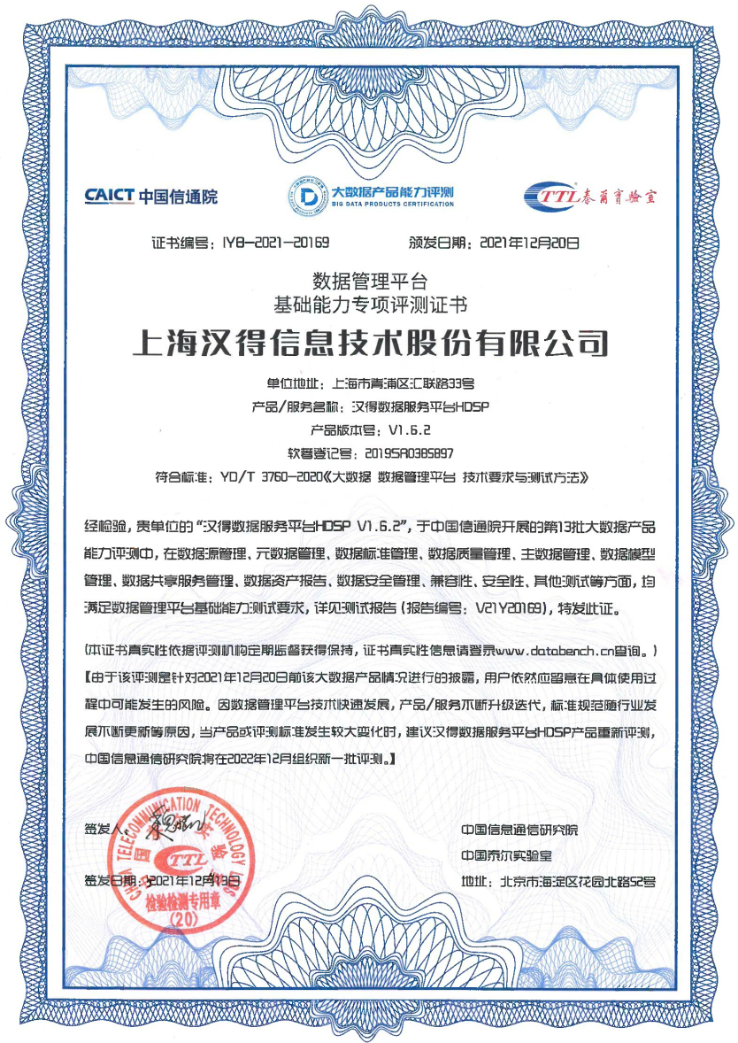 2021年11月,中国信通院第十三批大数据产品能力评测线上评审会圆满结束,本次评审会上,汉得数据服务平台HDSP 顺利通过中国信通院大数据产品能力评测。 此次测评主要对汉得数据服务平台HDSP的数据源管理、元数据管理、主数据管理、数据模型管理、数据标准管理、数据质量管理、数据安全管理、数据资产管理、数据共享服务、兼容性、安全性等功能进行了全面、专业且严格的评测,最终汉得数据服务平台HDSP凭借着自身多年来持续的技术革新,以及数据管理的实践经验,被授予中国信通院第十三批大数据产品评测证书。 这充分肯定了汉得数据服务平台HDSP在大数据行业领先的技术能力,同时也标志着汉得数据服务平台HDSP迈入了一个新的发展阶段,HDSP平台也将与其他大数据平台携手,共同推进大数据行业发展与进步。 中国信通院第十三批大数据产品评测证书 此次大数据产品能力评测于2021年10月11日开始进行评测,在为期近30天的评测过程中,评测专家组先后对数据源管理、元数据管理、数据质量管理、数据标准管理、主数据管理、数据模型管理等13项评测项目,54个功能点进行了严格评测,并进入了最后的评审答辩环节,最终专家组一致认为,汉得数据服务平台HDSP 通过中国信通院大数据产品能力评测,获得中国信通院的权威认证。此次还有阿里云计算有限公司、天翼云等14家平台参与了评测。 本次汉得数据服务平台HDSP被授予大数据产品能力评测证书,意味着汉得数据服务平台HDSP产品的专业度以及技术实力得到了充分的认可与肯定。汉得数据服务平台HDSP将会继续在大数据领域钻研,持续不断地进行技术革新,并结合客户实际业务需求及管理诉求,力争为用户创造更大的价值。 未来,汉得数据服务平台HDSP将与您携手并进,助力企业数字化转型升级,合力为您的企业打造数据价值链生态闭环,实现降本增效。 中国信通院大数据产品能力评测工作于2014年由中国信通院牵头发起,一直致力于推动我国大数据产品技术的不断发展,为我国数字化体系建设奠定坚实的基础。经过历时7年的发展,中国信通院“大数据产品能力测评”已经成为中国大数据领域权威的第三方评测机构,也逐渐成为厂商产品研发和用户采购选型的风向标。 HDSP 汉得数据服务平台 汉得数据服务平台HDSP,提供数据全生命周期管理一站式服务,辅助整合企业内外部业务数据、半结构化与非结构化数据,方便企业快速挖掘数据价值,对内外提供数据应用与服务能力,助力企业快速搭建自己的数据中台,协助企业合力打造数据价值链生态闭环,帮助企业实现降本增效。 ▲ HDSP产品功能架构 组件化 微服务架构 插拔式驱动 对异构数据源实现结构化解耦 低成本 非技术人员1~2小时即可掌握完整的数据研发流程,可视化配置化的工作模式,屏蔽底层技术组件,节省巨大的学习成本 高性能 亿万数据秒级响应 查询引擎、计算引擎灵活选型 支撑高并发场景 灵活性 基于技术中台Hzero研发,和技术中台天然融合,同时兼具技术中台属性 能快速响应客户需求,进行二次开发 源代码可有偿开放,企业能更好掌控产品 应用性 多种应用能力,全面覆盖各个行业 支撑用户个性化上层应用,满足用户其他定制化应用需求 权威性 HDSP产品通过中国信通院、中国软件网等多方权威机构认证 荣获多项产品奖项 信通院大数据委员会成员