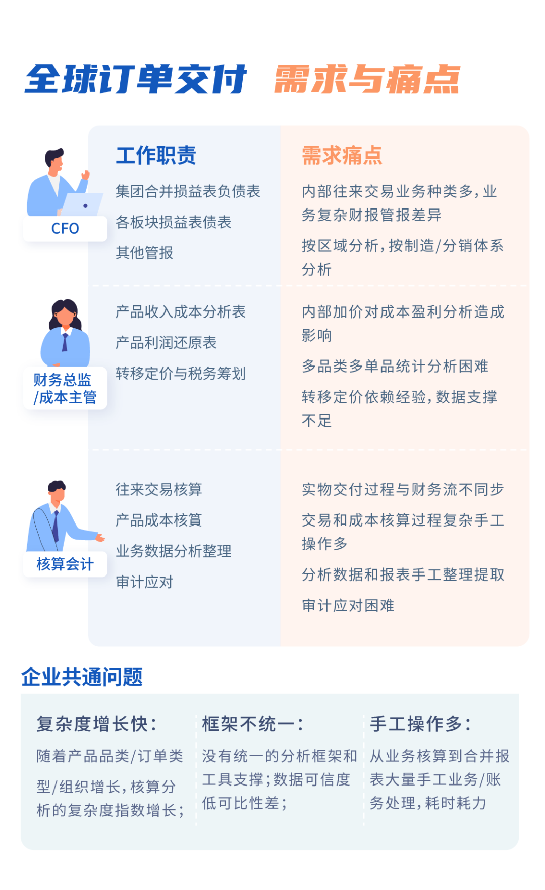 富邦的CFO向我们描述到他们日常工作的难点:制造组织经销售组织交付最终客户;实物交付过程与财务流不同步。交易核算过程复杂,审计应对难度大;