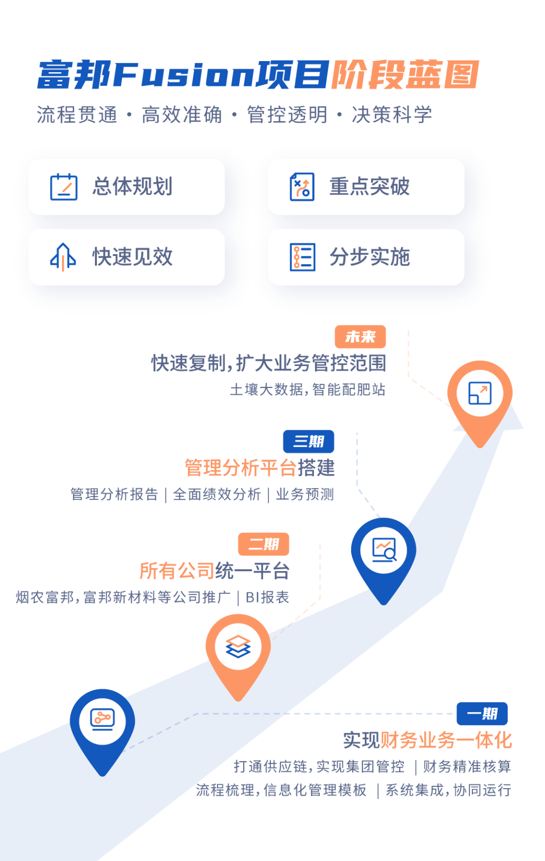 湖北富邦肥料助剂创新者,数字农业引领者湖北富邦科技股份有限公司(股票代码:300387)是一家利用新材料、新工艺、新技术、大数据、人工智能等方式服务现代农业的国家高新技术企业,是中国肥料助剂创新者,是中国数字农业引领者。中国肥料助剂创新者富邦以化肥生产链为价值导向,为化肥生产企业提供包括高品质的助剂产品、优良的全程技术服务及精确的助剂自动控制系统的整体解决方案。富邦的客户遍布全球,享有较高知名度与影响力。公司拥有行业内领先的研发水平,已取得国内专利130项、国外专利3项,另有数百项发明专利已被国家知识产权局受理,已申请19件PCT专利。中国数字农业引领者公司在做好化肥助剂产业的同时,积极向数字农业方向升级。公司控股子公司加拿大SoilOptix所掌握的非接触式土壤检测 SoilOptix技术,能够实现大规模、低成本及高实效的完成土壤检测任务,通过独有的人工智能大数据挖掘算法,形成高精度的土壤数字地图,是公司目前农业大数据领域的重要战略方向。公司以数字农业为发展战略,利用互联网+智能制造设备,打通“线上下单、云端配肥、线下生产、全程服务”的新模式,实现透明化、标准化、智能化和数据化。为国内新型农业经营主体提供包括农业信息感知、定量决策、智能控制、精准投入、个性化服务的整体服务方案。选择Fusion选择全球化布局快速发展在ERP的选型上,经过了多个产品的了解与比较,富邦最终选择了Oracle Fusion ERP。规范业务 业财一体在富邦董事长王仁宗看来,在富邦全球化布局发展的过程中,Oracle Fusion系统满足企业管理需求,构建业财一体化的管控平台。规范各分子公司的业务,提高公司的透明度,让企业得以轻装上阵、快速前行。适配各种业务场景从业务角度看,Oracle系统内置最佳业务实践,其解决方案的成熟性在全球范围内被大量的客户所验证,适配富邦集团的各种业务场景。应对多元企业发展要求从财务角度看,作为多国经营的上市公司,系统需要支持不同国家会计准则的自动转换,权益抵消及往来交易抵消等一系列工作,从而实现准确、及时、透明地出具财务报表,满足公司月结、财务分析要求。支撑企业全球化发展富邦业务全球化不断深化,Oracle 云产品可以在系统的拓展性与规范性上提供支持。并且公司IT系统团队人员少,应对传统的OP(On-Premises)部署方式有压力,云模式能够很好地解决这个问题。汉得整体解决方案富邦Fusion项目富邦的CFO向我们描述到他们日常工作的难点:制造组织经销售组织交付最终客户;实物交付过程与财务流不同步。交易核算过程复杂,审计应对难度大;转移价格在销售链条上不断加成,对产品盈利分析产生干扰。要通过管理转移定价,从集团角度需要还原真实的产品利润进行分析……汉得整体解决方案的应用,有效提升用户效率,自动化处理关联交易的账户,同时解决了需要进行多层次的内部往来抵消的难点。Oracle ERP可以使企业业务流程化、规范化,并能够有效支持富邦的全球化拓展,和海外兼并收购中存在的复杂关联交易的问题。集团管控与服务能力应对包括多板块、多业态、多公司等多元企业发展要求,构建财务标准化,适配集团各种业务场景供应链运营的业财融合前端统一的供应链平台,助力企业上下游拓展能力,后端业务财务融合可追溯,强化管理成本核算及管理能力作为生产型企业,需要构建完整的成本核算、分析体系,助力精细化管理,高效核算全球化发展支撑拓展海外市场,统一全球化平台、适应不同国家的财务报告,税务合规、法规监管全面智能化分析平台面对不同的管理用户及分析,围绕业务指标,快速构建全业务数据分析平台分阶段实现数字化蓝图一期&二期阶段流程、制度系统相结合全面推广富邦ERP为经营管理带来更多价值,将规范的管理流程固化到ERP系统中,为富邦的信息化全面拓展和深化奠定基础ERP深化应用基于已固化的流程,进行子公司的推广实施。同时根据用户需求,进行优化项开发实施,提升用户体验成本核算及管理能力作为生产型企业,需要构建完整的成本核算、分析体系,助力精细化管理,高效核算提升经营管理能力支撑拓展海外市场,统一全球化平台、适应不同国家的财务报告,税务合规、法规监管三期阶段建设一个多维、灵活丰富展示、可钻取的绩效分析平台,并建立初步的绩效分析体系,为未来绩效考核、预算管理等绩效管理深化应用奠定基础。主要围绕销售、采购、库存、财务及生产五大主题进行分析体系梳理和分析指标建设以周为数据统计频率,搭建管理驾驶舱及图表展示平台。同时支持Web端的数据展示和下钻分析以及移动端的分析查看未来阶段富邦可能会继续扩大业务范围,快速复制推广子公司系统上线,以及增加与外围系统的集成,包括银企直连,金税平台对接等等。富邦将继续与甲骨文&汉得合作,打造数字化、统一、高效的平台。“企业要做到管理创新,做好数据处理,来迎合大数据时代。公司的转型首先是从业务数据、部门数据转型,然后通过Oracle系统,转化成大数据,进而转化成公司发展的能源和动力,提升每个部门的效益,提升整个公司的发展。”——富邦董事长 王仁宗