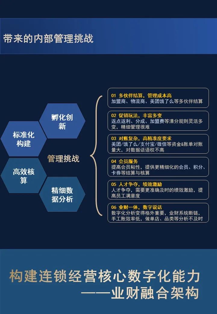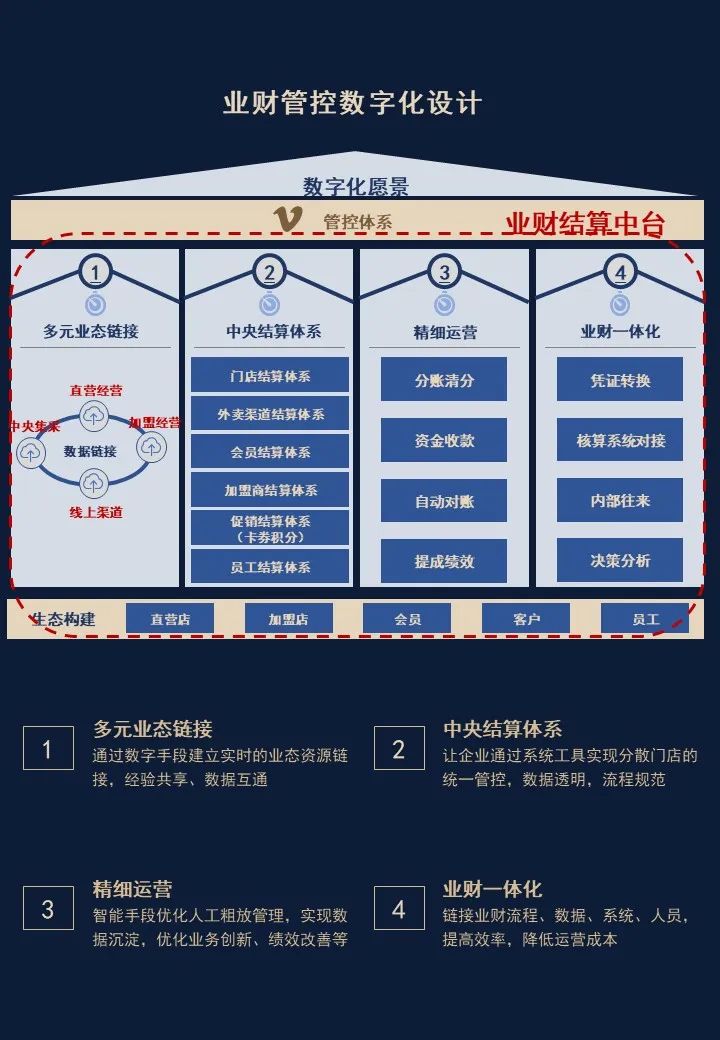 通过打通业财系统,帮助企业实现业财资源的整合与共享、财务中台能力的沉淀;通过建立统一结算平台,帮助企业实现清分结算自动化,支撑业务变化与拓展