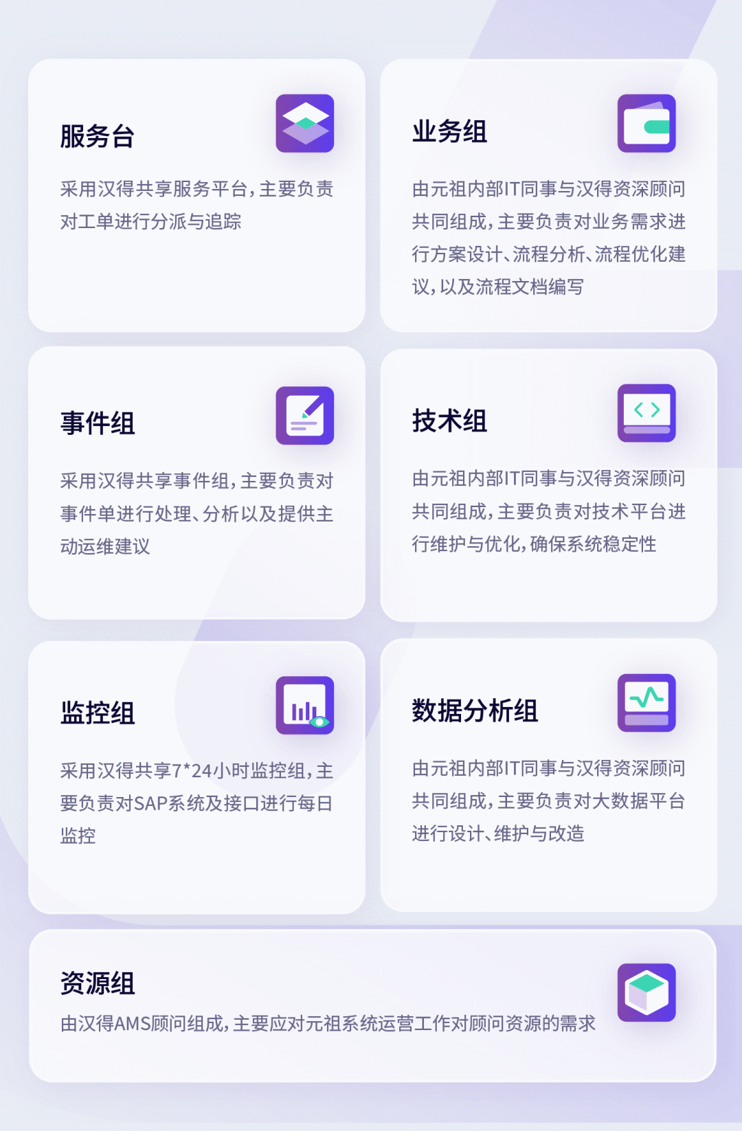 汉得AMS团队的加入,大大释放元祖内部IT同事的运维压力,使得内部IT同事可以将主要精力投入到业务精进、项目管理、新技术研究等更具有IT价值的工作中,从而更好地承担IT对业务的支撑作用,帮忙企业实现数字化转型和业务战略目标。