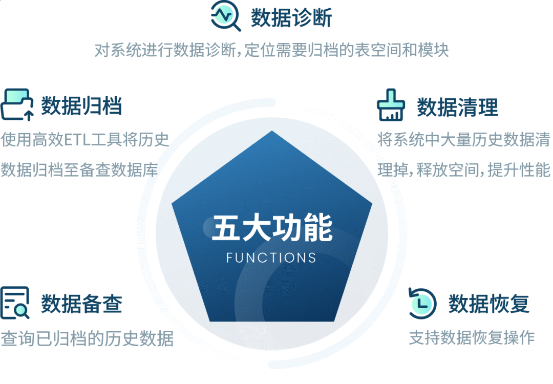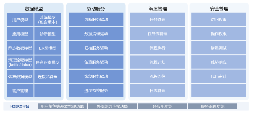 汉得数据归档解决方案基于汉得技术平台(HZERO)提供数据诊断、数据清理、数据归档、数据备查、数据恢复等一体化平台支撑。