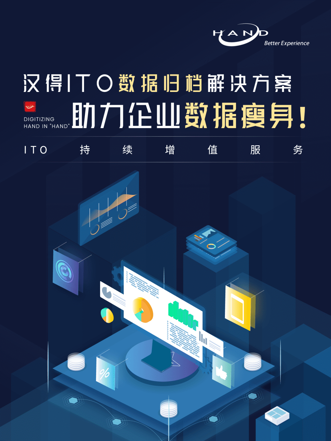 企业面临数据持续增长风险系统性能下降系统程序报表运行越来越慢,月结效率越来越低,拉长月结时间,用户体验越来越差。硬件成本浪费历史数据占用大量的软硬件资源,导致资源不足,对硬件的要求越来越高,需不断购买提升硬件,导致未来IT软硬件投资支出持续增大。系统风险增加系统越来越不稳定,安全隐患增加,日常的克隆、备份、恢复时间增长,增大宕机的可能。影响业务需求进度随着系统运行时间和业务的扩展,系统数据量越来越多,结构越来越复杂,增加新需求评估的难度,无法及时响应新业务需求。重磅发布汉得数据归档解决方案汉得数据归档解决方案基于汉得技术平台(HZERO)提供数据诊断、数据清理、数据归档、数据备查、数据恢复等一体化平台支撑。产品与主流EBS系统集成接口,具备极强的通用性,开箱即用,可广泛适用于各大企业。依托国际标准方法论实施数据归档ISO(国际标准化组织)推出第一个IT治理的国际标准:ISO 38500,目前,ISO/IEC 38505-1《基于ISO/IEC 38500的数据治理》已正式发布,其中主要内容就包括数据集成管理类型的数据归档。提出数据集成管理框架(包括目标、原则和模型)以帮助治理主体评估、指导和监督数据利用的过程,建议企业也与时俱进,把握时代转型浪潮,提升自身的数据集成管理能力与国际接轨,提前在市场上取得先发优势,为企业数字化转型提供强劲动力,为未来的数据业务提前布局、奠定基础。汉得ITO团队数据归档解决方案特点汉得数据归档解决方案拥有大量的标准组件,针对EBS套件产品的标准模块,实现自动化快速部署,极大节省时间成本以及人力成本。归档产品支持的EBS模块范围归档产品实施后效果显著某制造企业数据归档前后对比汉得作为企业数字化综合服务商,将始终秉承成为连接企业管理与信息技术的桥梁的使命,助力企业实现全面数字化转型,以信息化手段帮助客户提高组织的运营效率、效益与竞争能力,实现客户价值。