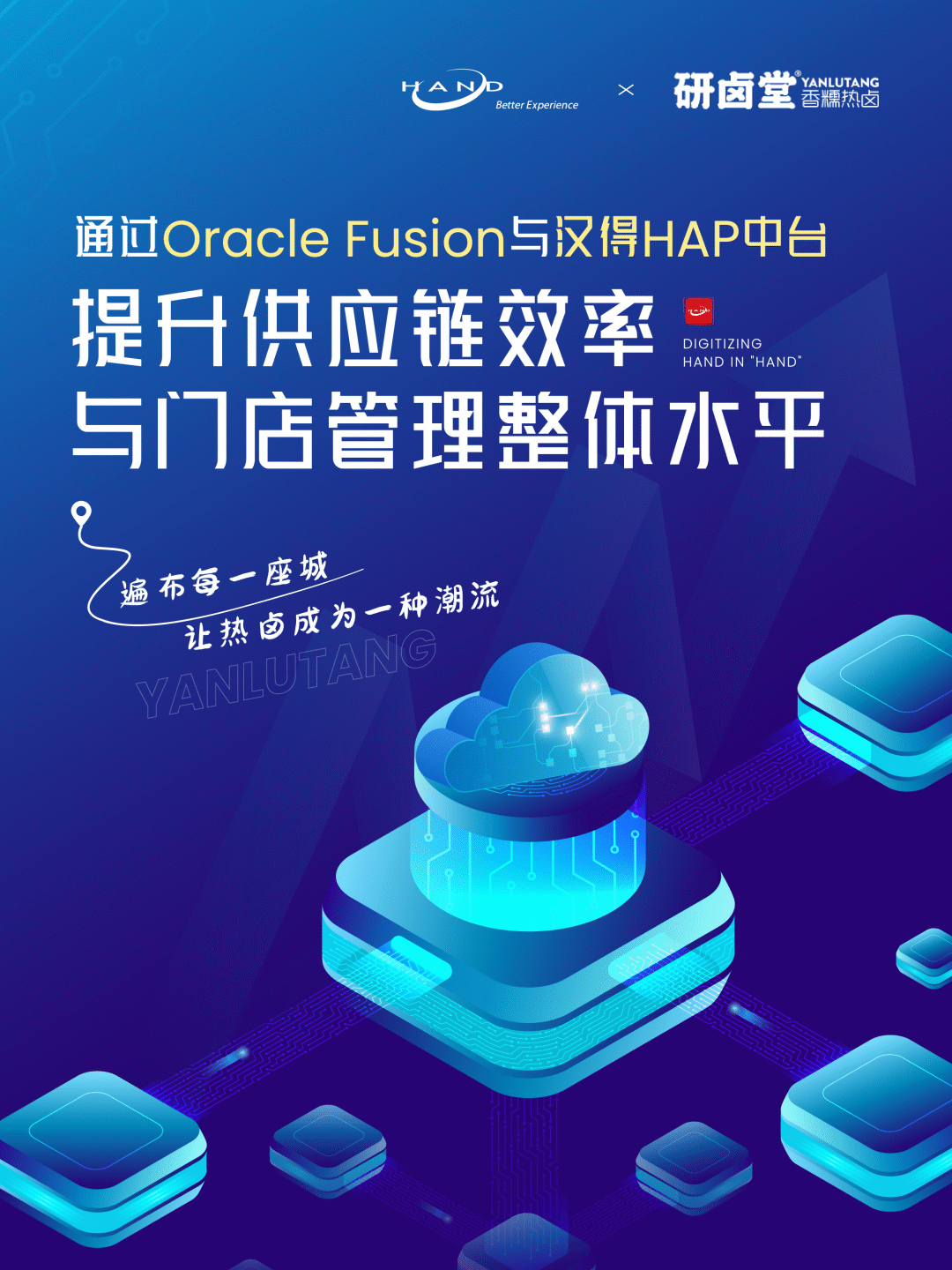 研卤堂遍布每一座城,让热卤成为一种潮流研卤堂成立于2018年,是武汉乐美缘餐饮管理有限公司旗下一家专研“香糯热卤”的潮范小吃品牌。研卤堂的第一家门店于2019年夏天在武汉天地正式开业,短短1年间便火遍武汉三镇,成为武汉美食榜单TOP级选手。研卤堂在成立两年有余的就已冲出武汉,落地北京、上海、苏州、南京、澳门等50多个国内核心城市。并于2021年底完成由华映资本投资的数千万元A轮融资,将用于重点打造专业团队,深耕产品研发和数字化升级。作为最早一批聚焦热卤赛道的新锐品牌,研卤堂在近年间,也荣获了各类行业奖项。2021年至今年初,研卤堂在《2021中国新品牌浪潮大会》上荣获消费品类2021中国最具价值新品牌食品TOP榜,印证品牌价值。同时荣获餐饮业内的头部媒体-红餐网颁发的2021年度中国餐饮最具商业价值品牌。毋庸置疑,研卤堂的快速成长已成为热卤赛道在后疫情期加速爆发的主角,热卤品类也在这些玩家的推动下不断迭代。而速度背后,核心竞争力的打造也关乎新品牌们能否走得更稳、更远。选择Fusion选择数字化布局快速发展在ERP的选型上,经过多个产品的了解与比较,研卤堂最终选择了Oracle Fusion ERP。规范业务 业财一体在研卤堂创始人莫世科看来,在研卤堂在快速布局发展的过程中,Oracle Fusion系统满足企业管理的需求,构建业财一体化的管控平台。规范各分子公司的业务,提高公司的透明度、让企业得以轻装上阵、快速前行。最佳业务实践从业务角度看,研卤堂是“直营+加盟”的模式,Oracle系统搭配汉得中台,实现最佳业务实践,其解决方案的扩展性、成熟性,为未来业务飞速打下坚实的基础。满足多样化需求从财务角度看,应对餐饮行业的特殊性以及支付场景的多样化,Oracle及汉得中台为各分子公司实现准确、及时、透明地出具财务报表,满足公司月结和财务分析要求。云模式可扩展性强研卤堂业务模式不断深化,Oracle 云产品可以在系统的拓展性与规范性上提供支持。并且公司IT系统团队人员少,应对传统的OP(On-Premises)部署方式有压力,云模式能够很好地解决这个问题。项目收益重点方案举例门店营销数据与后端ERP集成为满足客户的业务要求,解决众多门店的应收数据汇总困难以及要货困难的痛点,结合研卤堂的门店管控的品牌要求,实施团队和客户一起探讨提出“轻前端+强中台+稳后台”总体方案。此方案在前端应用保持操作不变的前提下,结合Oracle和HAP系统进行深度集成,极大提升用户效率,自动化处理前端POS应收数据,同时也解决门店要货手机端与ERP后端的集成问题。Oracle ERP+HAP可以使企业业务流程化、规范化,并能够有效支持研卤堂的门店拓展和财务核算自动化。分阶段实现数字化蓝图一期&二期阶段前后端系统相结合全面推广研卤堂ERP为经营管理带来更多价值,将规范的管理流程固化到ERP系统中,为研卤堂的信息化全面拓展和深化奠定基础。ERP深化应用基于已固化的流程,进行分子公司的推广实施。同时根据用户需求,进行优化项开发实施,提升用户体验。提升经营管理能力以管理层的视角,基于当前的组织架构,进行分析性报表及可视化报表的开发。以提升日常分析效率及领导层实时接收的需求。提升全局运维能力着重发力「数字化、信息化」的建设,线上运营团队搭建、供应链ERP系统升级优化、前中后台的数据打通。搭建数字化系统,将所有信息整合起来,实现全局的指数运维分析。▲研卤堂运维管理视图三期阶段建设一个多维、灵活丰富展示、可钻取的大数据BI系统平台,并建立初步的业务分析体系,为未来建店模型、菜品研发管理等深化应用奠定基础。主要围绕销售、采购、库存、财务及门店五大主题进行分析体系梳理和分析指标建设以周为数据统计频率,搭建管理驾驶舱及图表展示平台。同时支持Web端的数据展示和下钻分析以及移动端的分析查看未来阶段研卤堂将持续与甲骨文&汉得合作,一起打造数字化、统一、高效的平台。“2020年当团队准备全力布局品牌时,却遭遇突如其来的疫情,一方面给餐饮经营增添压力,另一方面给了我们修炼内力的时机。团队放下所有拓展计划,做品牌的内核优化,从线上平台到线下门店、从品牌定位到门店形象、从产品 SKU 设计到消费者体验,全面提升自己的品牌力。尤其2021年,品牌着重发力「数字化、信息化」的建设,搭建数字化系统,将所有信息整合起来,实现全局的指数运维分析。完成了线上全套系统的自建工作——线上运营团队搭建、供应链ERP系统升级优化、中台与前端数据打通。一套动作下来,使得品牌在市场上先发先至,优势点不断凸显。数字化把控之下,门店的运营成本降低、利润空间放大的同时,高标准的安全食品被送达顾客手中。至此时,研卤堂已发展至全国200家门店,希望在后疫情时代,研卤堂越做越好。”——研卤堂创始人莫世科
