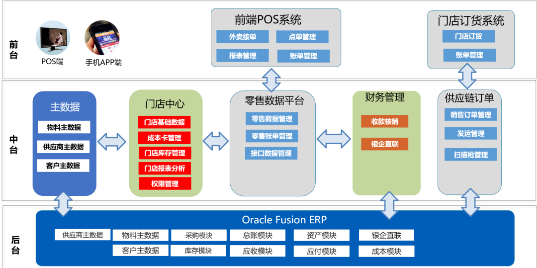 为满足客户的业务要求,解决众多门店的应收数据汇总困难以及要货困难的痛点,结合研卤堂的门店管控的品牌要求,实施团队和客户一起探讨提出“轻前端+强中台+稳后台”总体方案。