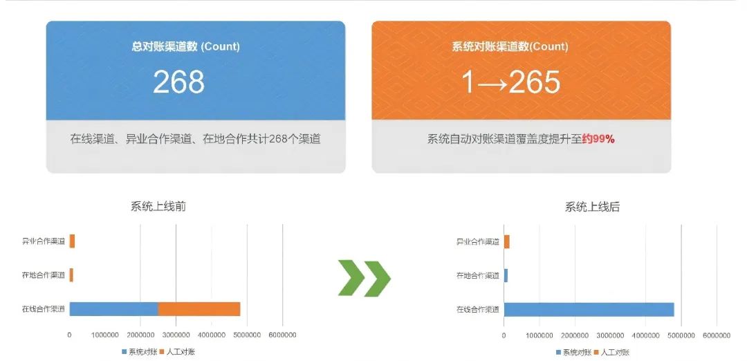 在线渠道、异业合作渠道、在地合作共计268个渠道,构建完整的结算规则体系,自动根据预置规则生成我方账单数据;自动获取部分渠道的三方账单;完成双方数据自动对账,系统自动对账渠道覆盖度提升至约99%,并引入消息通知、工作流等功能逻辑,实现业财联动,快速响应新业务的交易结算及数据分析需求。