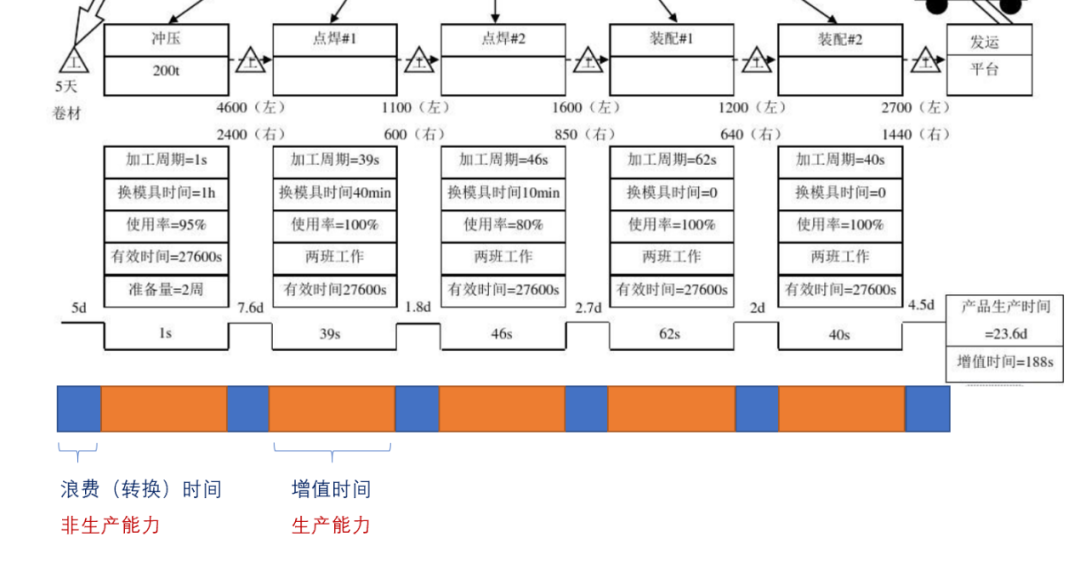 【例】如下图所示 ,某企业生产一件产品需要23.6天,其中增值时间为188秒(在HCM中定义为生产能力),浪费时间为23.6天(在HCM中定义为非生产能力)。