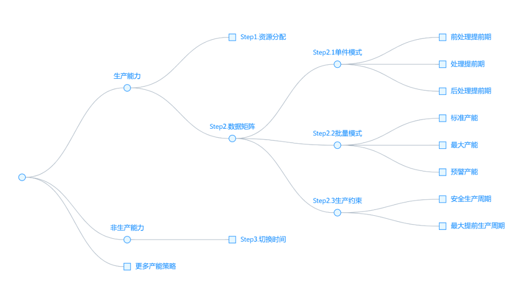 注:当然,从逻辑上来说也可以只保留一个最细的维度,直接设置C产线产能为8S,D产线产能为10S,E产线产能为8S。但如此模型的稳健度下降,当B车间又增加一条标准线F时,如果是原先两层的模型的话产能数据不需要改动,而只保留一层的模型需要补充设置产线F产能为8S。