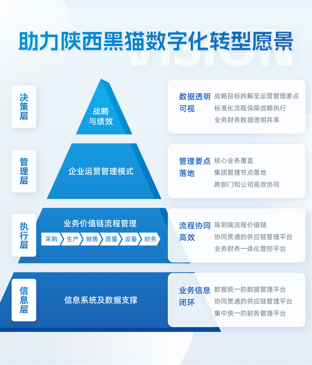 通过信息化手段,陕西黑猫希望在大幅提升集团管控能力的同时,有力促进各个产业板块的专业化和规模化发展,为集团公司的整体战略提供信息化支撑。