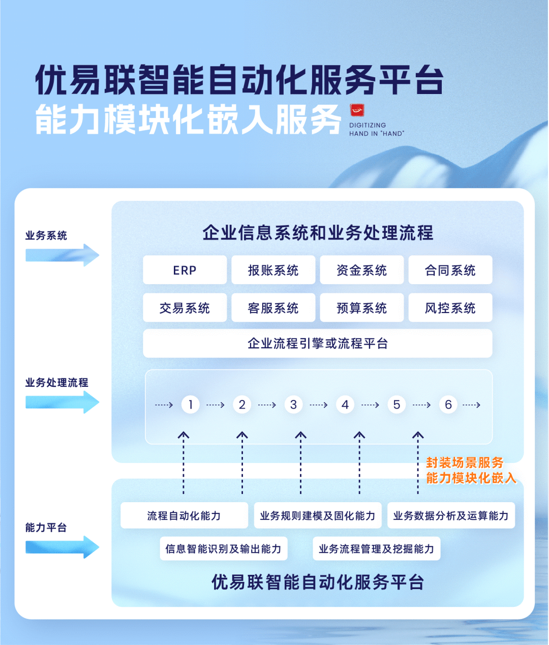 平台提供可选择、模块化、即配即用的数据集成、信息标识、AI识别、规则建模、数据分析、RPA、流程挖掘等信息技术服务,可以灵活、即时、轻代码地将模块化的服务嵌入到企业业务处理流程中,增强业务流程各个环节的智能化和自动化能力,解决企业数字化转型需求碎片化、整合落地难等问题。