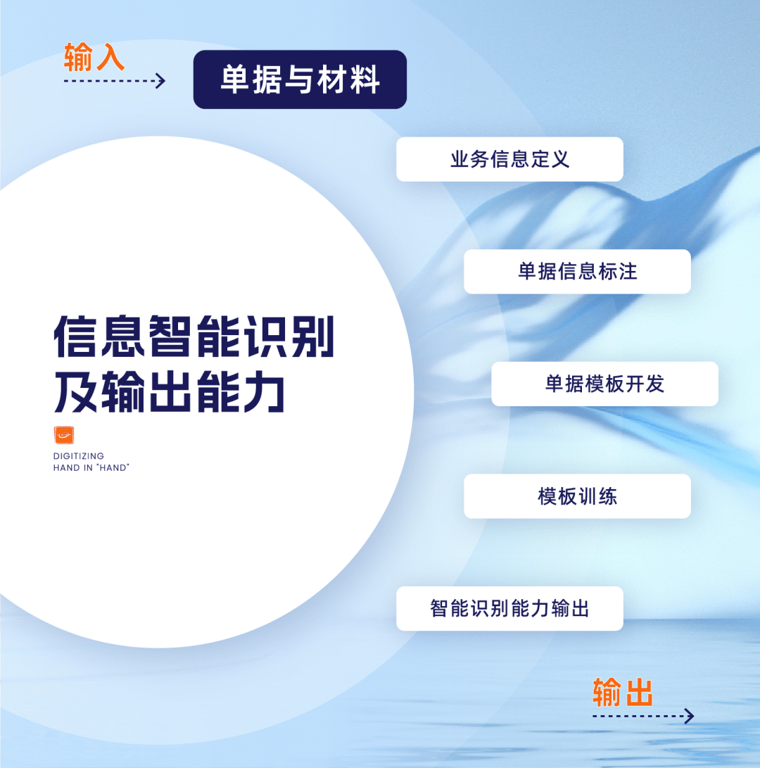信息智能识别及结构化能力实现过程包括对被识别单据和材料中的信息进行业务定义、对单据上对应的信息进行位置或前后文标注、单据和材料智能识别业务模板开发、模板训练和生成结构化数据等。