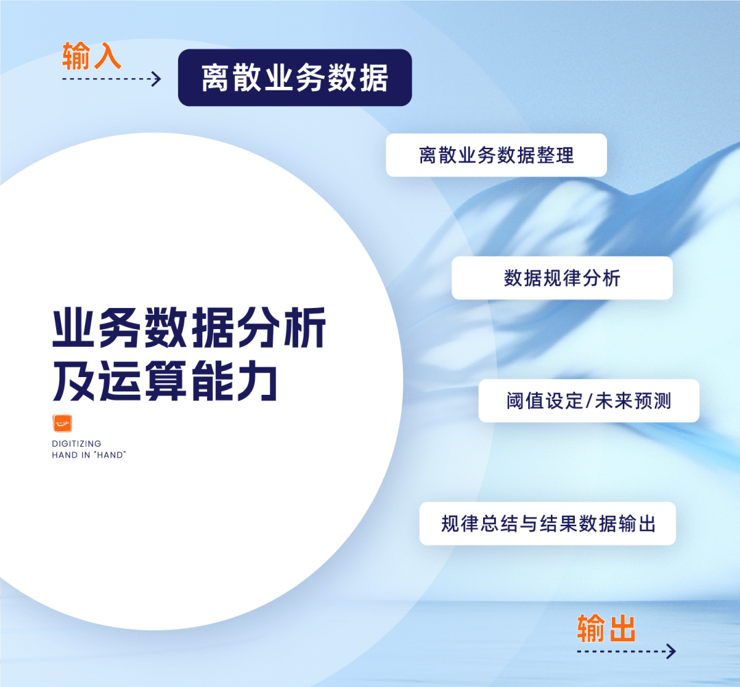 业务数据分析及运算能力的实现过程包括企业业务离散数据整理、运算模型选择、相关分析影响因子调整、阈值设定及结果展示等,形成周期性的规律总结、模型调整、预测产出。业务数据分析及运算能力的典型应用场景有客户画像、企业风险识别与预警、收入预测等。