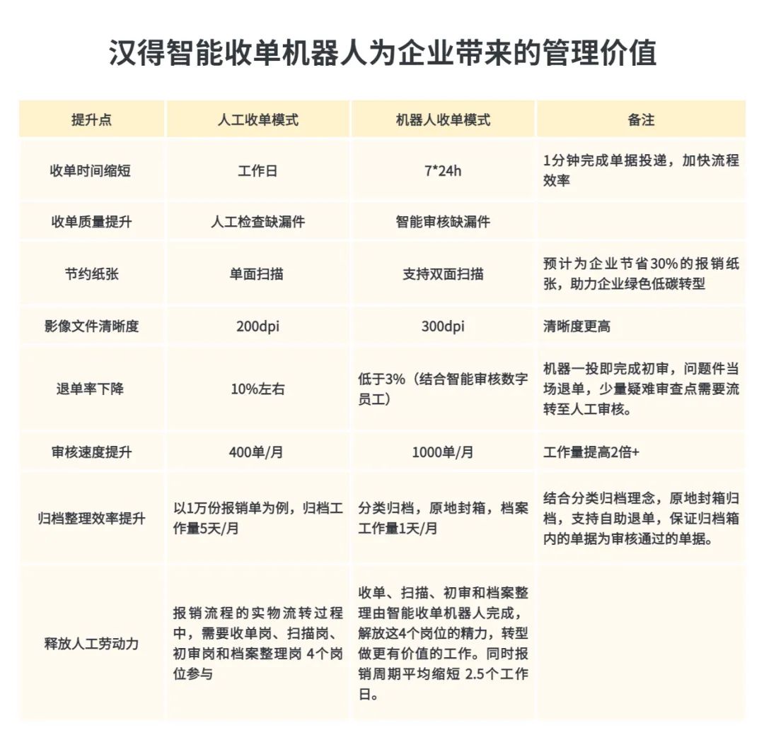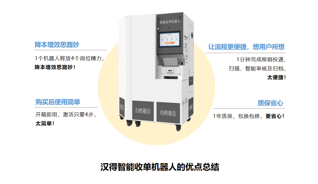 继智能审核数字化员工后,汉得推出企业机器人员工——智能收单机器人。1分钟完成收单、扫描、OCR识别、智能审核、增值税抵扣联独立投递及分类归档6项工作,释放企业收单岗、扫描岗、审核岗及档案整理岗这4个岗位的精力。汉得智能收单机器人7*24h自助投递• 7*24小时机器人值守,报销人随时投递单据,一投即收,系统收单状态更新; • 可按核算组织分类存放报销单;• 支持增值专票抵扣联进行独立投递。300dpi双面扫描•双面扫描仪,一投即采,实时上传报销单电子影像;• 影像文件清晰度300dpi,与传统扫描仪200dpi相比更清晰,更适合作为电子档案件。超级OCR识别可内嵌多渠道OCR超级识别能力,能够对发票、附件进行智能识别,为企业存储更小颗粒度交易数据;为后续智能审核、消费行为分析提供数据基础。可内嵌智能审核数字化员工 • 内嵌智能审核数字化员工,投递时立即进行缺漏件、单据规范性、发票合规性检查,对于问题件立即进行退单; • 智能审核能够降低整体流程退单率、减少人工审核项、释放财务精力。增值税抵扣联独立投递增值税抵扣联可独立投递,较传统混合投递审核后再分离的方式比,减少分离整理工作量。原地封箱、分类归档 • 汉得在业内率先提出分类归档理念并在多家大型企业中实践应用,创新使用收单机完成机器自动分类归档; • 可打印正面索引表,粘贴于归档箱上,满足国家四部委对电子档案归档的法规要求。使用汉得智能收单机,预计可为企业节省30%的报销纸张,助力企业绿色低碳转型!预计企业审核速度提升2倍以上,有效释放企业人力,进一步提升企业管理效率!智能收单机器人出厂前已完成所有调试工作,收货现场开箱激活即用!出厂完成调试 • 机器人生产环节完成软件安装和系统调试; • 机器人入库前完成软硬件测试、系统联调; • 机器人出厂前完成整机验收、系统测试。收货开箱即用 • 现场整机拆封,无硬件安装工作量; • 接通电源,按流程激活设备即可开始作业,无现场调试工作量。降本增效思路妙1个机器人释放4个岗位精力,降本增效思路妙!让流程更便捷,想用户所想1分钟完成报销投递、扫描、智能审核及归档,太便捷!购买后使用简单开箱即用,激活只要4步,够简单!质保省心1年质保,包换包修,更省心!欢迎联系我们了解更多功能