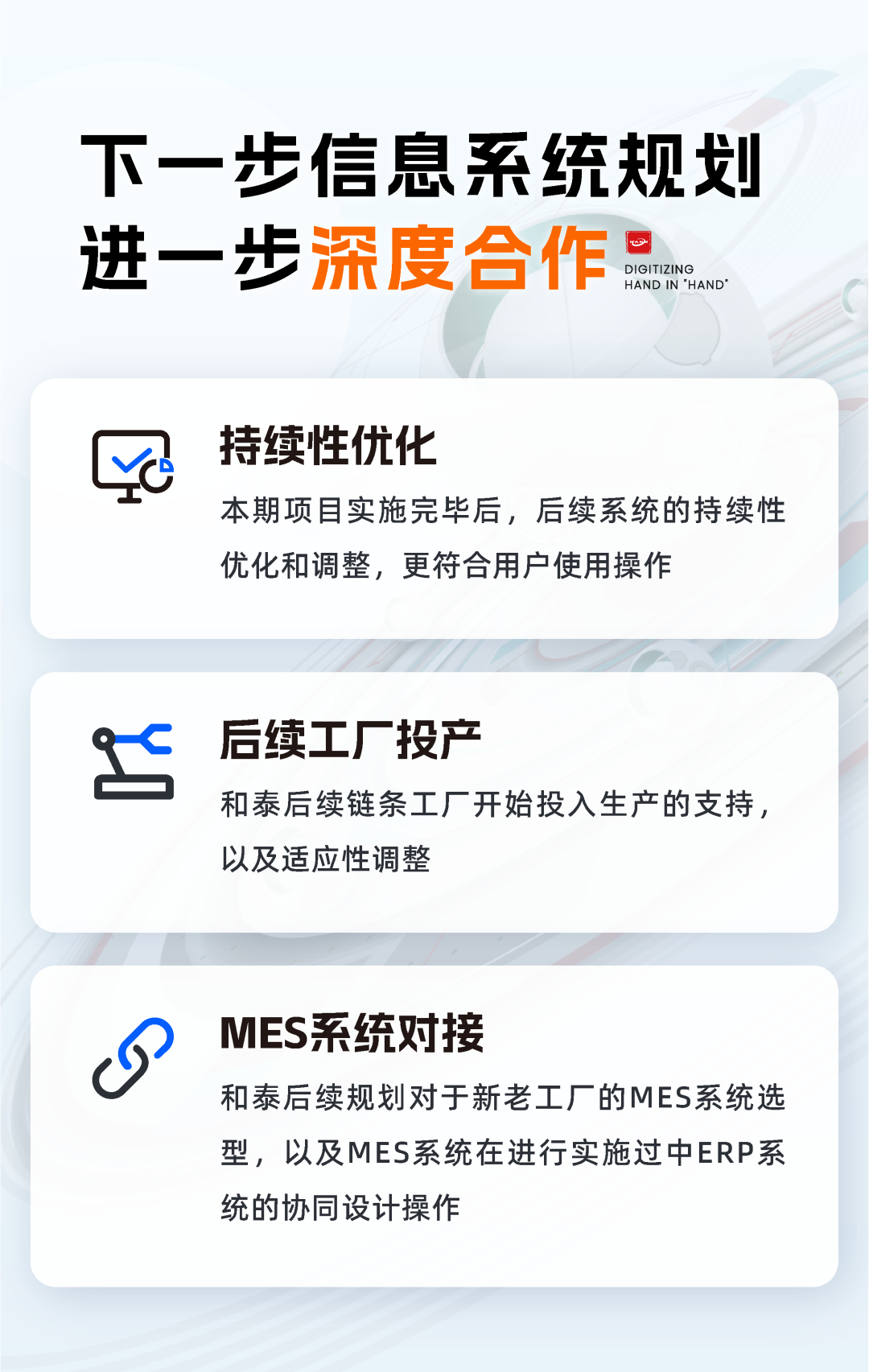 “通过此次SAP的实施,基本实现本次项目期初确定的重点项,通过此次一体化信息系统建设项目形成和泰机电产品业态。我们希望系统既要具备实现流程标准化,业务、财务一体化,业务闭环的能力,并且要能支撑到企业对于营运数据和智能数据的透明化管理,从而实现实际成本的成本核算管理,仓库收发料的条码化管理,便捷即时的生产工序报工管理,并能通过ERP系统实现粗排产管理。提质增效,实现订单的敏捷交付,为我们企业提供管理的提效。”