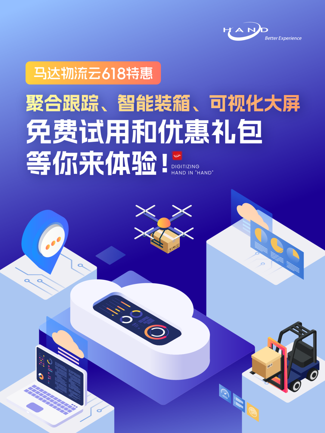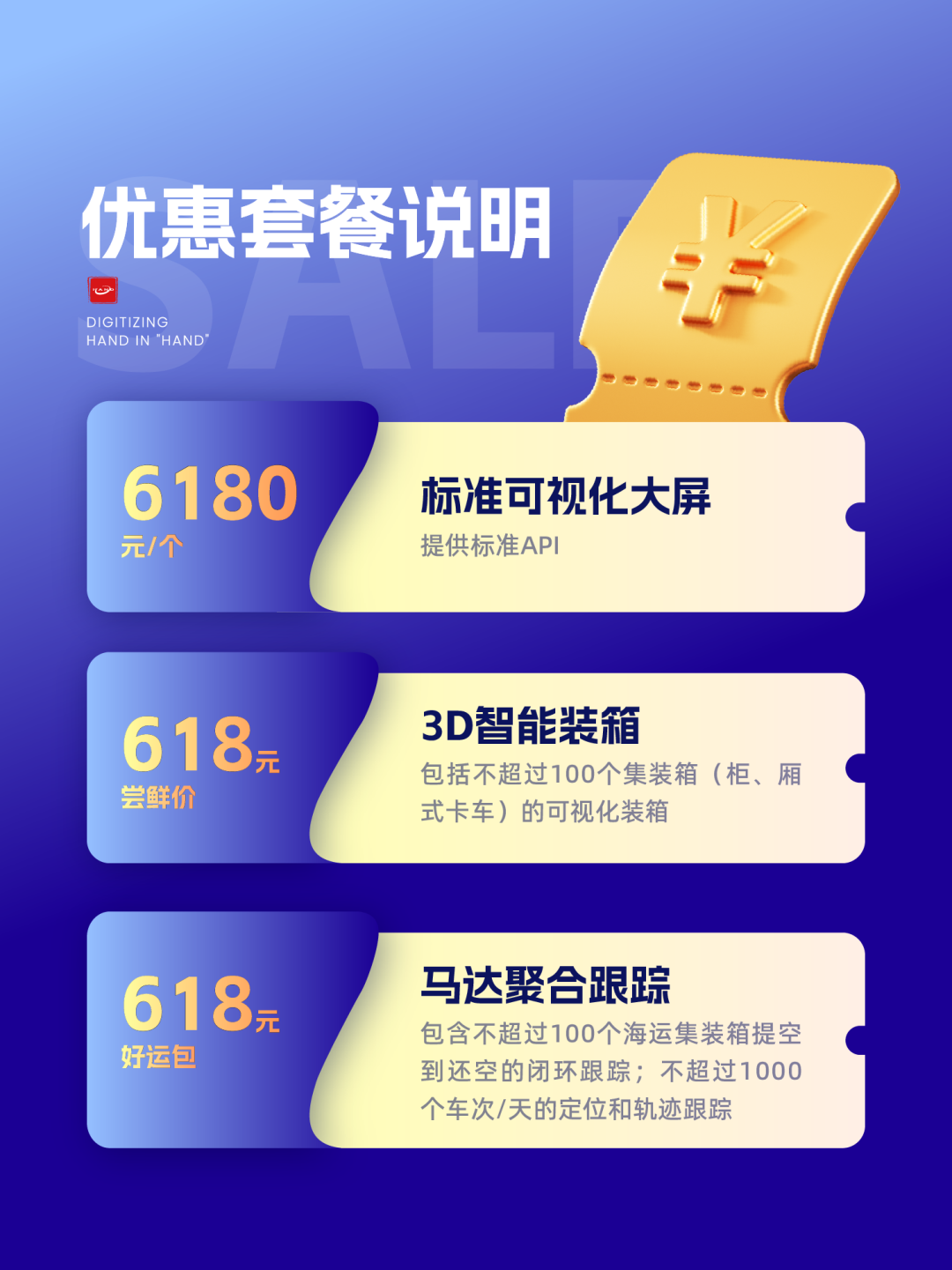 在本次618特惠活动中,您可免费试用我们的聚合跟踪、智能装箱和可视化大屏服务,同时还有精心准备的优惠礼包等您来领取。
