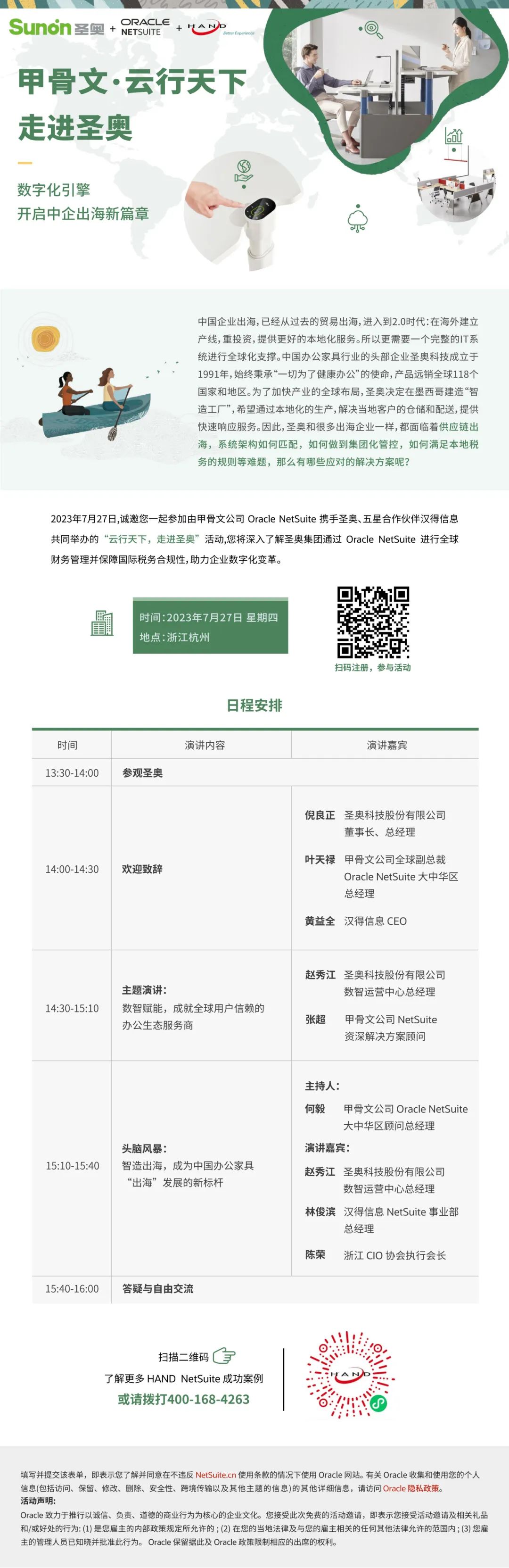 中国企业出海,已经从过去的贸易出海,进入到2.0时代,在海外建立产线、重投资,提供更好的本地化服务,所以更需要一个完整的IT系统进行全球化支撑。 中国办公家具行业的头部企业圣奥科技成立于1991年,始终秉承“一切为了健康办公”的使命,产品远销全球118个国家和地区。为了加快产业的全球布局,圣奥决定在墨西哥建造智造工厂,希望通过本地化的生产,解决当地客户的仓储和配送,提供快速响应服务。 因此,圣奥和很多出海企业一样,都面临着供应链出海,系统架构如何匹配,如何做到集团化管控,如何满足本地税务的规则等难题,那么有哪些应对的解决方案呢? 欢迎扫描小程序二维码 提前了解“圣奥科技” 加“数”出海之路 2023年7月27日,诚邀您现场参加由汉得信息与甲骨文公司 Oracle NetSuite携手圣奥集团,共同举办的“云行天下,走进圣奥”活动,您将深入了解圣奥集团通过 Oracle NetSuite 进行全球财务管理并保障国际税务合规性,助力企业数字化变革。 欢迎扫描图上二维码注册报名 与我们一起“走进圣奥” 开启中企出海新篇章