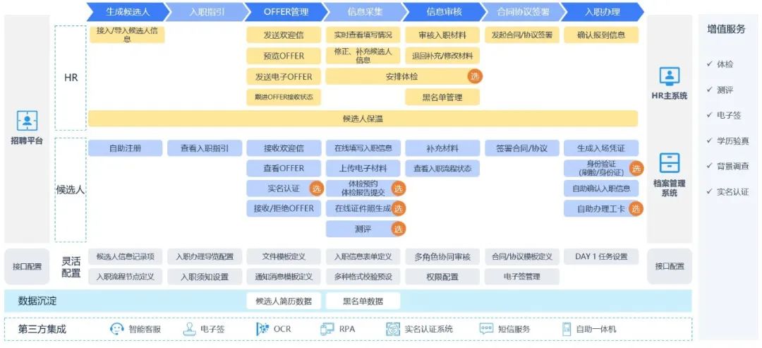 数字化时代,员工注重工作体验,看重雇主品牌,期望真正被关心、被看到。入职环节是员工开启与企业旅程的第一站,若在入职环节,员工体验到的是流程阻塞、缺乏规范统一管理、缺少官方沟通门户、甚至需要员工多次、多部门往返的情况,则雇主丧失了与员工第一个接触环节开启美好体验的机会。