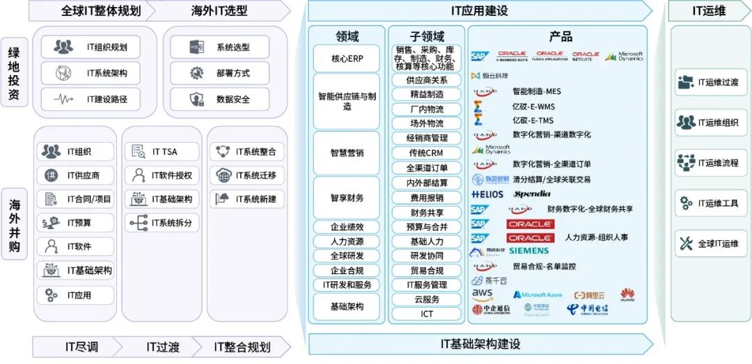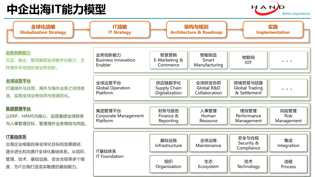 海外绿地投资趋势加强 在中企出海中占比增加 绿地投资是全球跨国公司在海外开拓业务的主要方式之一。根据联合国贸发会议(UNCTAD)《2022世界投资报告》,2021年度,绿地投资占全球所有外国直接投资(FDI)的比重为25%。同时,在全球总体FDI大幅增长的趋势下,受经济不确定性增加影响,全球FDI总体表现出风险厌恶与流动性偏好,绿地投资项目增长反弹明显弱于并购与金融投资项目。 然而,中国企业海外投资的方式选择展现出不同趋势。2021年中企海外绿地投资(金额和数量)在总体出海规模中占比显著增长。形成中国与全球绿地投资趋势差异的主要影响因素有: 带来更多增量效益 受大环境影响,中企海外并购项目在东道国(尤其是发达经济体市场)受到越来越多的限制或阻碍。而绿地投资相对于并购,会为东道国带来更多增量效益,更容易获得东道国的批准。 高效输出自身竞争力优势 近年来中企海外投资增量更多集中于新能源汽车、清洁能源、高科技制造、互联网等行业。而中国企业在这些领域经过长期投入发展,在国内市场积累了国际领先的技术、管理、供应链优势。因此在上述行业企业出海过程中,自然更倾向于通过绿地投资方式更高效输出自身竞争力优势,来参与海外市场竞争。 发掘并响应海外消费地市场需求 中企出海表现出明显的“靠近消费地”的趋势。顺应该趋势,绿地投资可以让中企更快速高效地发掘并响应海外消费地市场需求,更直接地参与甚至主导国海外市场塑造,在国际产业链和供应链体系中占据有利位置。 机遇与挑战 IT组织准备好了吗 随着中企出海向全球化转型,企业IT组织必然地扮演更重要的角色、承担更重要的任务,同时面对前所未有的巨大挑战和全新课题。相较于海外并购,海外绿地投资从0到1 的建设过程,给IT系统建设提供了更高的自由度,但同时也在全球系统平台规划建设上提出了更高的要求。 汉得通过对出海客户与项目的分析,从出海企业IT组织的视角,针对海外绿地投资项目,对全球化(或海外)IT系统建设进行普遍性的SWOT分析: 作为企业从国内走向全球的重要力量,出海企业IT组织面对巨大的挑战,同时也获得转型与进化的机遇。高效整合全球内外部资源,制定合理的出海计划,准确识别并管理海外风险,是所有全球化转型IT组织的重要课题。 绿地投资项目系统建设 如何逐步推进 典型的海外绿地投资项目的IT系统建设,通常会经历三个主要过程:规划准备(集团总部)、初期部署(海外项目)、发展进化(全球)。 规划准备(集团总部) 如之前所述,企业选择绿地投资的方式来开展海外业务,一个非常重要的目标就是要对海外业务实现更直接的全球化管理与运营。因此对于企业IT组织来说,必需提前规划支撑全球化管理目标的海外IT系统架构与能力,以避免实际海外业务绿地建设过程中的低效甚至无效投入。 汉得根据自身经验,归纳提炼了中企出海IT能力模型,并建议企业结合自身战略目标、资源能力、出海环境,从IT基础体系、集团管理平台、全球运营平台、业务创新能力4个层面来规划海外IT系统。 初期部署(海外项目) 对于单个绿地投资项目而言,按计划早日使海外业务投入运营、实现业务目标和投资回报是优先级最高的任务。因此大部分绿地投资项目的IT系统建设,在初期部署过程中会更聚焦在IT基础体系与集团管理平台在海外当地的落地。 初期部署的具体系统范围,会因企业自身IT系统全球化完善与成熟程度,以及海外系统落地经验而不同,但通常会包括IT基础设施以及ERP、HRMS、OA、MES/PCS等运营必需的系统。其中,最为重要且不可或缺的是ERP。ERP不仅要满足记账与报告的基础需求,更需要作为重要载体来落实集团对海外业务的管理目标。另外非常重要的是,本地合规需求也需要在Day1前被正确识别并妥善应对。 发展进化(全球) 海外绿地项目顺利投入运营后,IT系统将继续遵循全球化系统架构与规划不断发展进化。这一过程会在几个维度分别展开: 集团管理落实 以初期部署的ERP等管理系统为核心,逐步推广和完善集团管理平台在海外当地的落地,实现集团对绿地投资项目的管理目标。 全球业务协同 根据海外业务单位在全球化战略中所承担的任务,将业务协同平台推广到海外当地,使海外业务尽快融入全球化业务体系,实现高效率的全球业务协同。 本地生态互联 根据本地的产业生态环境,逐步完善与海外当地上下游企业和生态伙伴的互联互通,在提升运营效益的同时,帮助企业更好地融入本地商业与经济环境。 海外业务创新 利用企业在国内或其它海外业务中积累的数字化经验,依托于集团管理平台和全球业务系统平台的基础能力支持,赋能海外业务创新。 汉得出海服务 全方位支持中企海外绿地投资 汉得国际化业务开展近二十年,在21世纪的前十年我们主要是帮助欧美日本等大型外资企业在中国以及亚洲区域的IT系统推进。随着中国经济的长足发展,在21世纪的第二个十年,我们更多帮助中国企业走向海外。汉得的海外布局也是跟随大量优秀中企客户的海外业务拓展而走向日本、东南亚、美国、欧洲等不同区域。 在人员储备上,汉得从2010年逐步建立具备国际化视野、熟练的语言沟通、以及了解在全球背景下推进IT项目的团队,同时在海外各个区域建立熟悉当地法规与文化的本地专业团队,海外与中国团队深度合作,为客户