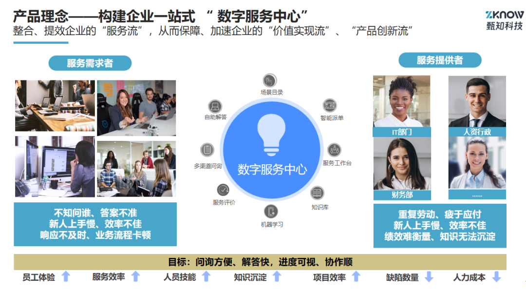 甄知科技(ZKNOW),由业界知名的企业数字化综合服务商汉得信息孵化而成,致力于构建企业一站式“数字服务中心”,聚焦解决企业软件研发、项目管理、系统运维、员工服务的方法、流程、协同、能力、效率等方面的综合需求和管理挑战。