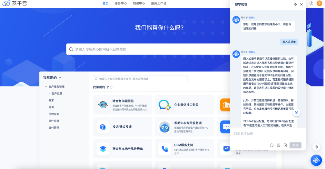 智能小助手24小时在线问答,推送对应相关知识、问题解决方案和个人相关的单据给到用户,同时也支持访问后台在线客服,进行1V1人工服务。
