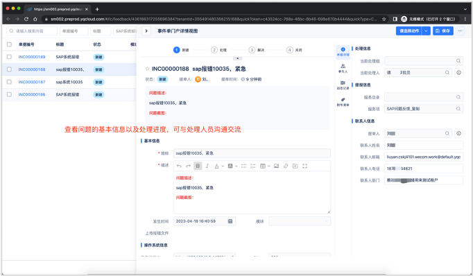 用户与处理人可针对单据及时沟通,提升单据处理效率,沟通过程可记录、可追溯,并集成微信端接收单据更新信息,用户可通过公众号接收进度反馈消息,及时了解问题处理进展。
