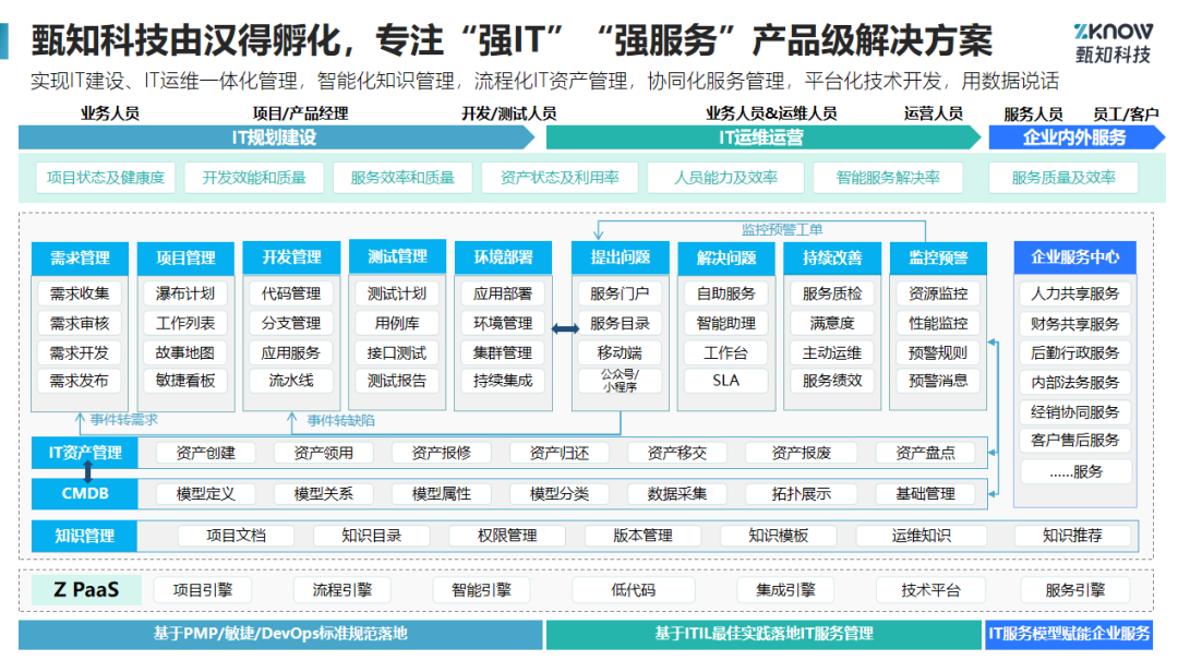 “强IT”表现在助力企业实现IT建设运维一体化,IT资产管理流程化,IT技术开发平台化,知识管理智能化;“强服务”表现在助力企业搭建数字化员工服务中心,数字化客户服务中心。甄知科技,始终致力于将“强IT”、“强服务”理念、方法、实践沉淀为数字化产品,推动企业数字化建设。