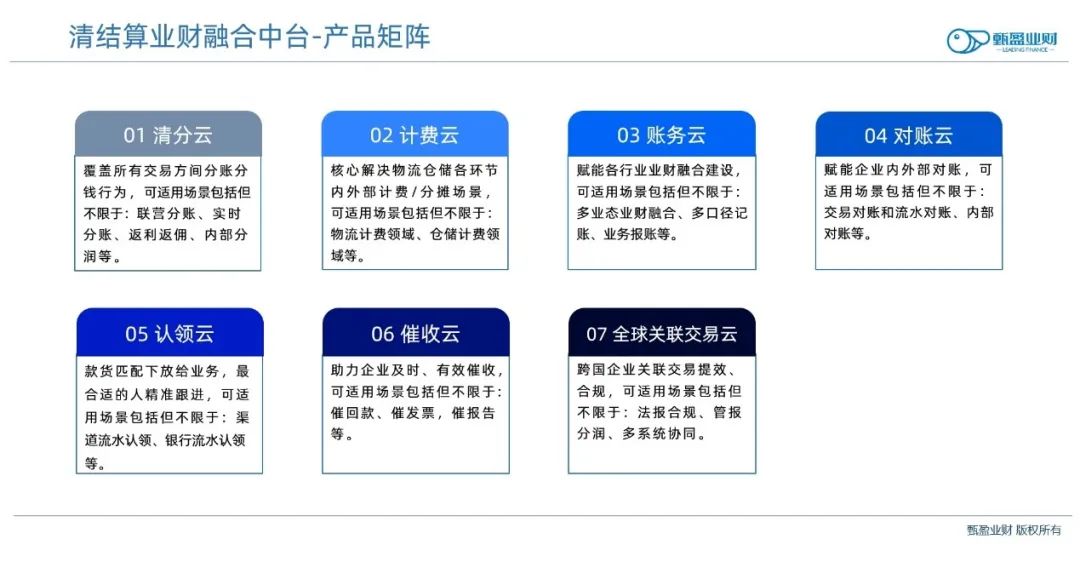 致力于为企业业财融合提供多层次的解决方案,自主产品清结算业财融合中台,基于多年行业实践积累,结合互联网技术手段,自主研发构建,覆盖业务数据集成、高效灵活计费、统一清分结算、资金勾稽核对、对账催收、财务会计引擎、全球关联交易、大数据分析处理等功能,形成计费云、清分云、对账云、催收云、认领云、账务云、关联交易云等云产品系列,结合产品团队丰富的实践经验,能够协助企业进行业财信息的一体化整合管理,提升企业绩效和盈利能力。