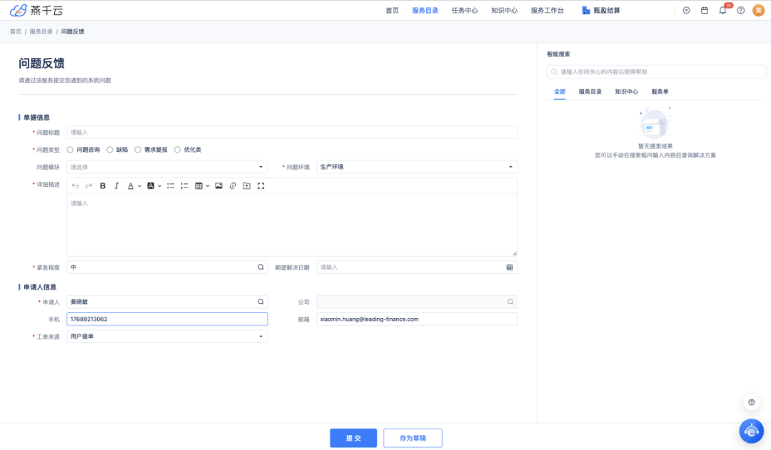集成燕千云后,企业无需跨系统,可直接在甄盈业财平台实现免登录进行问题反馈。系统能自动获取页面关键数据,报错信息、账号、手机号、邮箱等数据,自动填写至提单页面,根据用户的问题描述,还可智能推荐最佳解决方案,减少重复问题提交,推动企业降本增效。