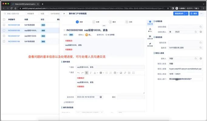 集成燕千云后,企业无需跨系统,可直接在O2平台查看提交过的工单,点击编码即可进入工单详情查看具体工单,便于跨系统响应和及时反馈。