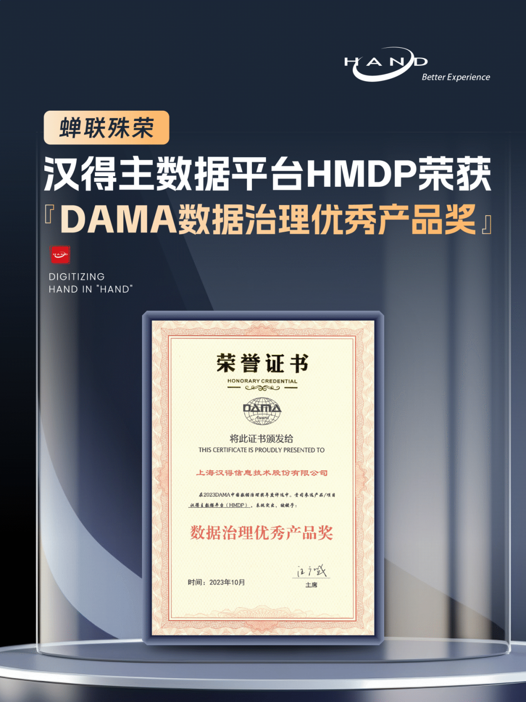 汉得主数据平台HMDP荣获“2023DAMA中国数据治理优秀产品奖”