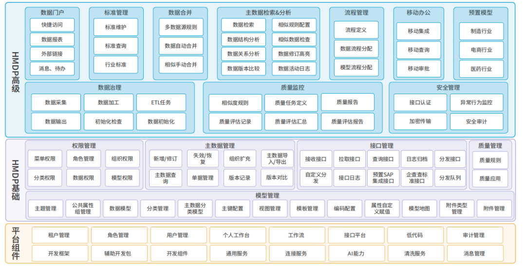 汉得主数据平台 HMDP 是基于HZERO微服务架构平台,由多个应用组件通力构成,是一款面向企业灵活的、全面的、智能的综合主数据管理平台。