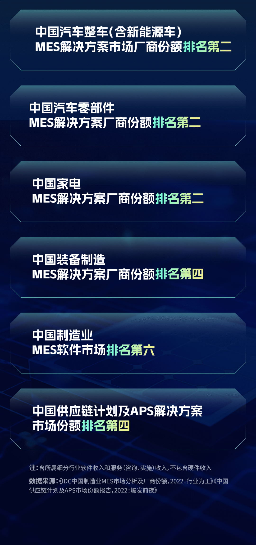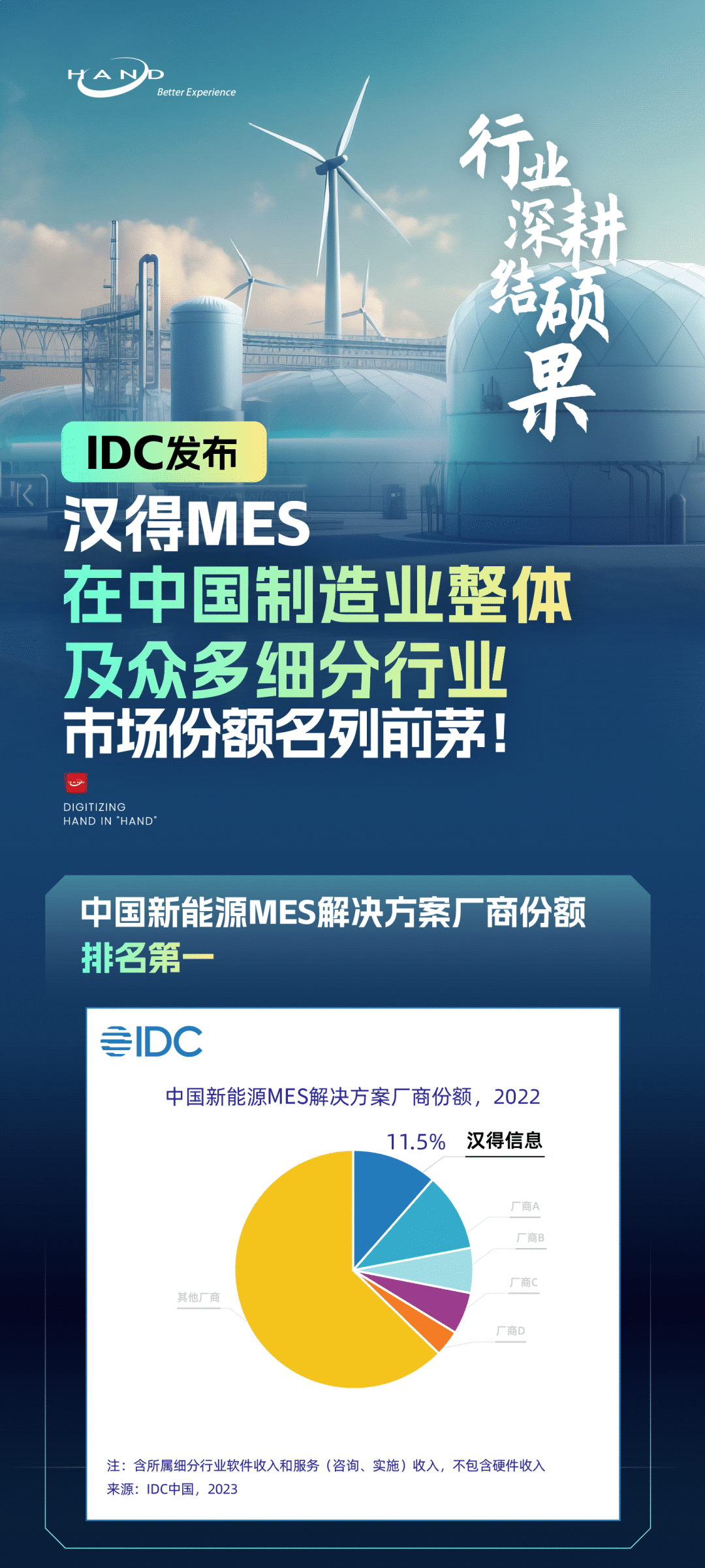 近日,IDC 多个重磅市场份额分析报告发布。报告显示,汉得MES在中国制造业整体及新能源/汽车整车/零部件/装备/家电等众多细分行业市场份额名列前茅!据《IDC中国制造业MES市场分析及厂商份额,2022:行业为王》数据显示,2022年中国制造执行系统(MES)软件市场(不含咨询、实施服务收入)总规模达到 46.2亿元人民币,年增长率为 21.1%,仍保持平稳快速增长。同时,2022年中国制造执行系统(MES)解决方案总市场(含软件和服务)份额达到 125.4 亿元人民币。据《中国供应链计划及APS市场份额报告,2022:爆发前夜》数据显示,2022 年中国供应链计划及 APS 解决方案总市场份额达到13.6亿元人民币,年增长率为 34.05%,与其他工业软件相比有较高的增速。主要影响因素是中国市场供应链计划及APS需求持续释放,同时市场供给的数量和质量双双提升,此外,较低的渗透率和市场基数也是高增速的前提条件。IDC预测,该市场未来几年仍会保持较高增长速度。汉得信息作为中国工业管理软件的领军企业之一,持续为中国制造业的高质量发展贡献数字化力量。多年来,已经为全球数百家工厂提供以供应链计划、APS以及制造执行系统为核心的数字工厂解决方案,帮助客户在复杂的市场环境中,持续降本增效,提升产品品质,构建核心竞争力。行业深耕助力企业高速发展行业深耕是汉得发展数字化服务能力的重要战略,经过多年的积累,汉得在新能源、车生态和泛家居等领域形成自身独特优势,赢得了良好的口碑。随着近几年中国电动汽车、锂电、光伏等“新三样”产业的高景气,在“信创”大背景下,汉得依托在该领域的先发优势、领先的技术平台以及完整的自主产品,与大量行业头部企业,建立了长期、稳定、深入的合作关系,形成了新能源行业明显的领先优势。目前,汉得已实现新能源车、新能源核心零部件、动力电池、锂电池正负极材料、矿石“采选冶”全产业链案例覆盖。解决方案涵盖产销计划、质量体系搭建、生产过程管控、成本管理、自动化产线集成以及企业的数据应用等新能源行业核心业务领域。在发展行业产品套件的过程中,我们十分重视关键技术的积累,实践证明,在动力电池生产领域汉得的自主产品能够支撑超高节拍产线的稳定运行,为客户制造能力的持续提升提供可靠保障。帮助客户获得成功是汉得不变的使命。我们帮助某头部动力电池企业,在不到3年的时间,搭建起行业领先的数字化体系,支持该企业近10倍的产能扩张;我们帮助某头部锂电池企业,通过3个月的时间,快速搭建起多条高标准的生产线,达到顶尖车企的产线审核要求。整车和汽车零部件是制造业数字化的主要市场,在新能源车渗透率快速提升的趋势下,该领域的数字化投入也在快速增长。汉得一直以来非常重视在整车和汽车零部件领域的发展。近年来,在传统汽车零部件基础上,我们已经将服务能力迅速扩展至车载雷达、传感器、电控以及电机等新兴汽配领域,全面夯实在新能源车零部件方面的竞争力,为迎接该领域进一步快速发展做好了充分准备。家居行业是汉得传统的优势领域,我们的服务能力涵盖板式定制、成品家具、门窗、照明以及家电等方方面面,帮助大量知名品牌构建从门店到制造的前后一体的数字化运营平台,有效提升品牌企业面向消费者的服务质量和服务效率,为客户企业的强品牌战略提供有力的支持。IDC报告显示,汉得在家电这一细分行业的市场份额也名列前茅。当前在国家一系列促进消费的政策的推动下,家居行业正迎来新一轮的发展机遇,我们将与企业一同努力,为消费者提供更好体验。强化供应链提升企业核心竞争力IDC报告显示,在日益具有颠覆性的市场中,个性化的需求和不稳定的供给为供应链带来了新的挑战,使用供应链计划及APS(先进生产排程)成为众多制造和零售企业数字化的优先选择。IDC调研数据显示,77%的中国企业将供应链计划和APS列入未来两年数字化投资的主要建设方向之一。基于以订单为核心的运营管理理念,汉得供应链计划以及APS板块发展出了独具特色的产品和解决方案,通过构建贯通产销计划、供应链计划、MRP、车间排程和物流执行的数字化订单运营体系,帮助客户企业实现了订单透明、计划优化和成本精细化管控,探索出了一条可落地的韧性供应链管理方法。同时,结合汉得深厚的生产管理方案能力以及汉得生态企业的产品服务能力,我们有效解决“生产计划与制造执行的闭环”、“供应链计划与供应链执行闭环”等长期困扰制造企业的痛点,为提升企业的核心竞争力贡献汉得力量。自主信创 智能引领产品创新作为国内工业管理软件的领军企业之一,汉得在自主产品发展上不断投入,拥有完全自主知识产权的MOM系统——汉得协同制造平台(Hand Collaborative Manufacturing suits,HCMs),能够为制造企业的数字化工厂建设提供一站式的服务能力。基于汉得融合技术平台HZERO,HCMs能够与汉得生态的成熟套件和丰富解决方案快速集成,支撑企业打造端到端一体化的数字化运营平台。汉得在产品研发方面一直紧跟技术前沿,让蓬勃发展的AI能力赋能制造业,是我们产品发展的重要使命。点击观看现场演示视频智能车间助手原本一步步复杂繁琐的系统流程,在引入智能车间助手后,能够实现56%的流程节点缩减,100%自然语言交互,多个应用缩减为1个应用,实现更准的业务决策、更高的